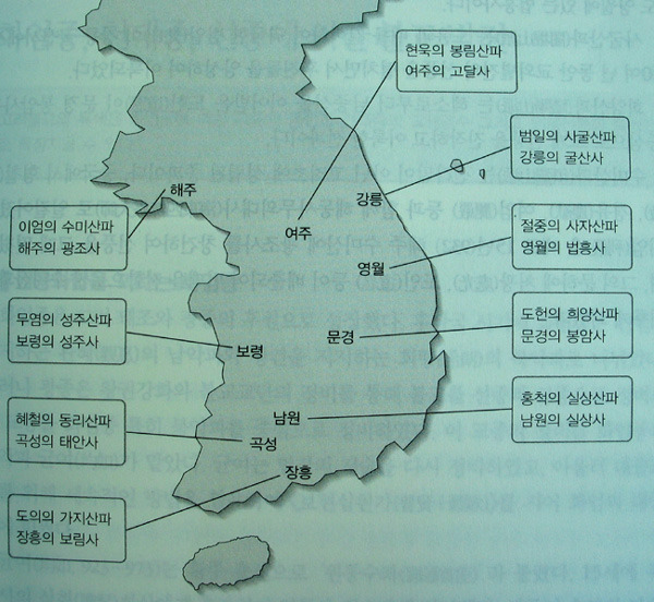 사굴산문(강릉 굴산사-범일), 동리산문(곡성 태안사-혜철), 성주산문(보령 성주사-무염),