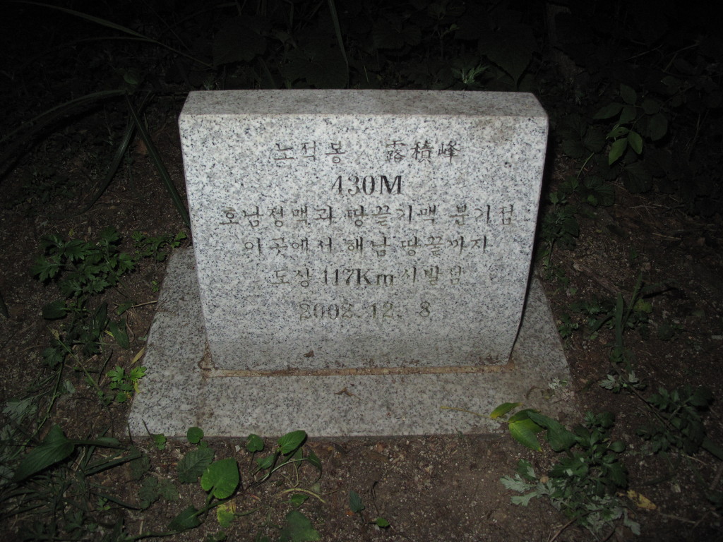 땅끝지맥 방향에는 대리석에 "노적봉 430m 호남정맥과 땅끝기맥분기점 이곳에서