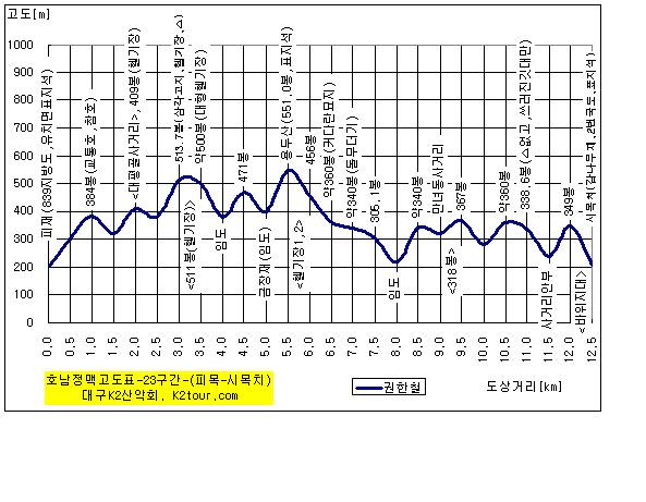 오늘 산행구간의 지도와 고도표