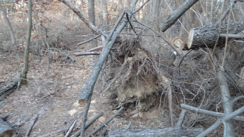 물래산에서 우측으로 꺽어져 급한 내림길을 내려오니 쓰러진 나무들로