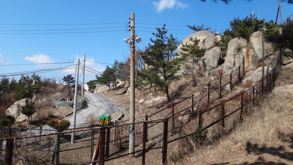 예비군 부대 담장을 끼고 올라가다가 철조망을 넘어 훈련장 안으로 들어간다.