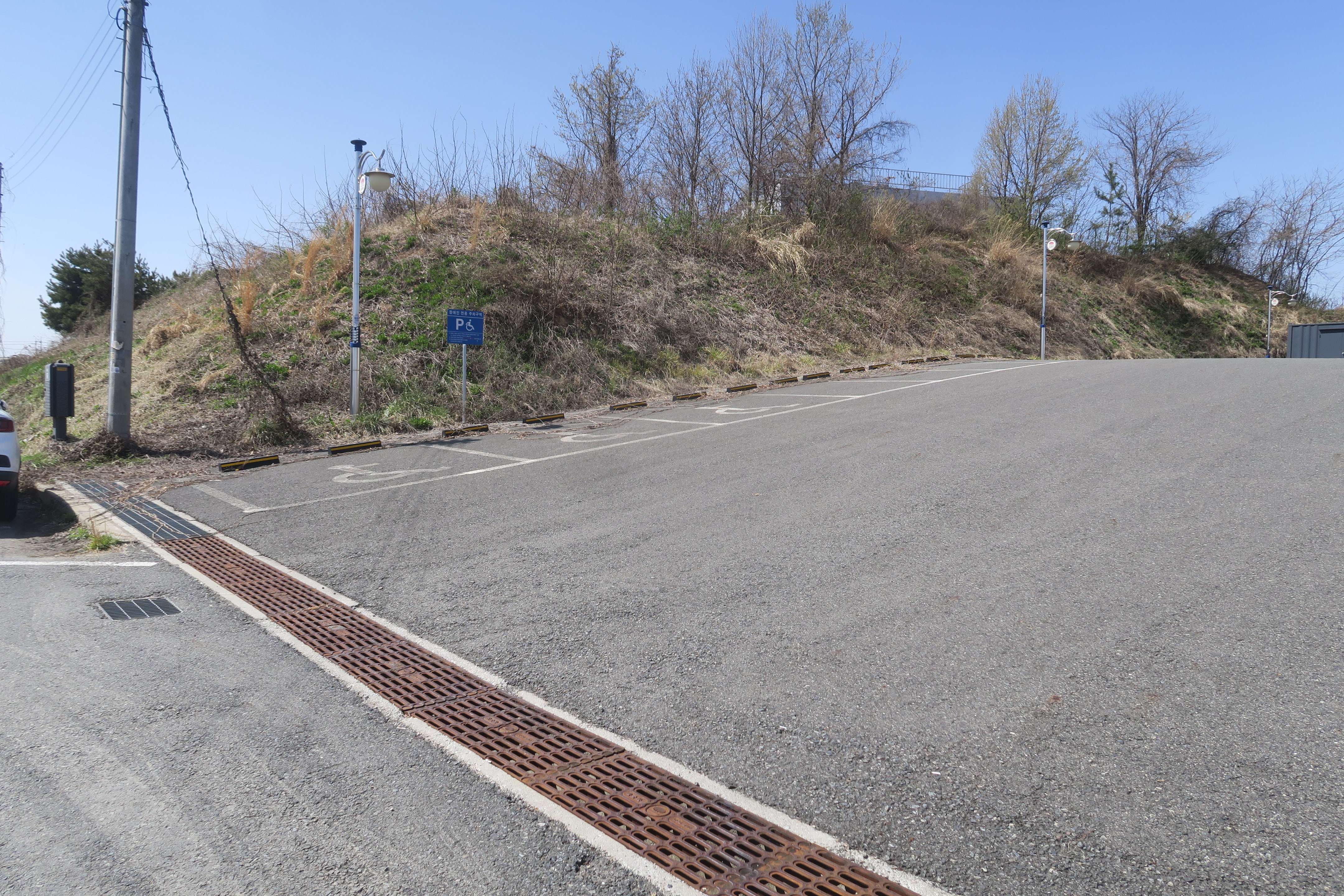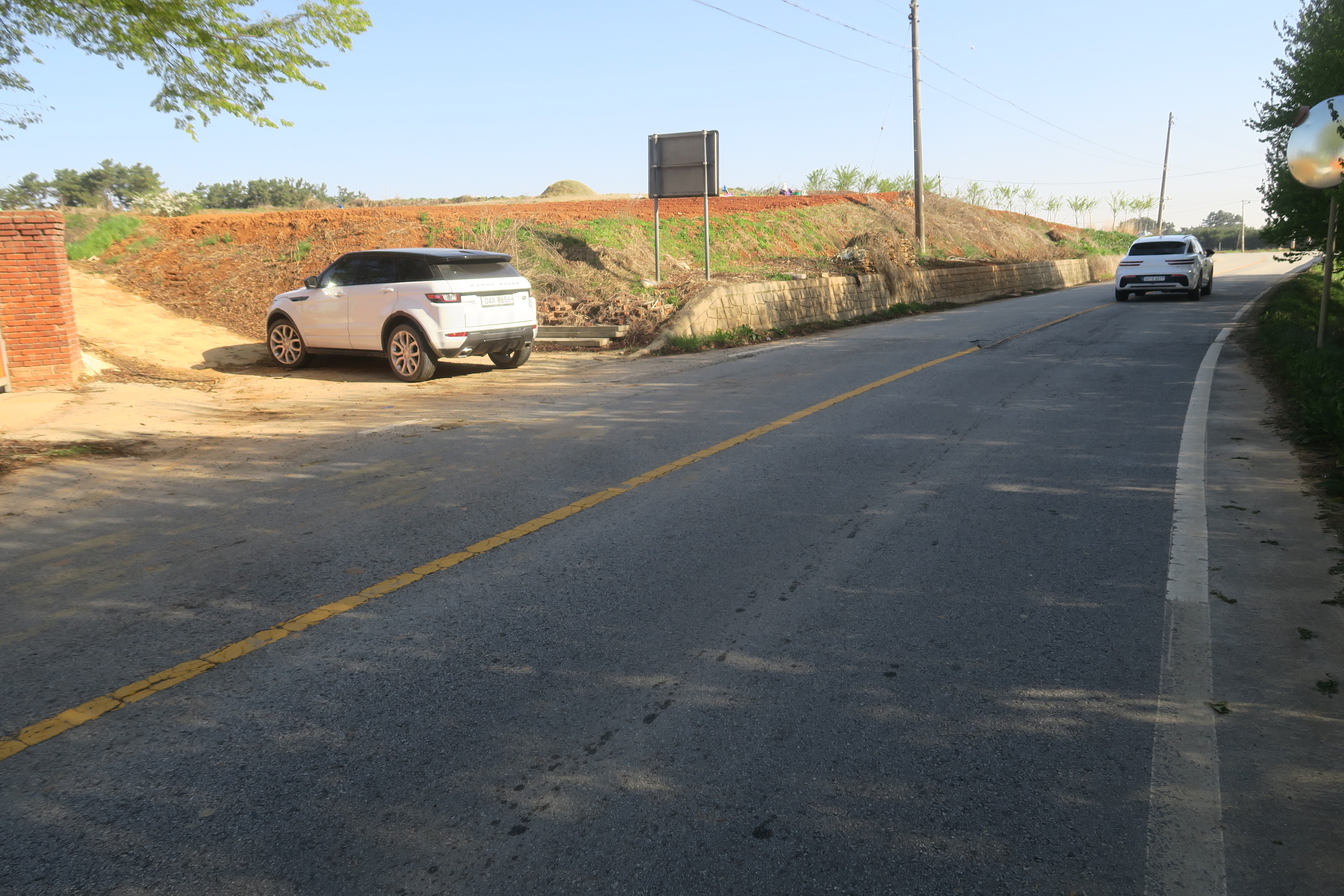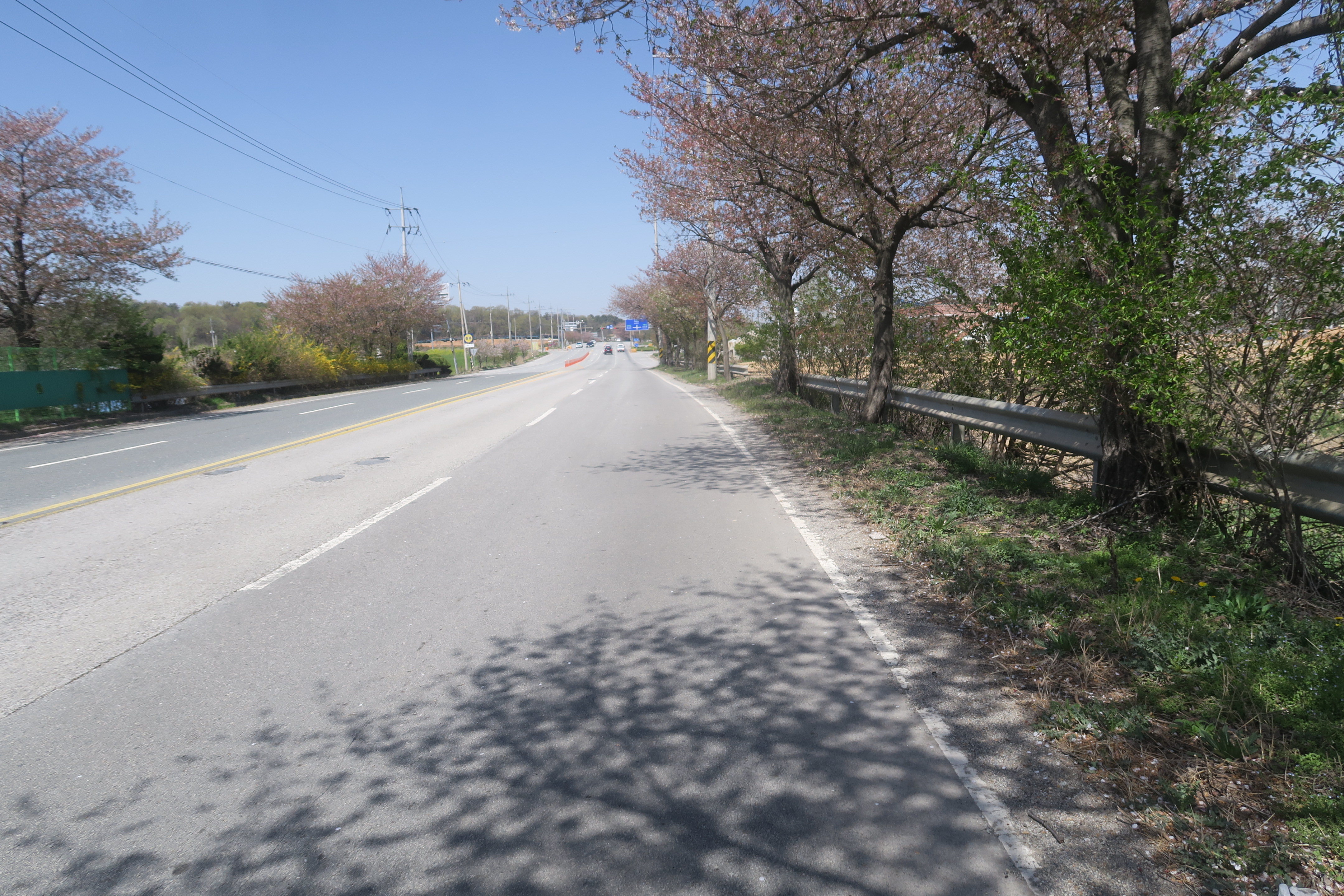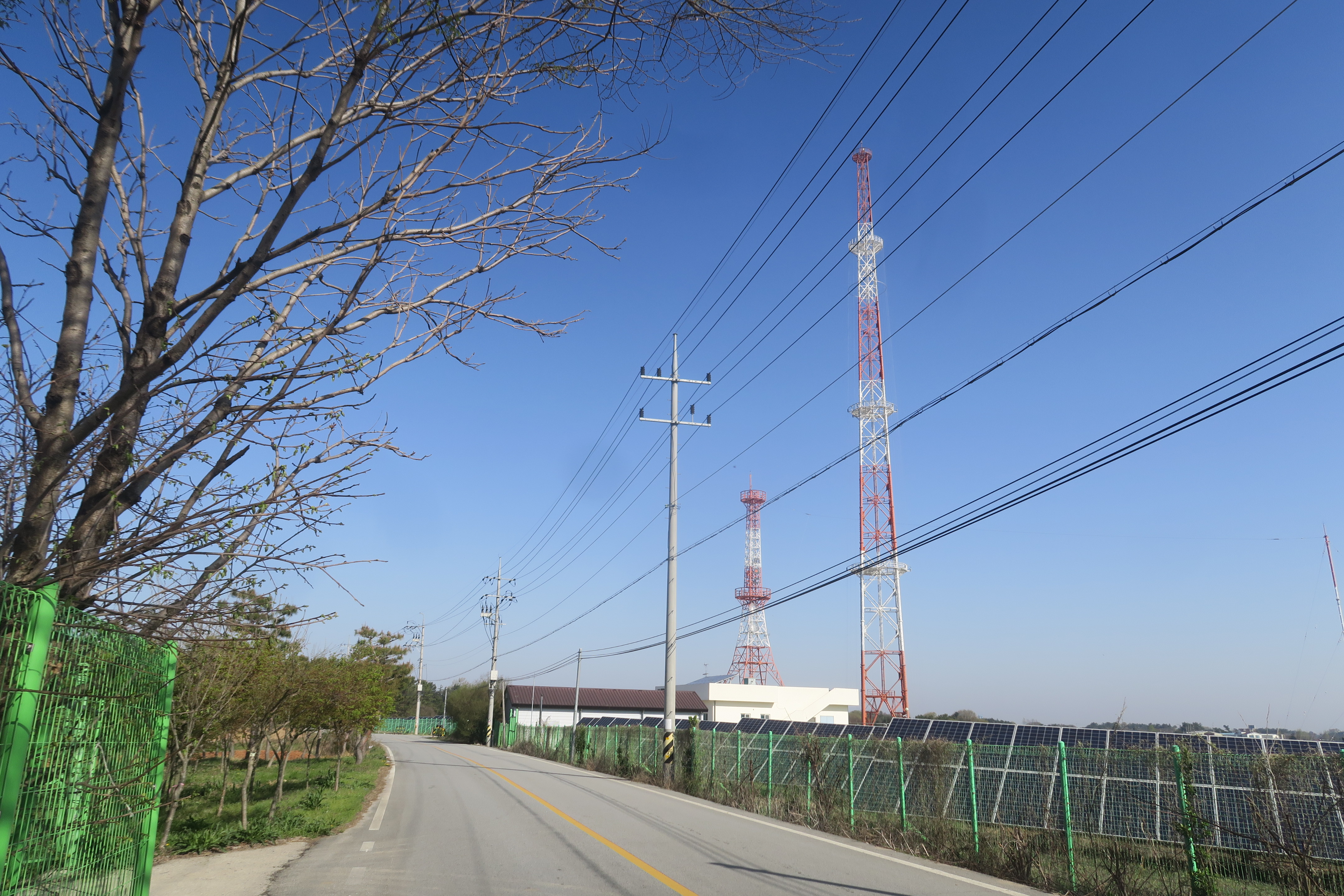 도로 좌측 아래의 구릉에 태양광 판넬이 있다.