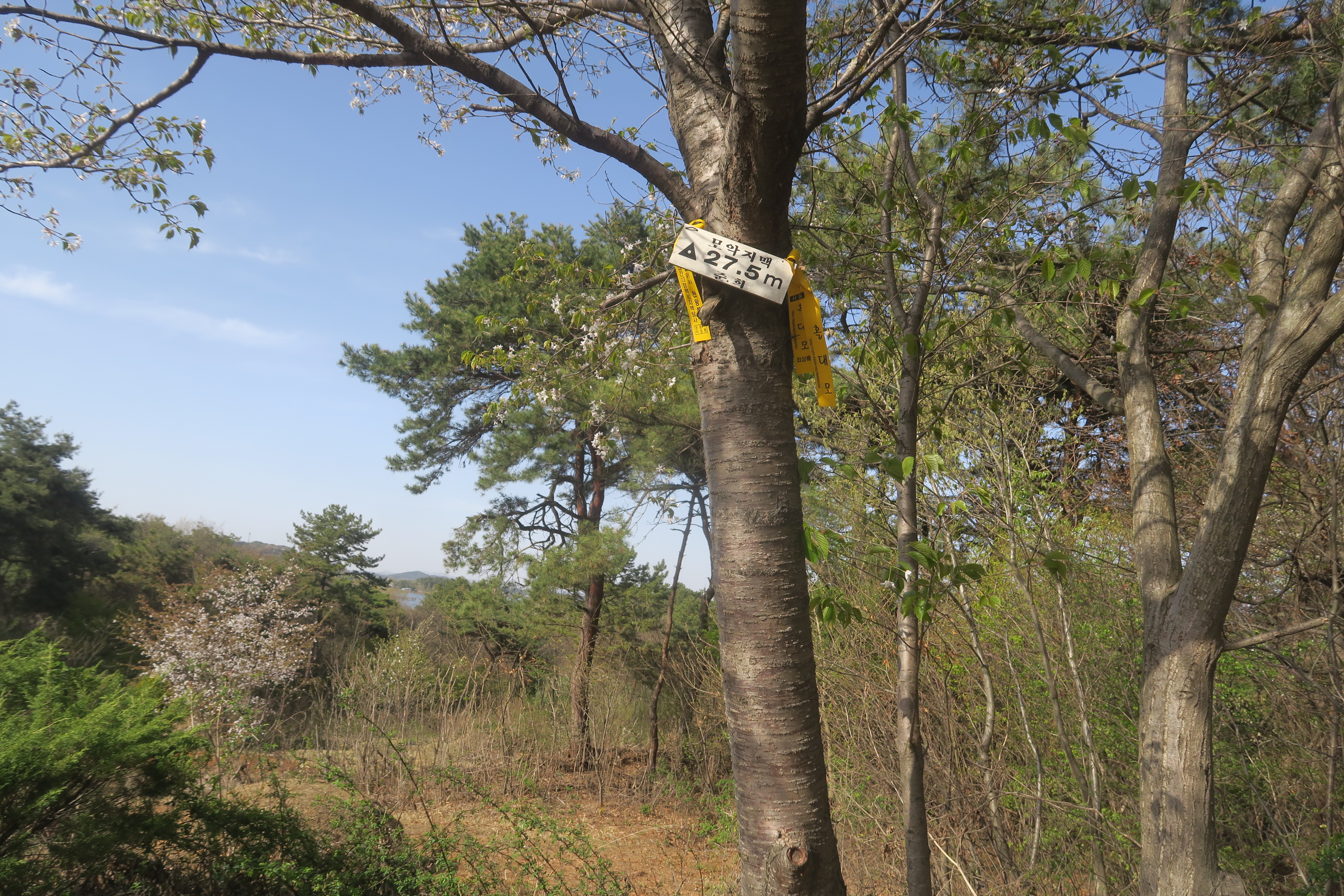 등로가 없는 곳으로 치고 올라서니 삼각점이 있는 27.5m봉이 나온다