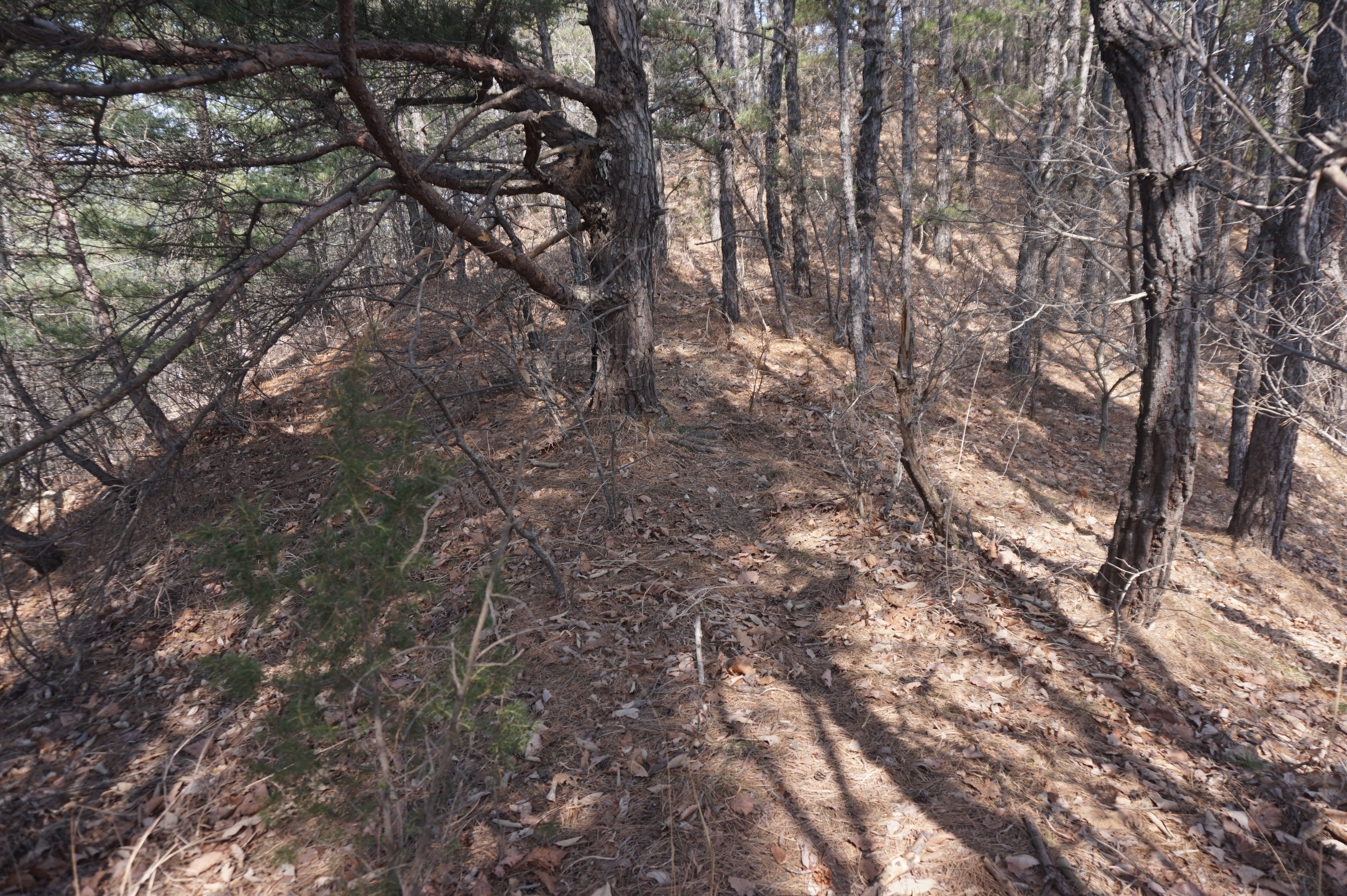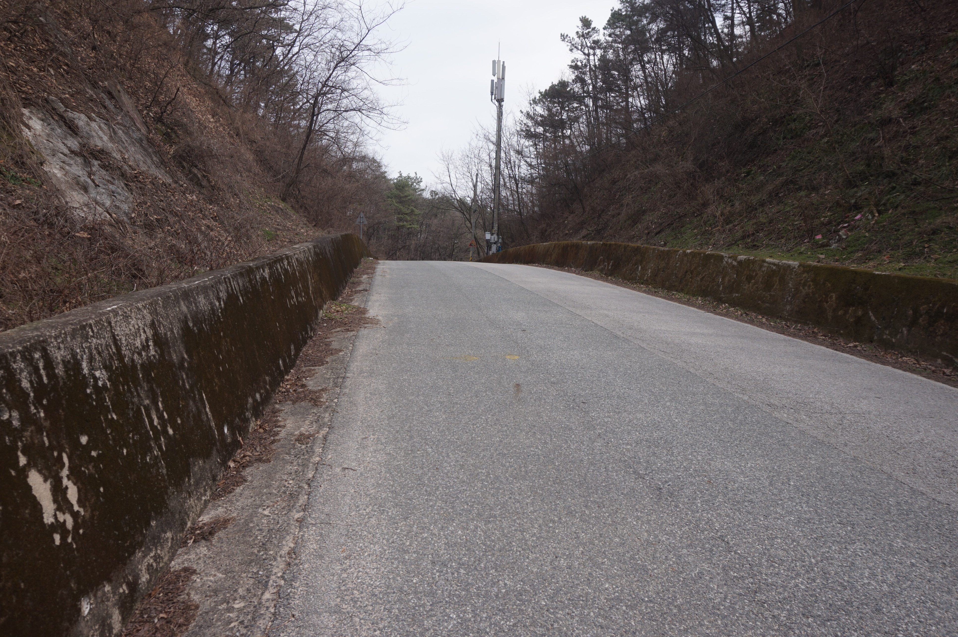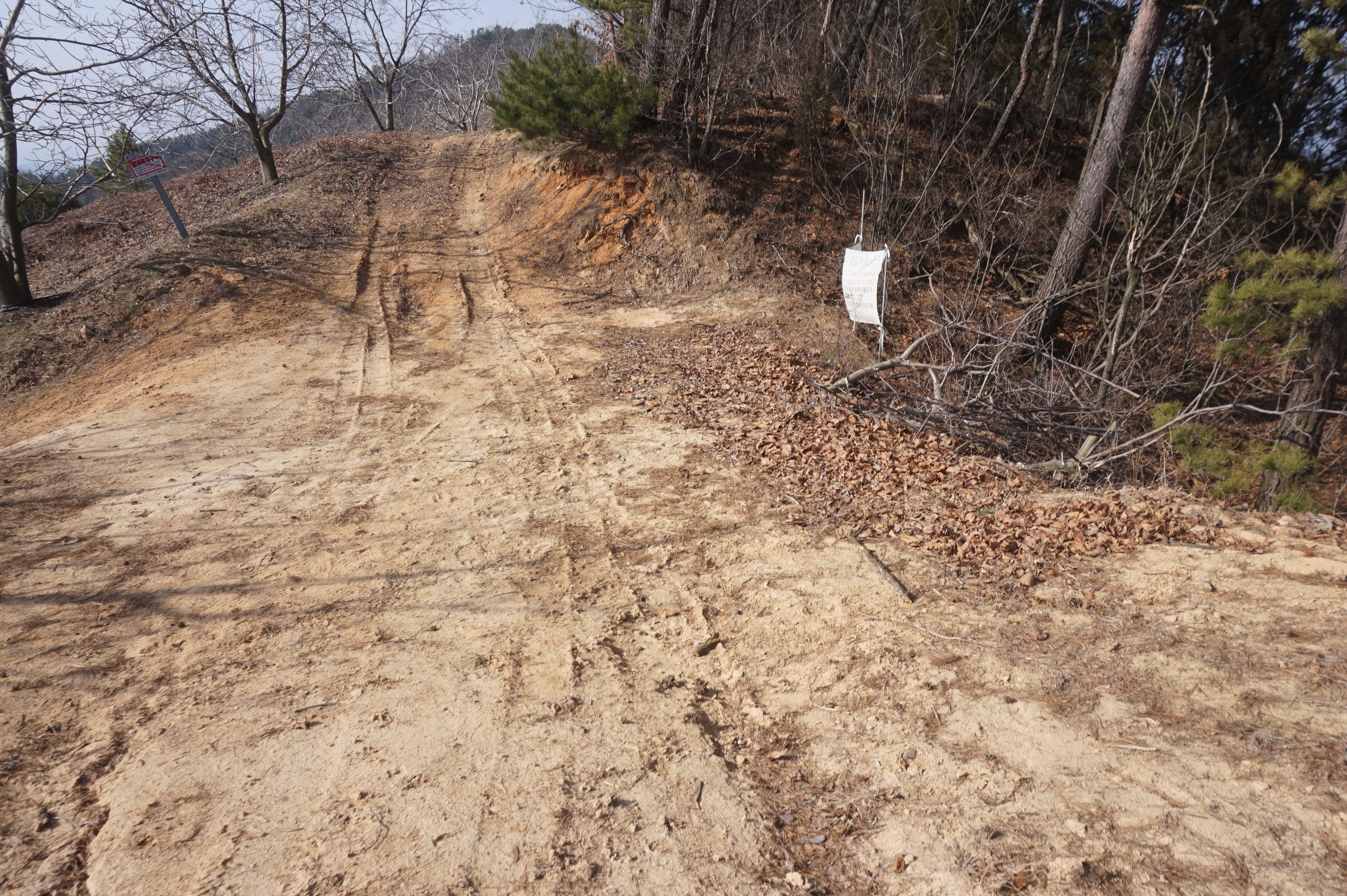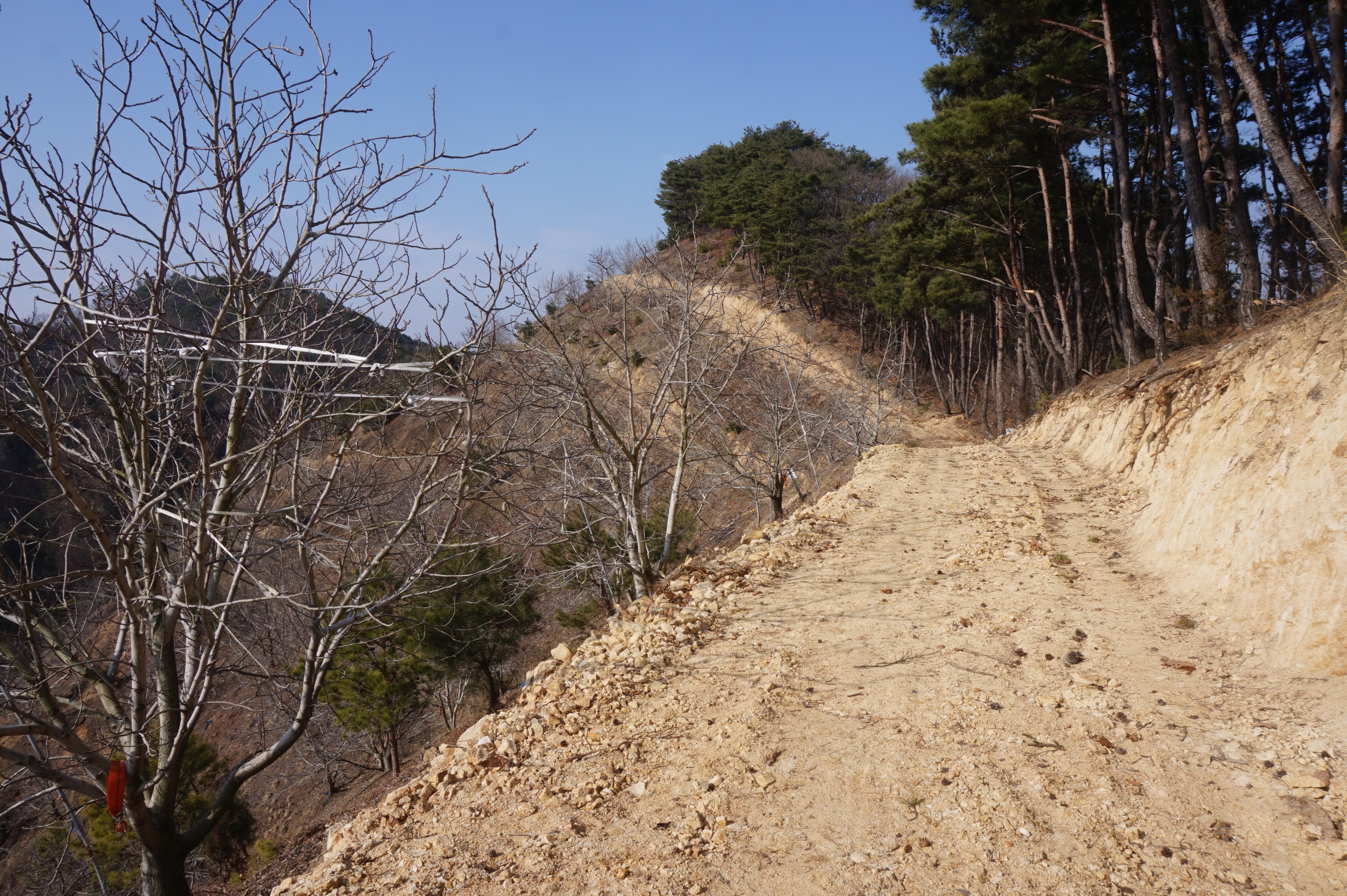 다시 시작되는 급경사 아래로 절개지가 보이고...