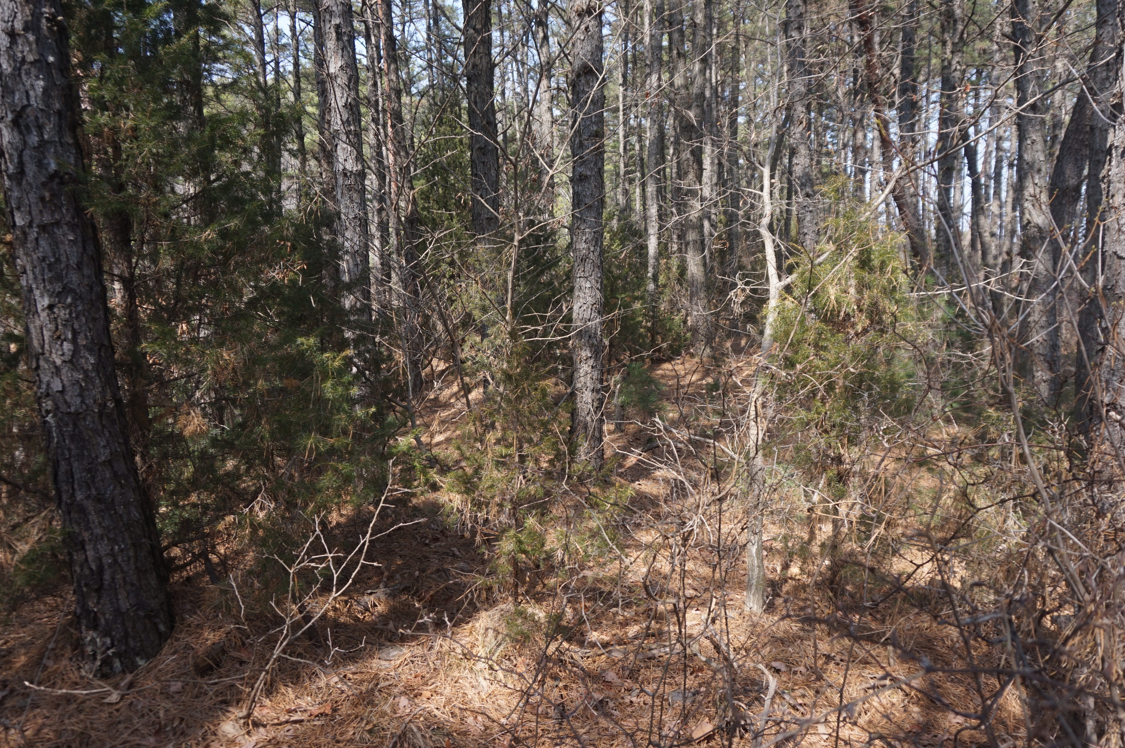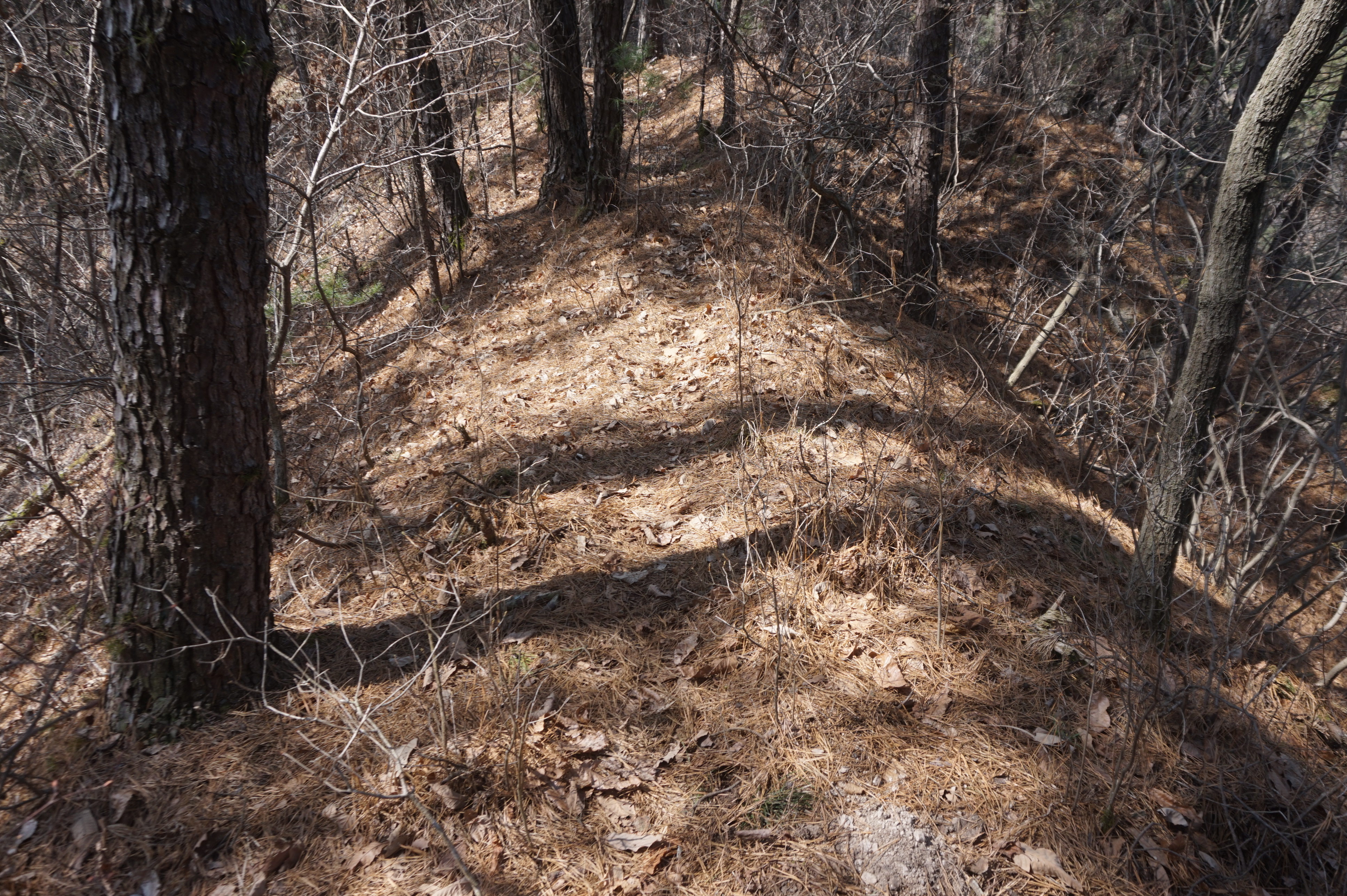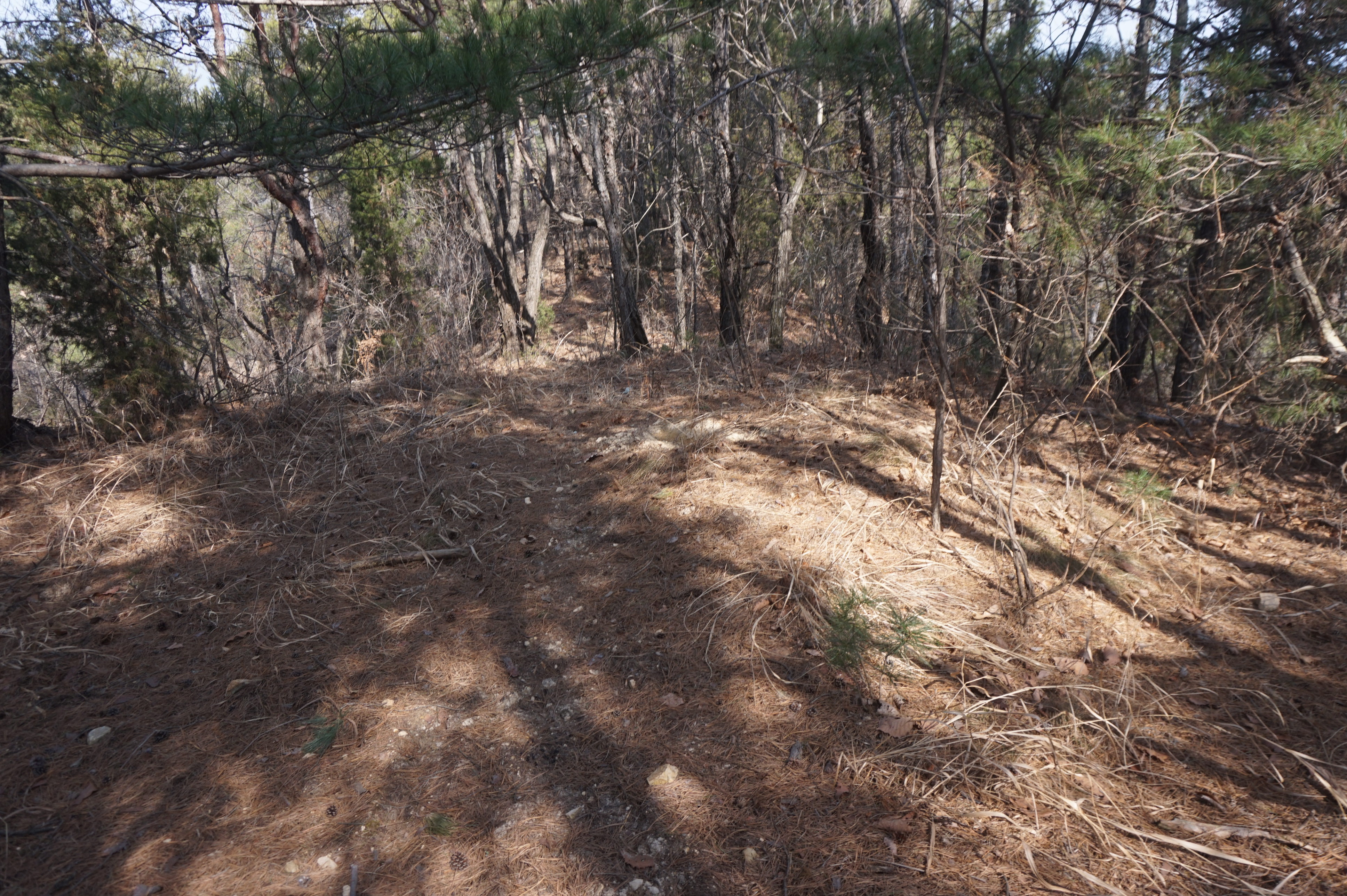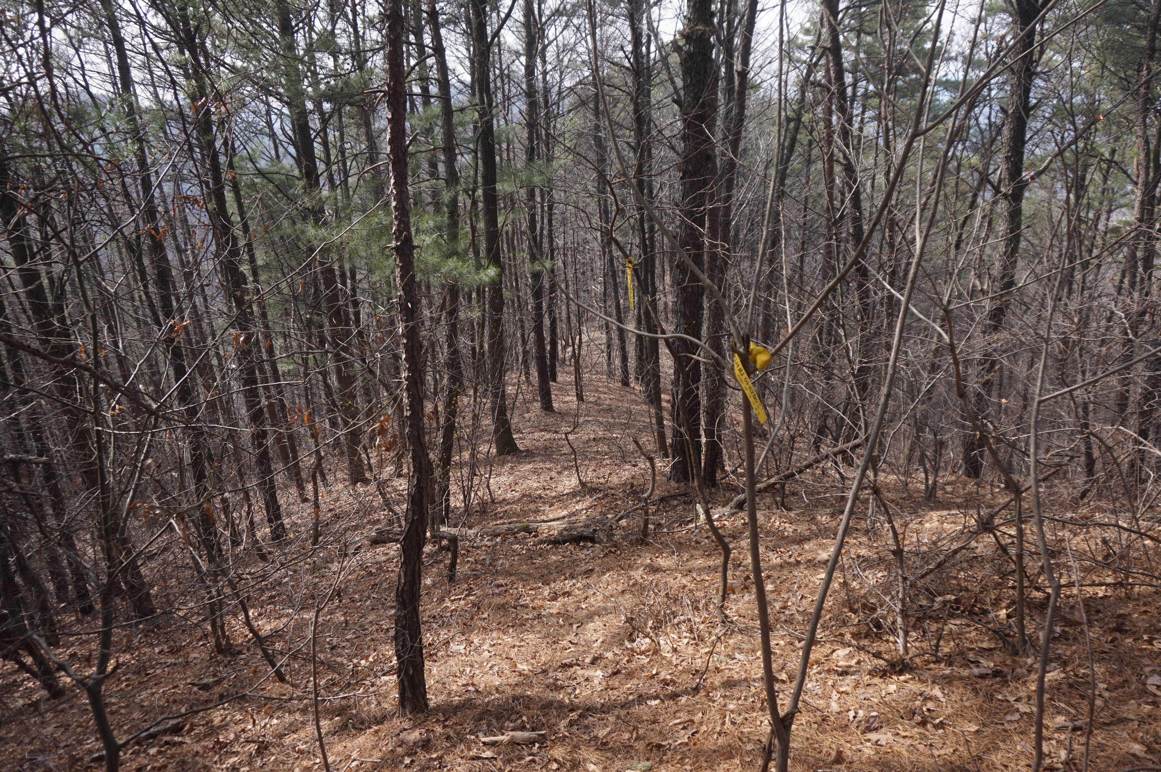 다시 시작되는 급경사 아래로 절개지가 보이고...