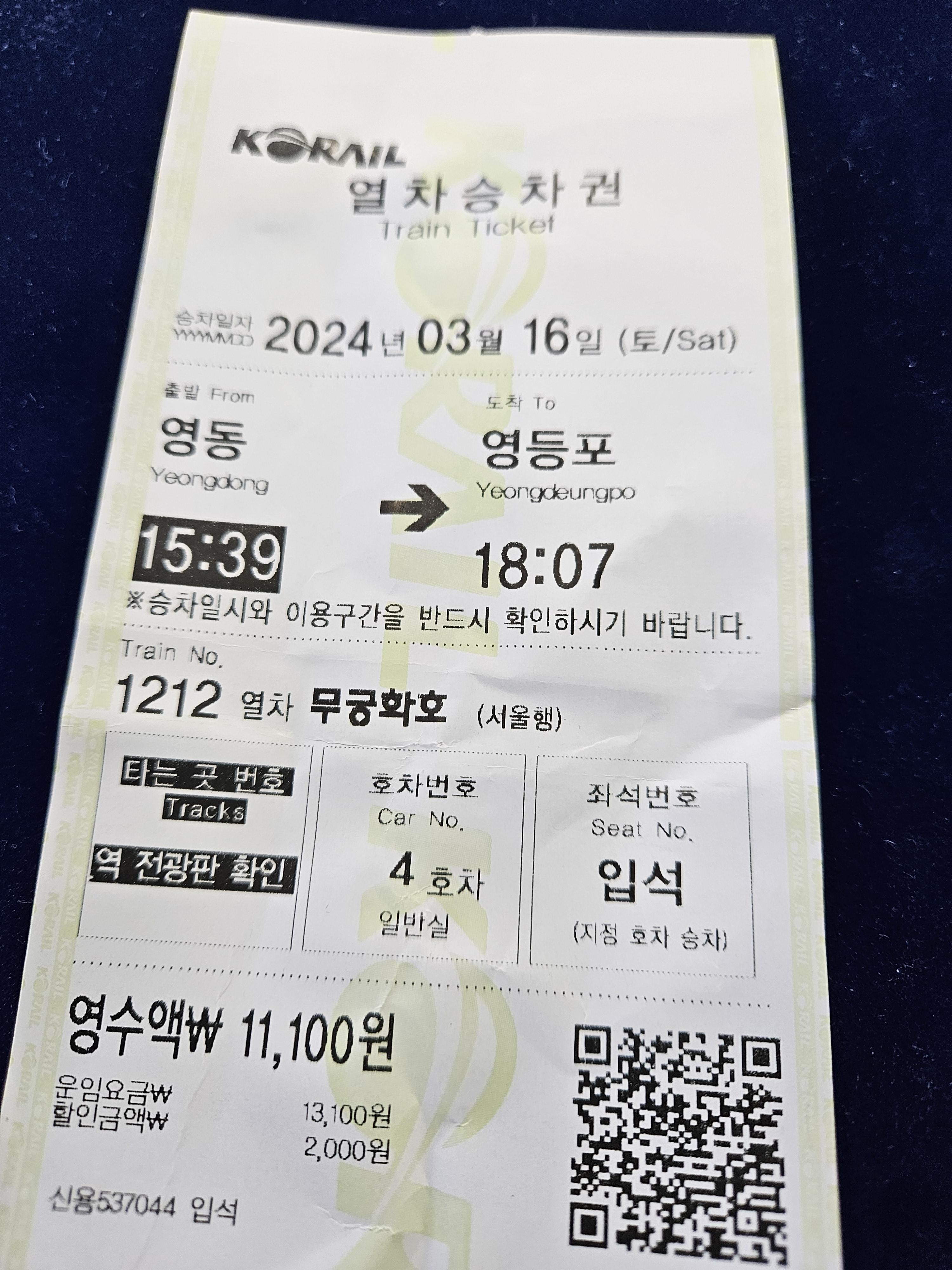 영동발 → 영등포행 열차표