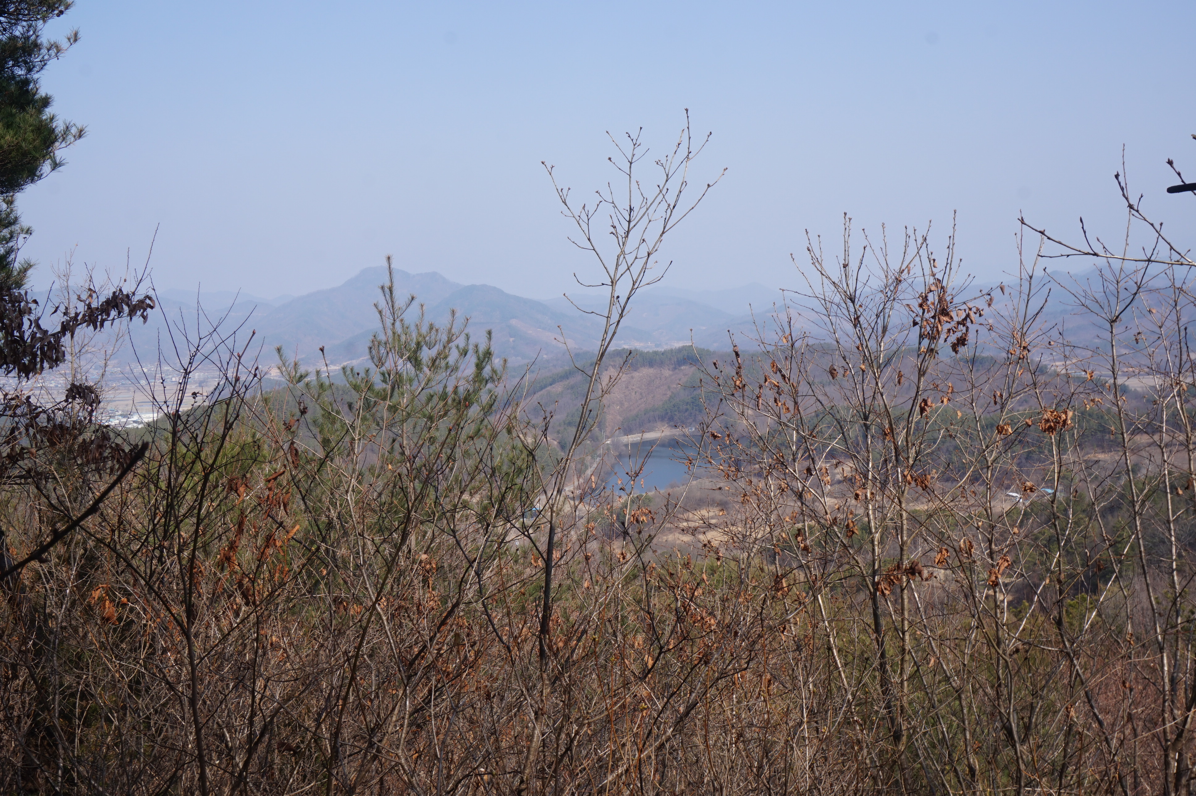 등로 우측 나뭇가지 사이로 꽤나 큰 규모의 의동저수지가 보이고