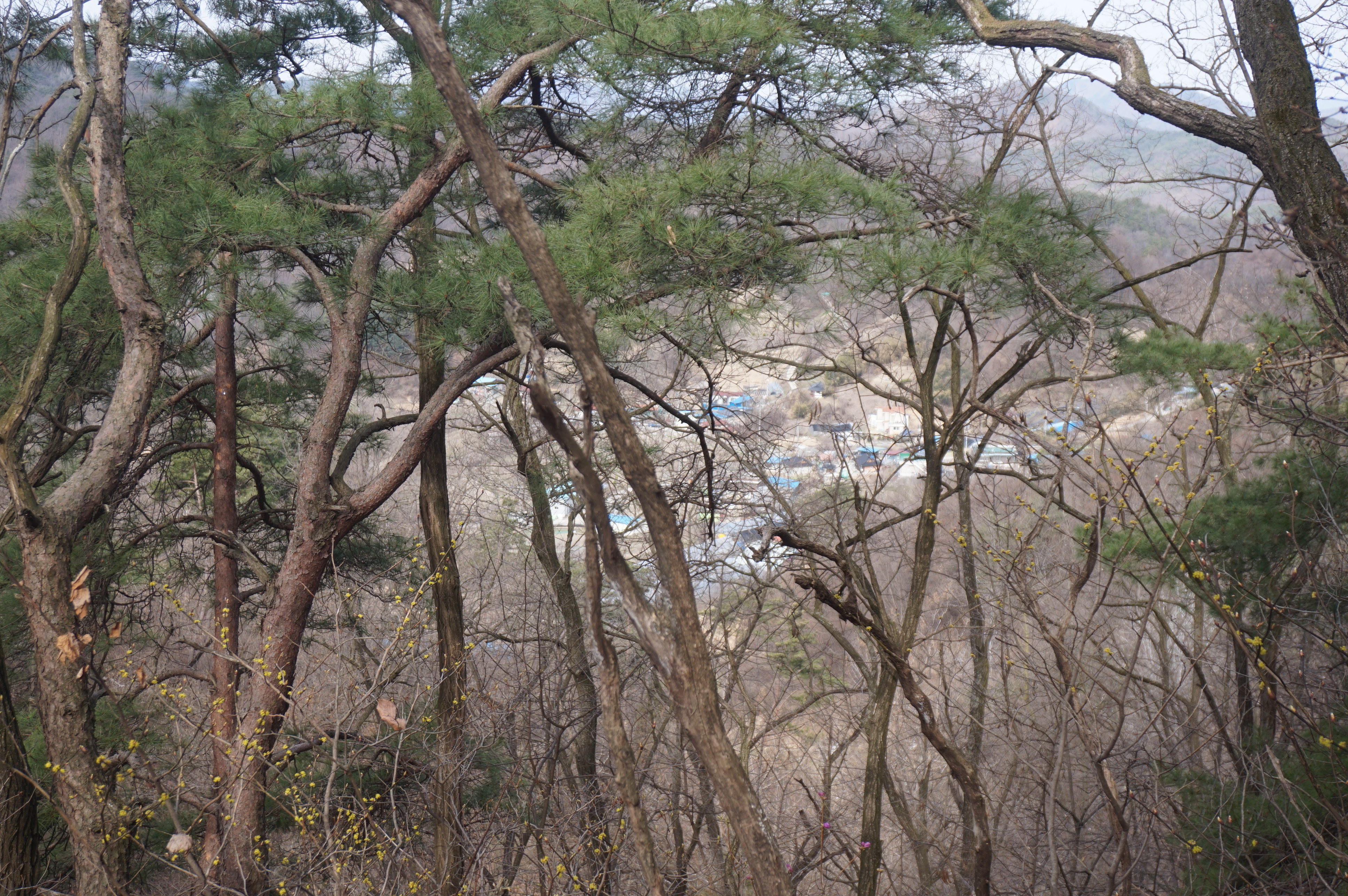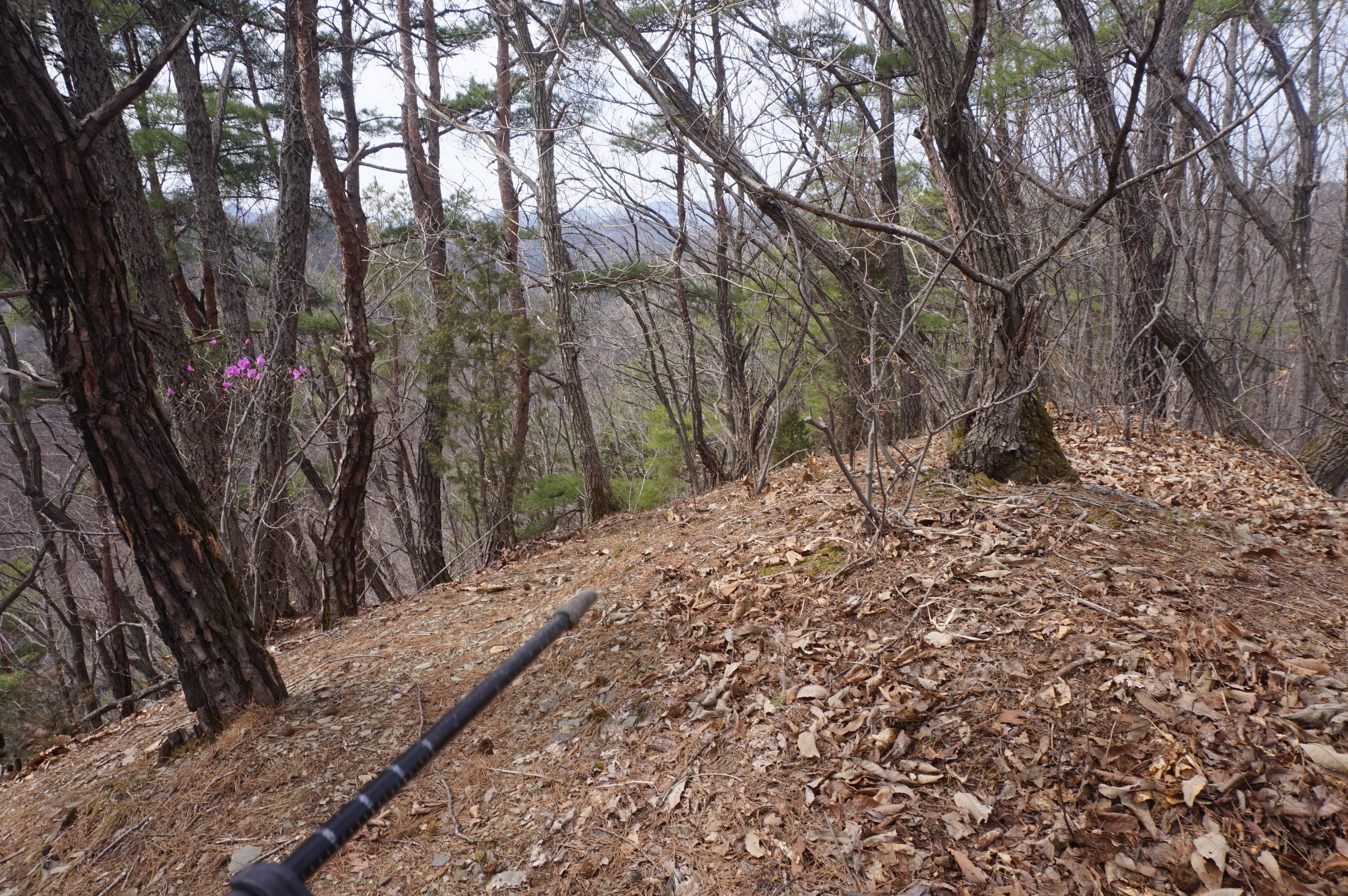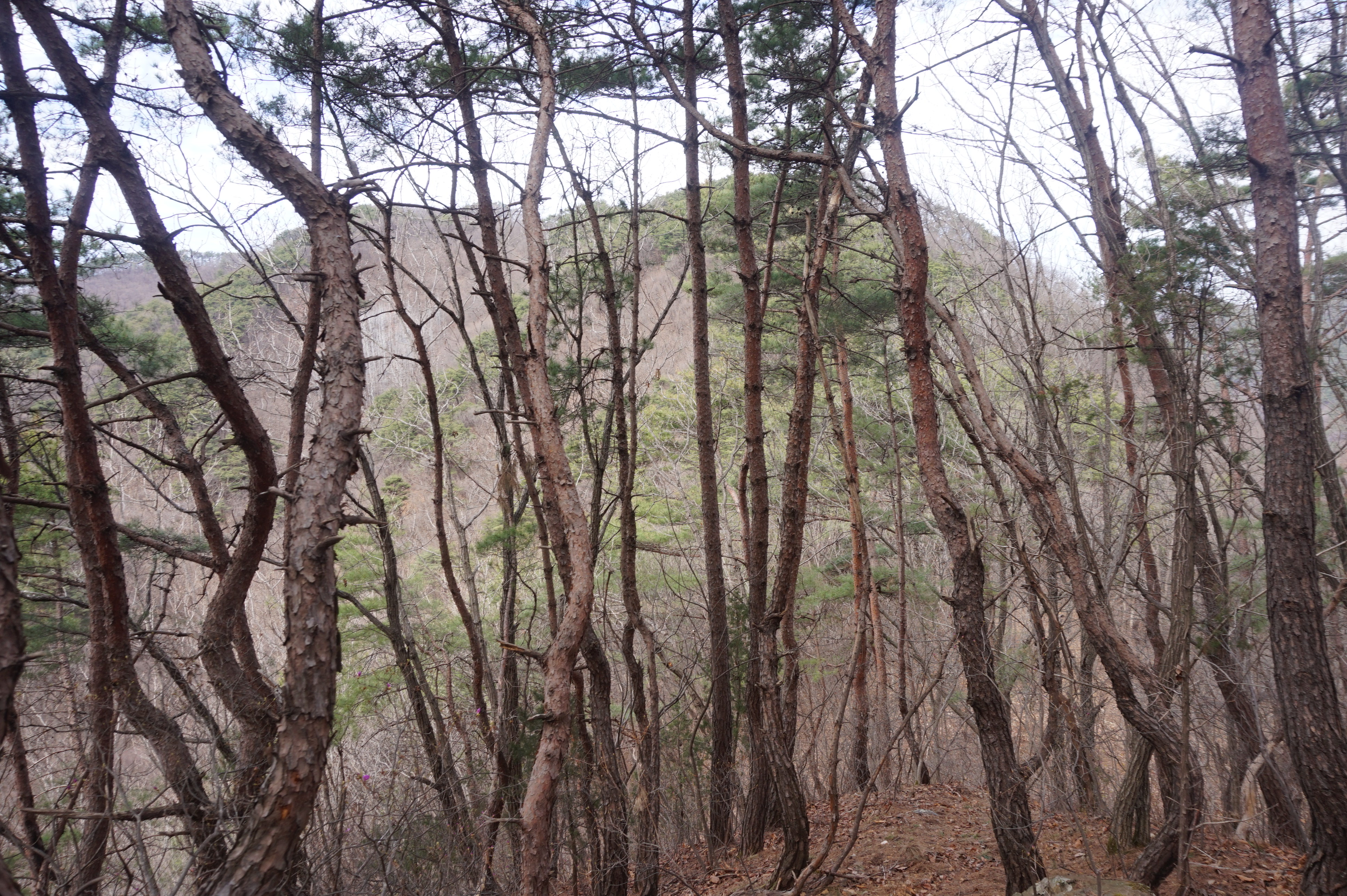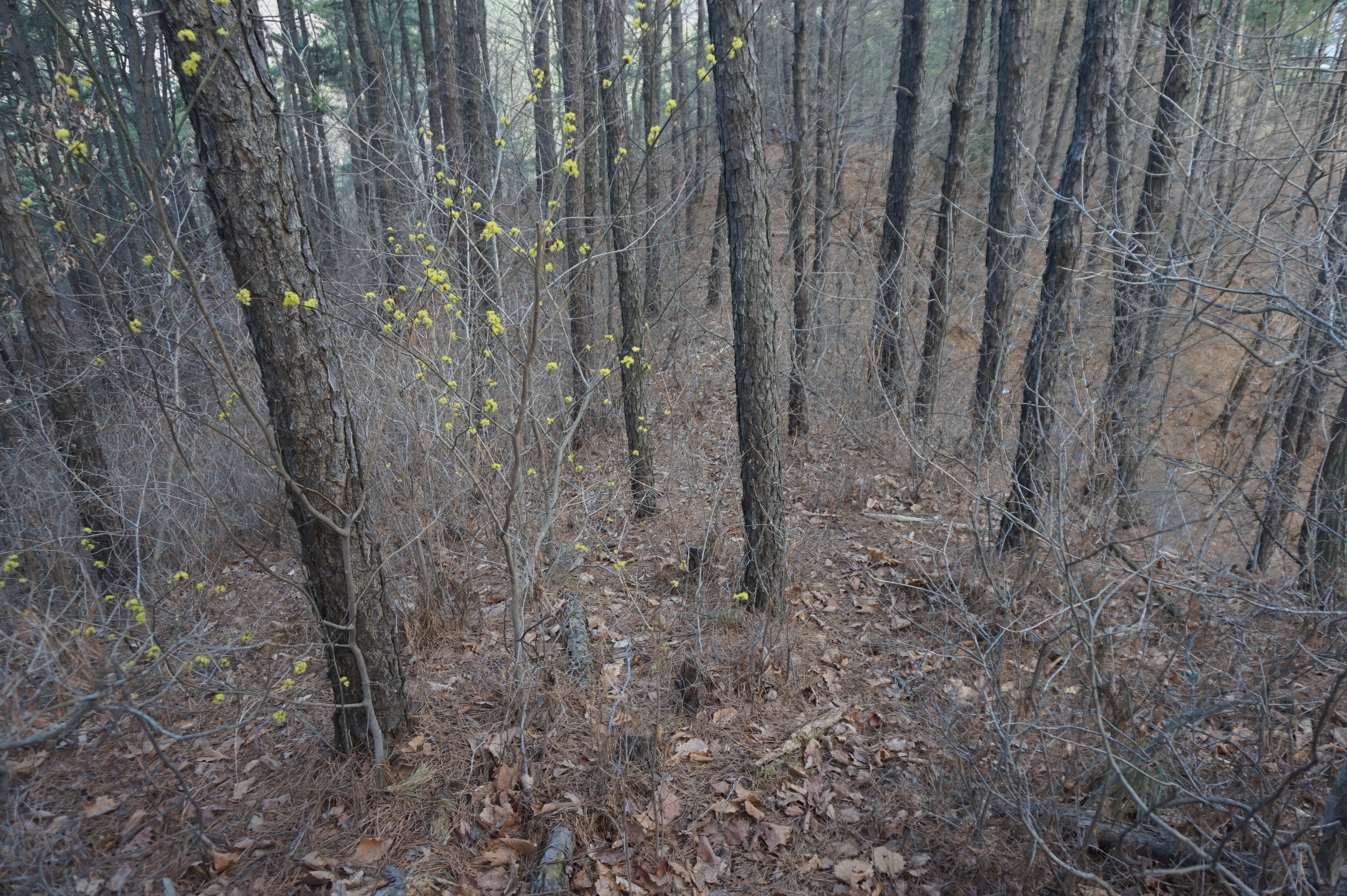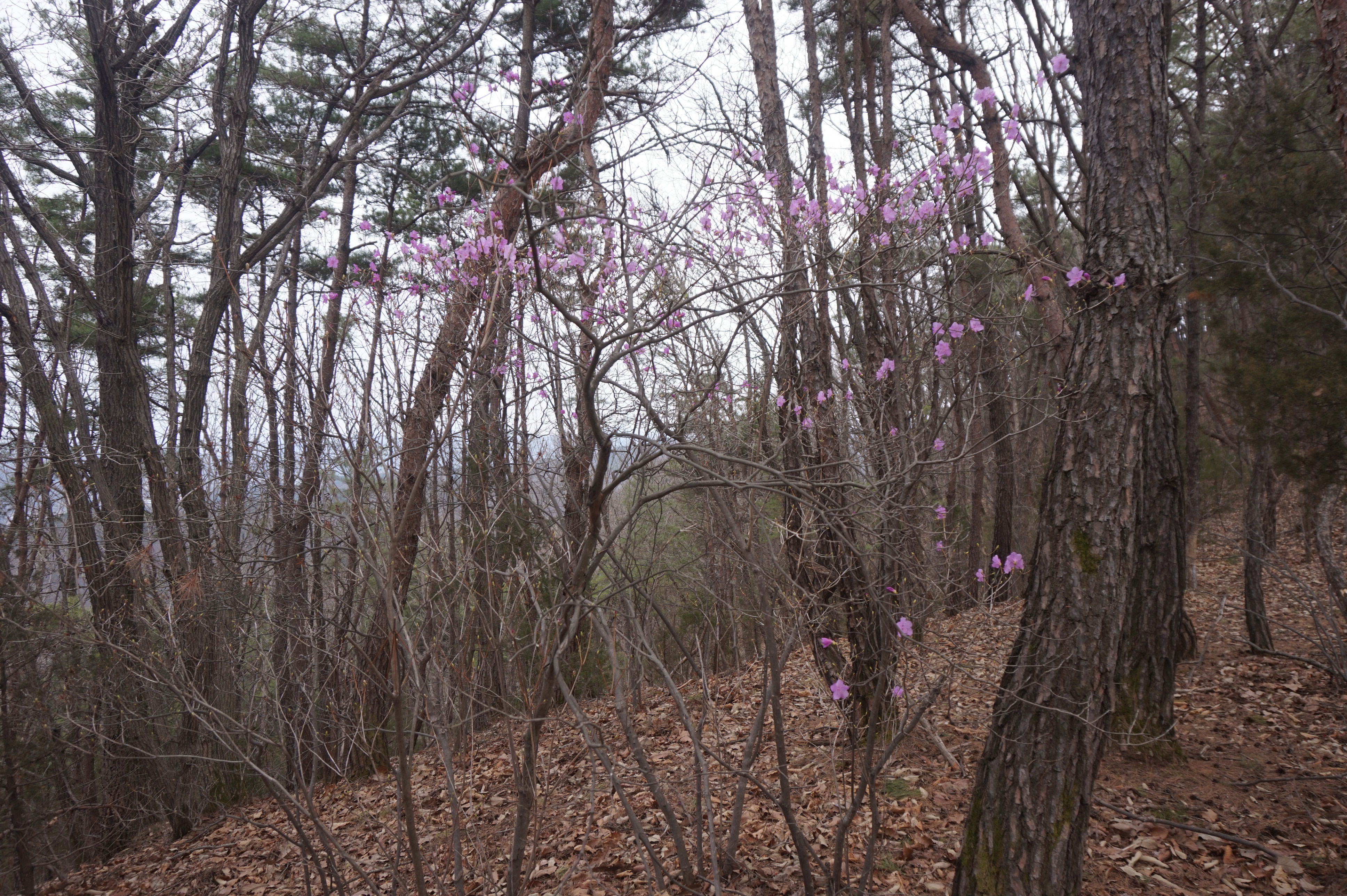 살짝 우측으로 내려서니 키 큰 소나무 사이로 봄산에서 전령사