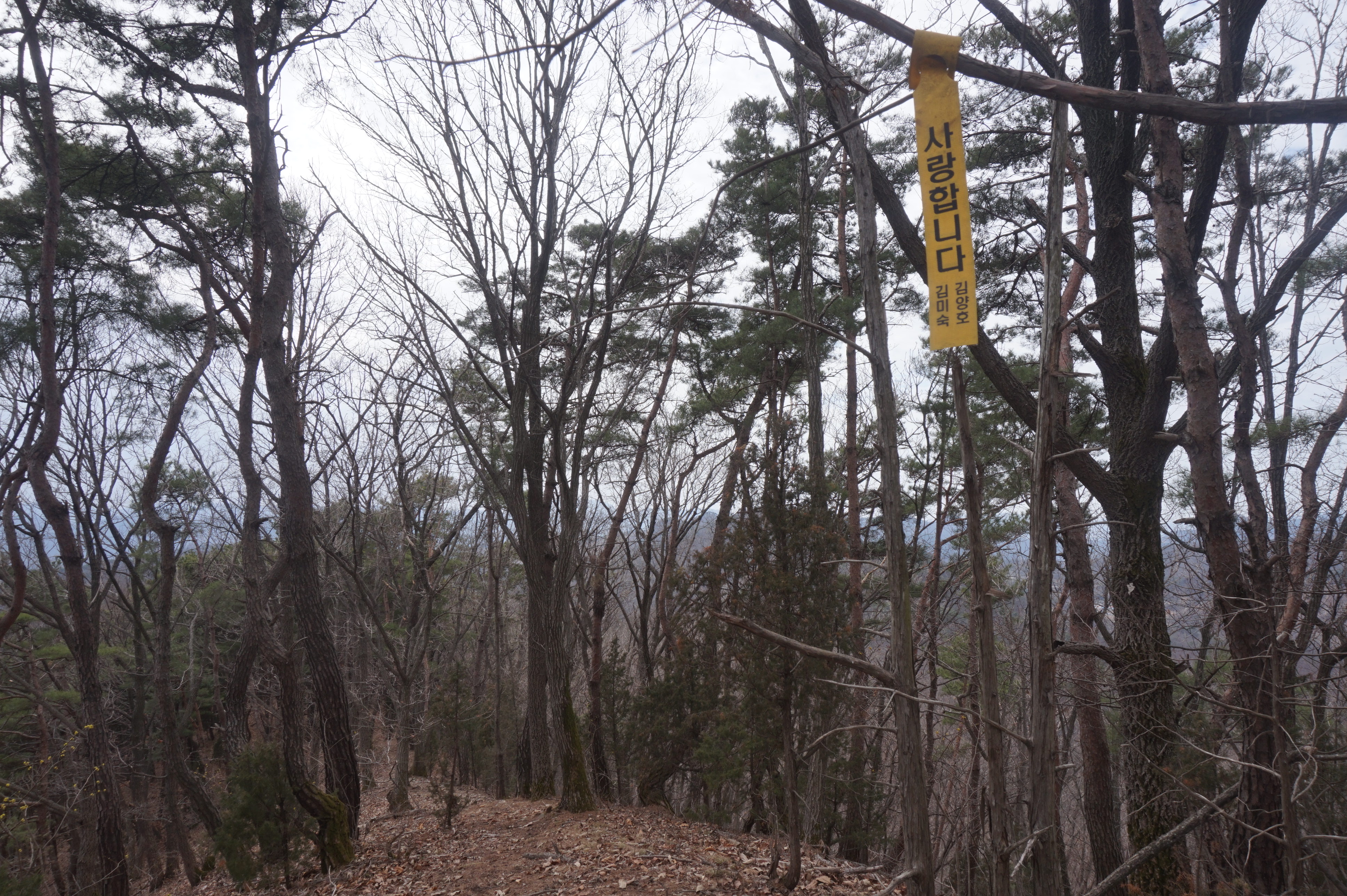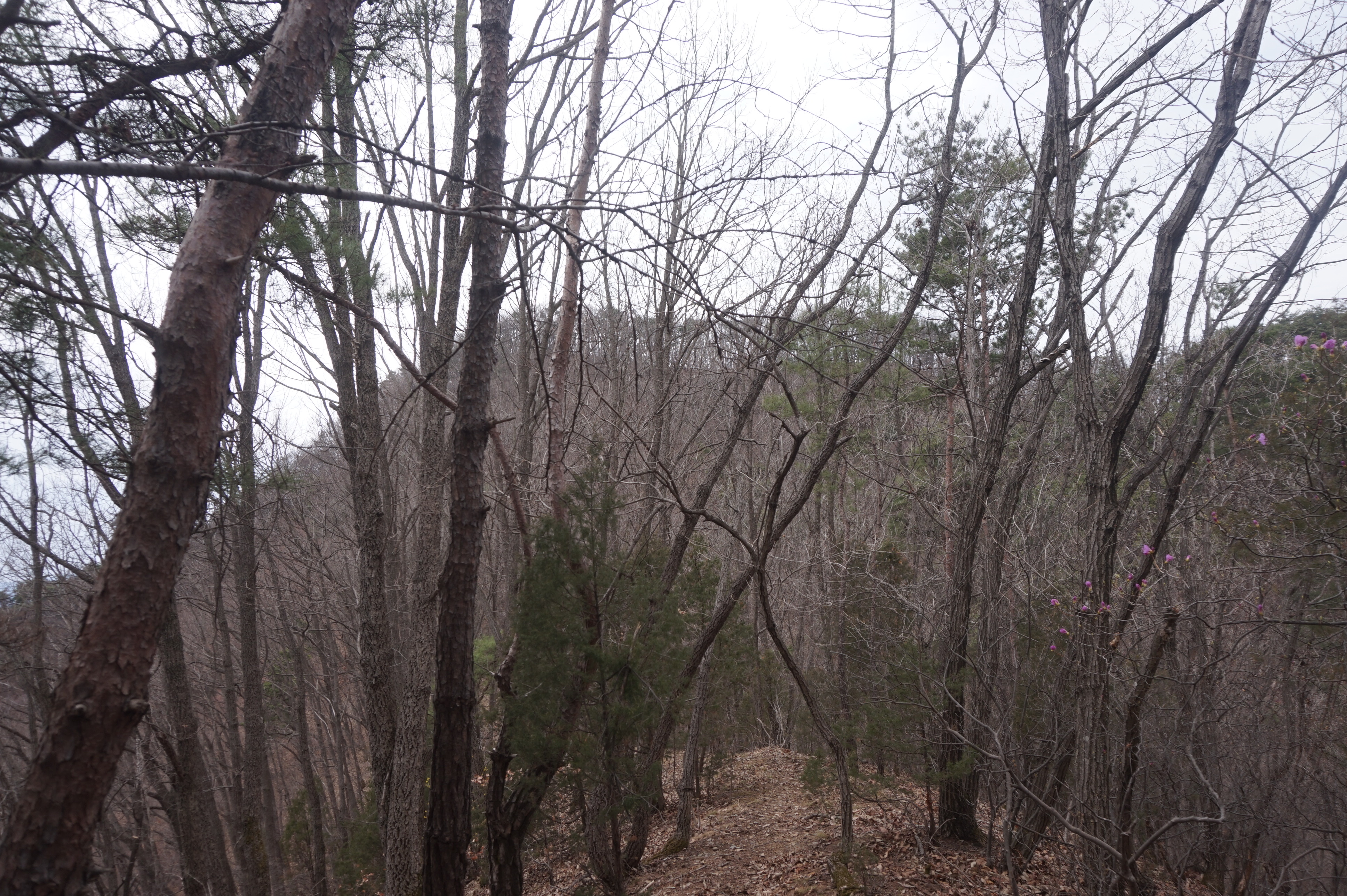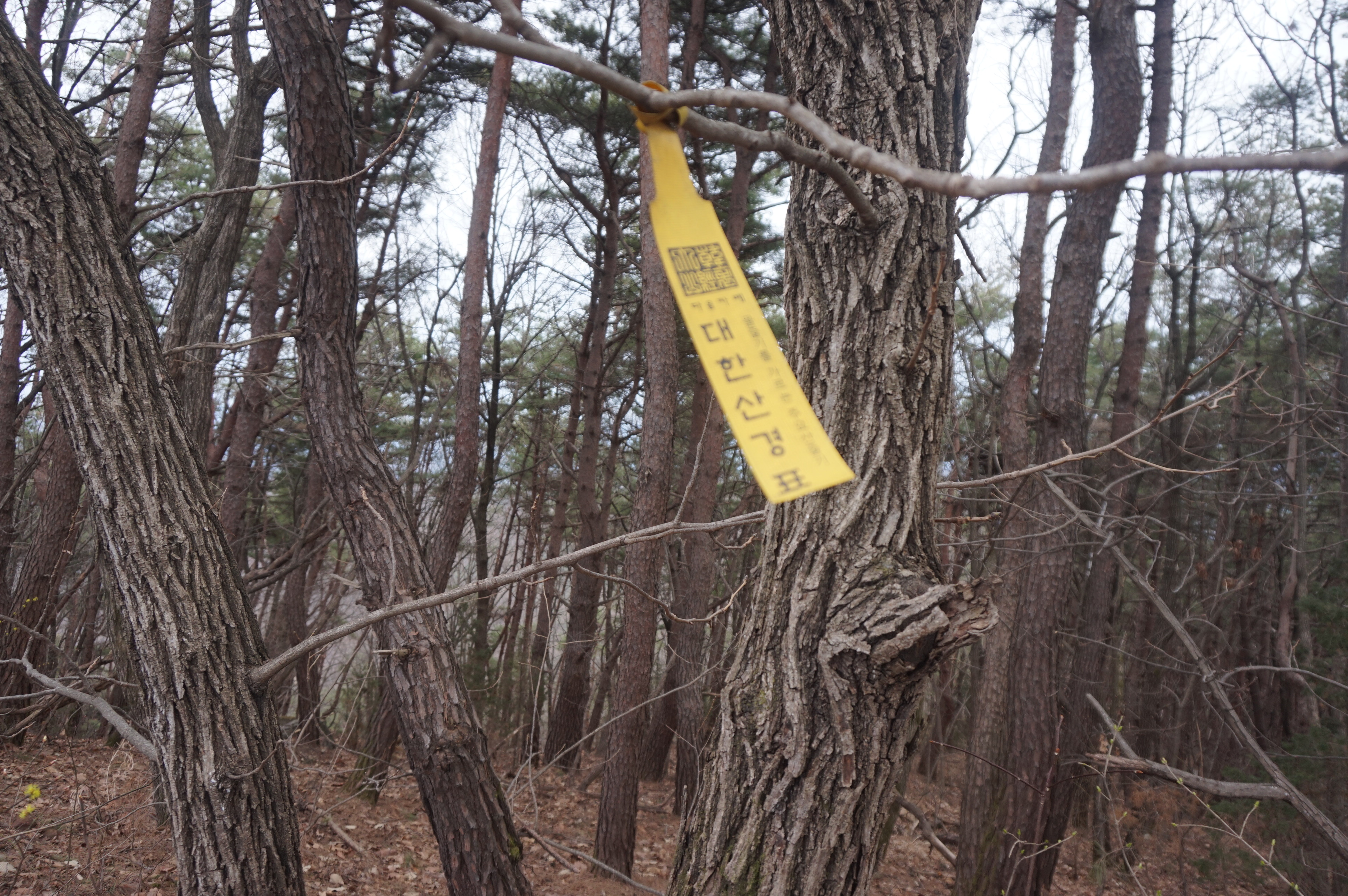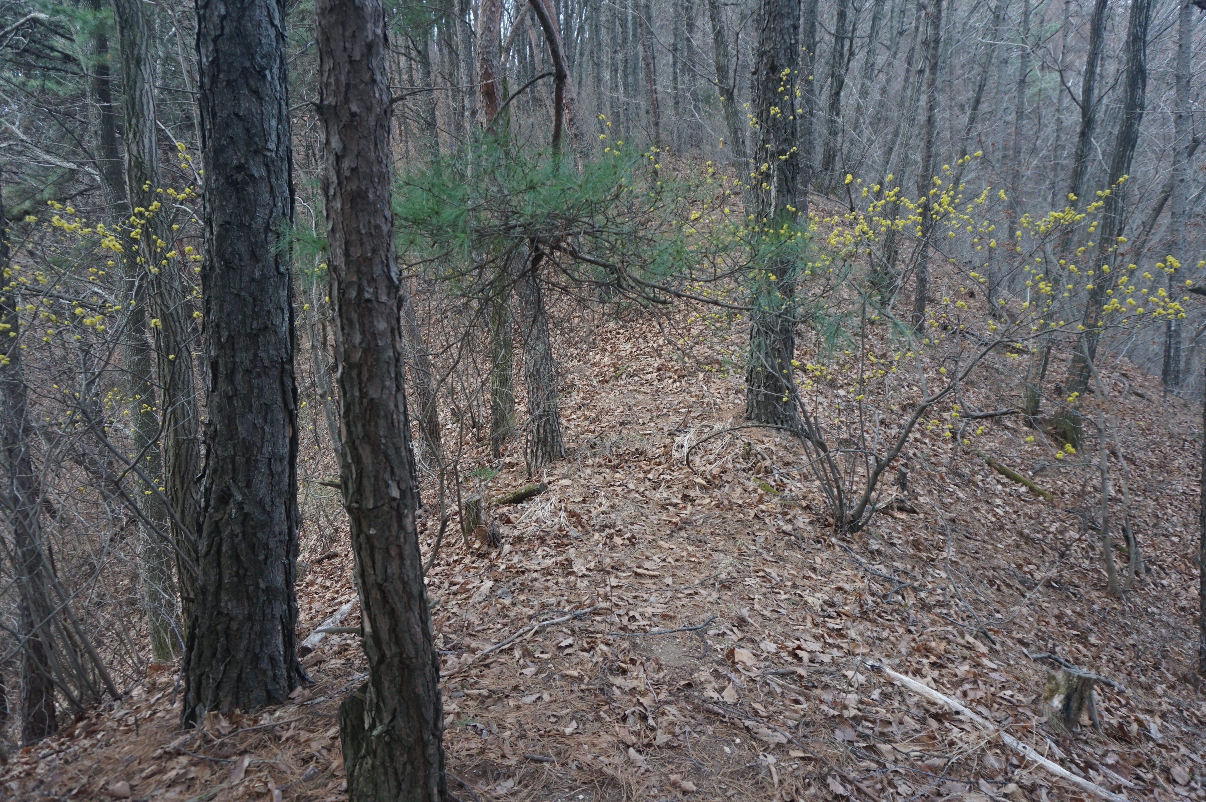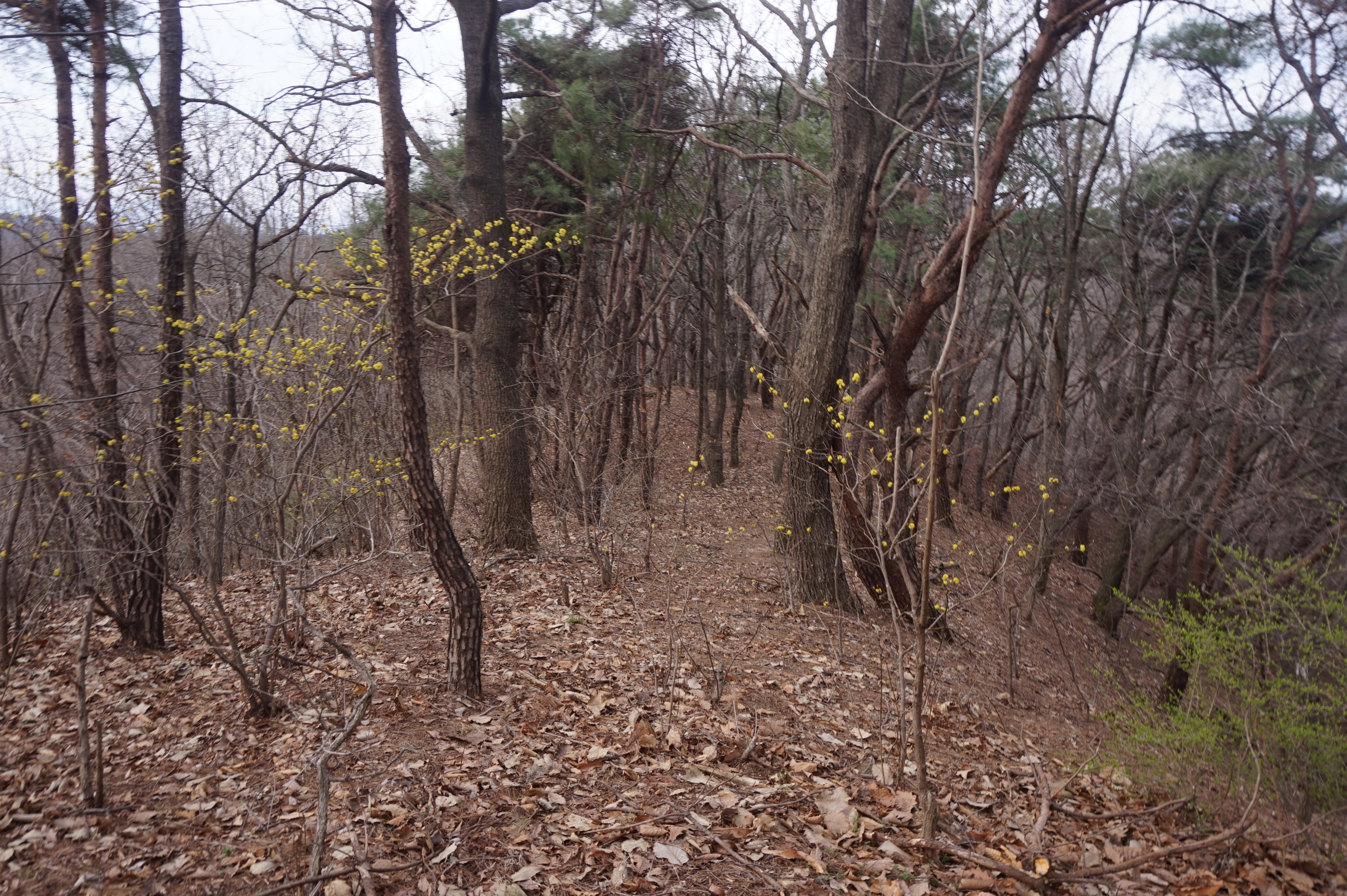 살짝 우측으로 내려서니 키 큰 소나무 사이로 봄산에서 전령사