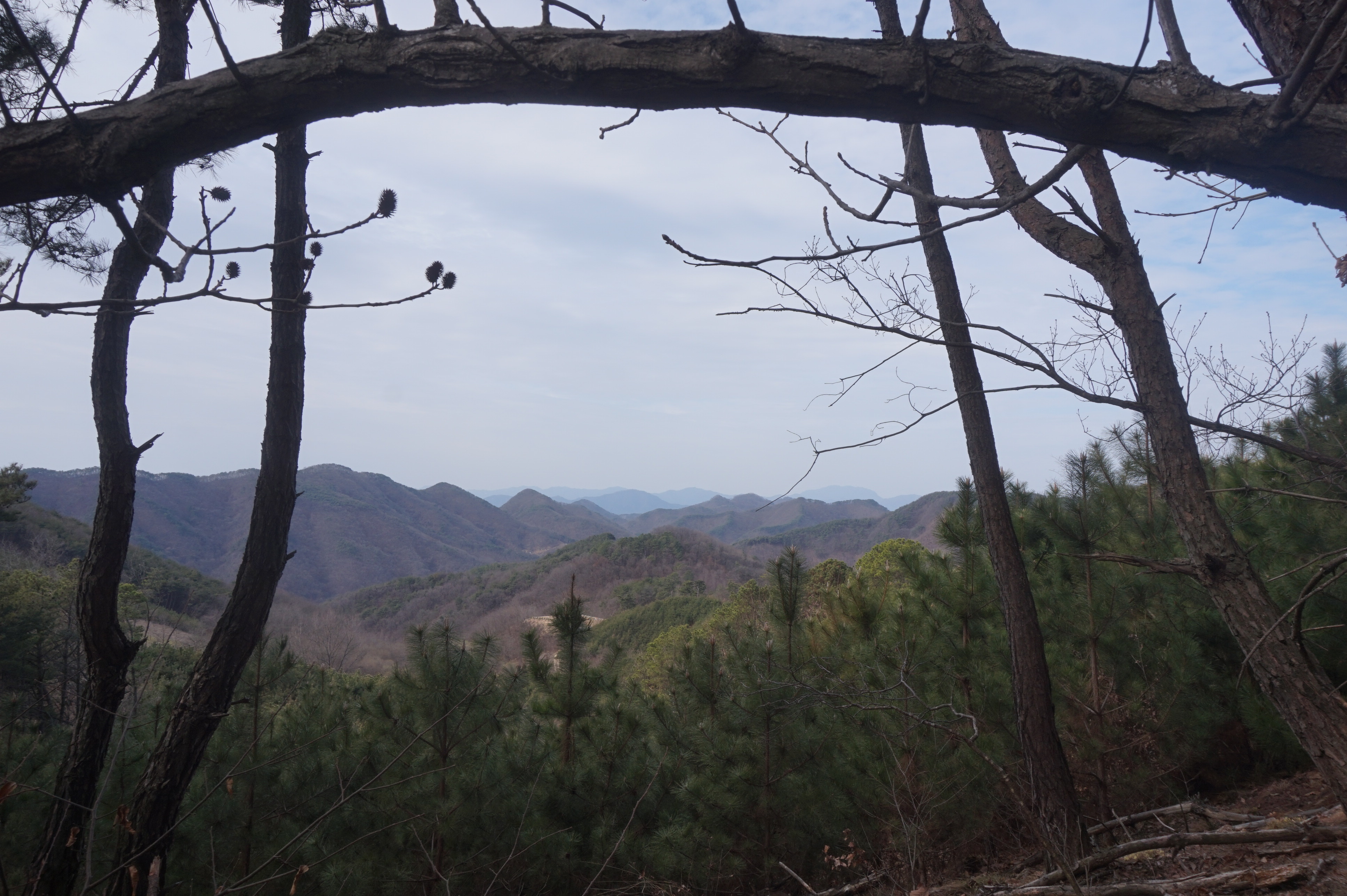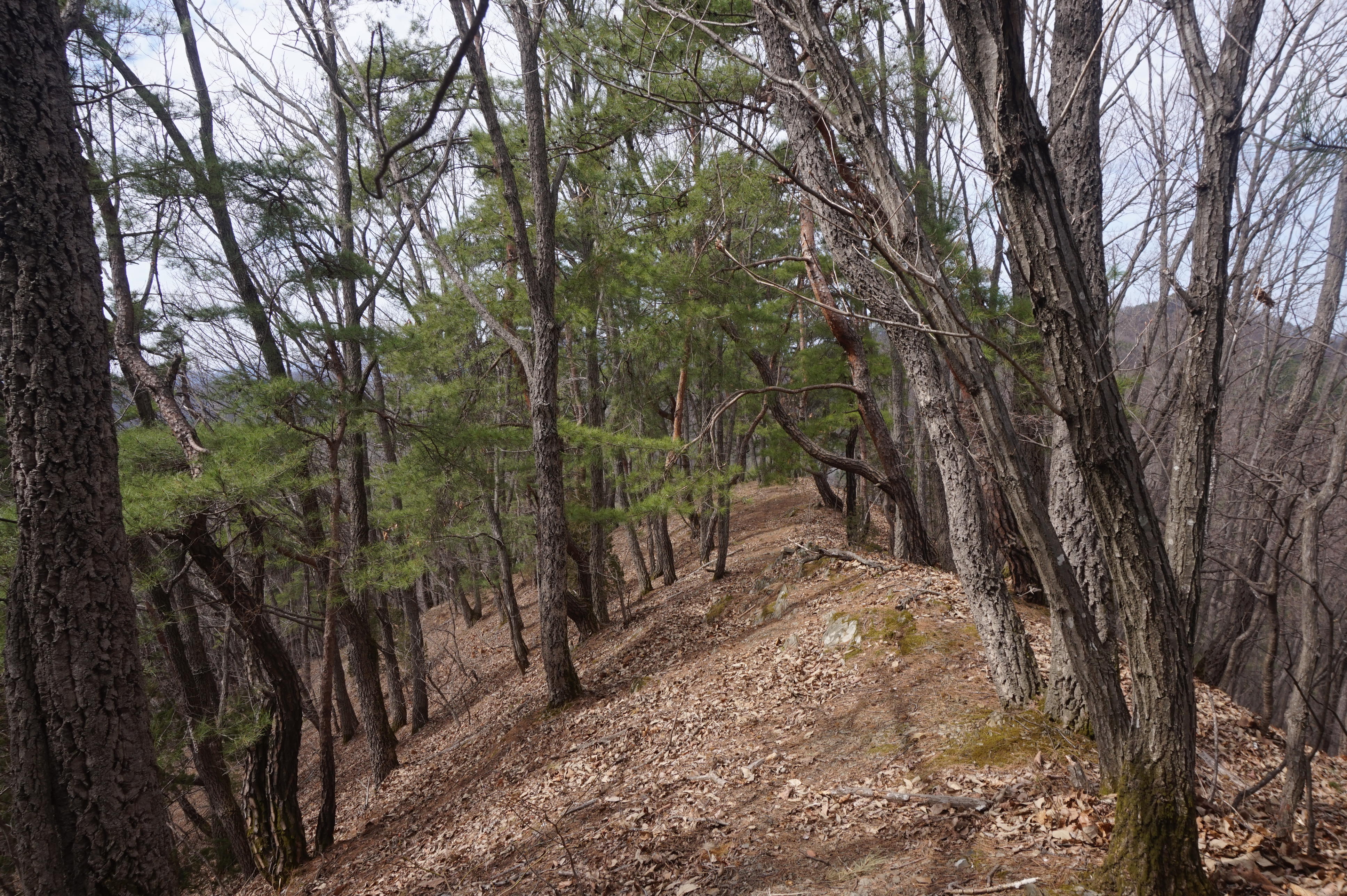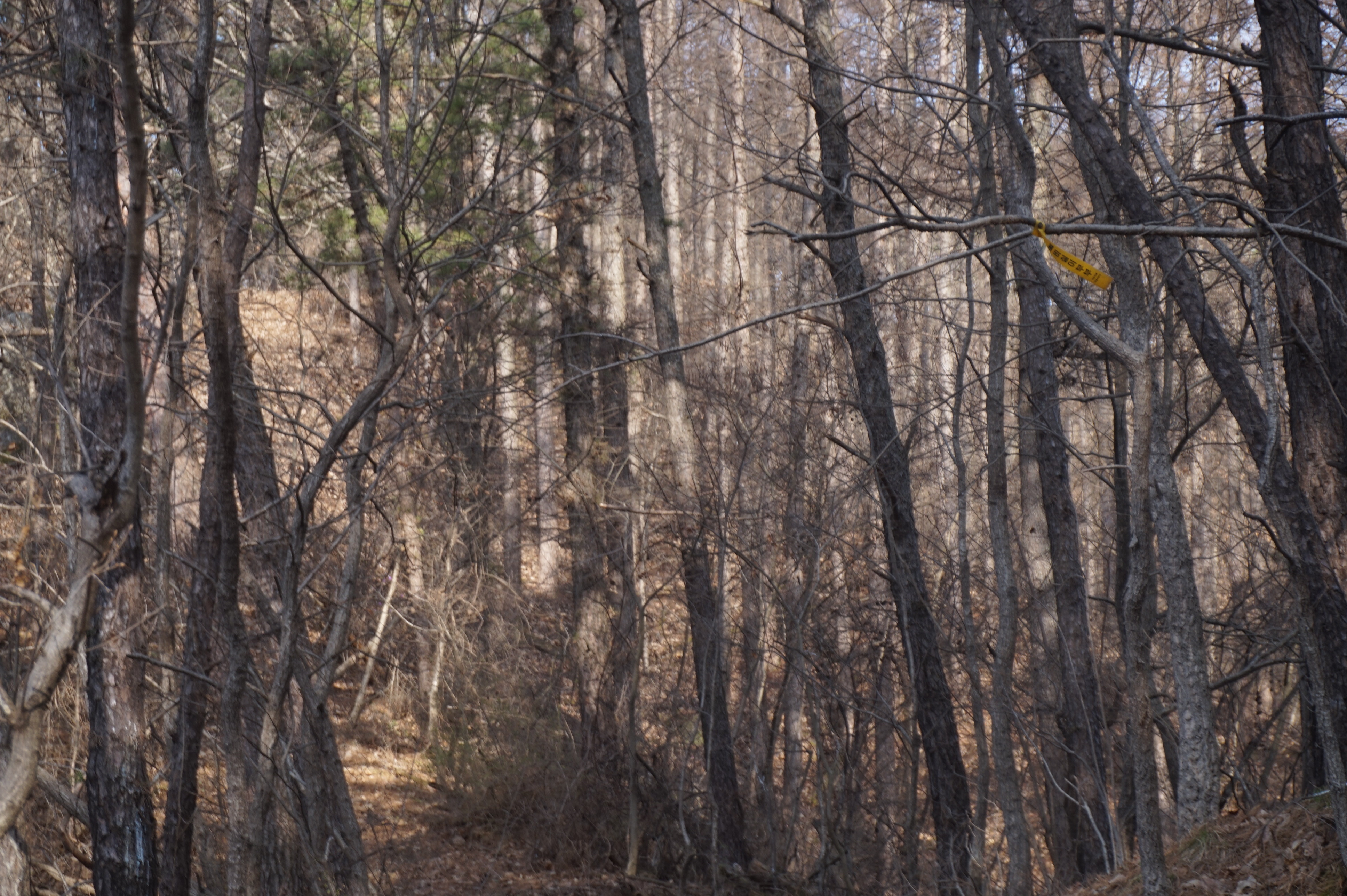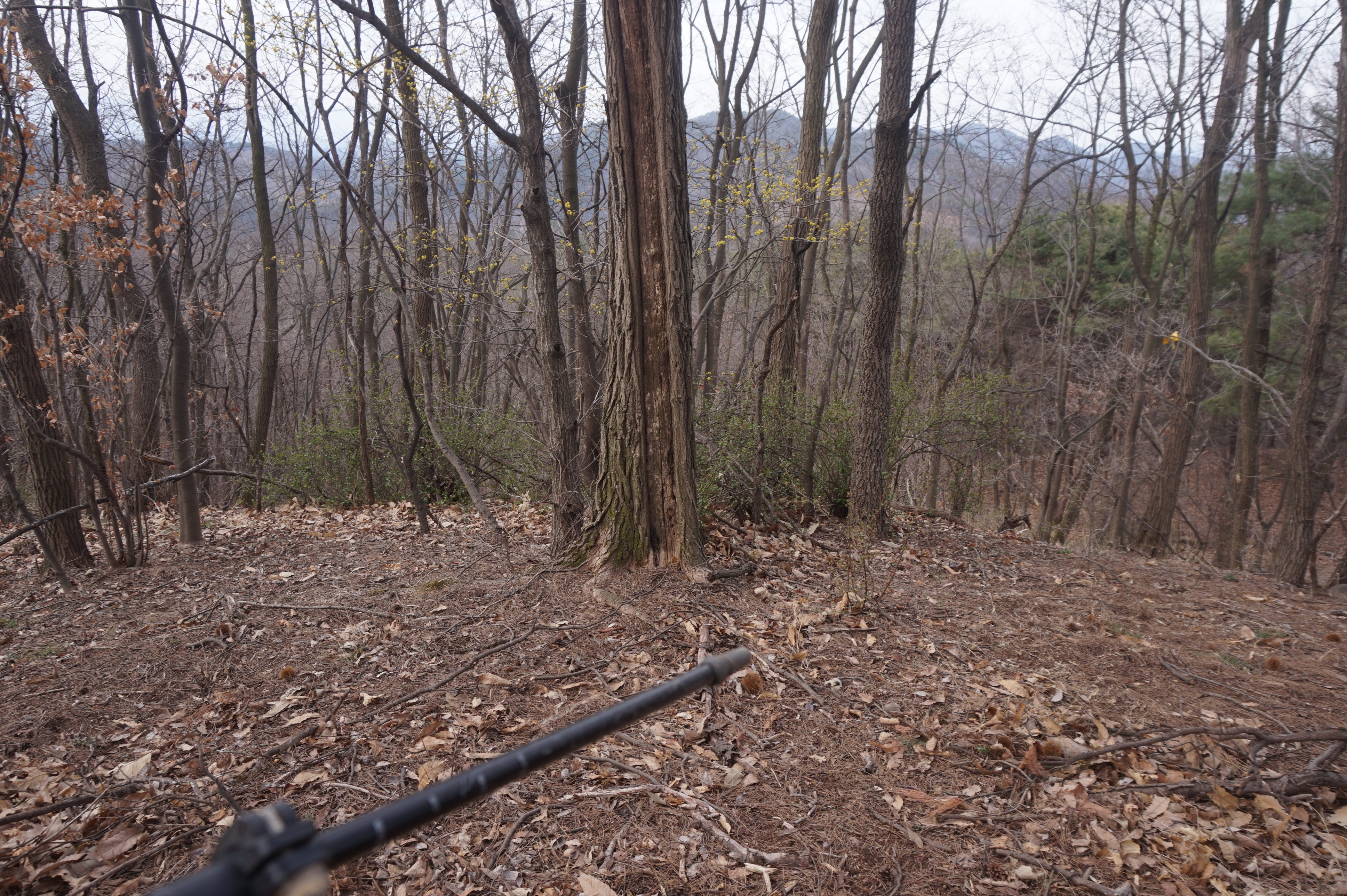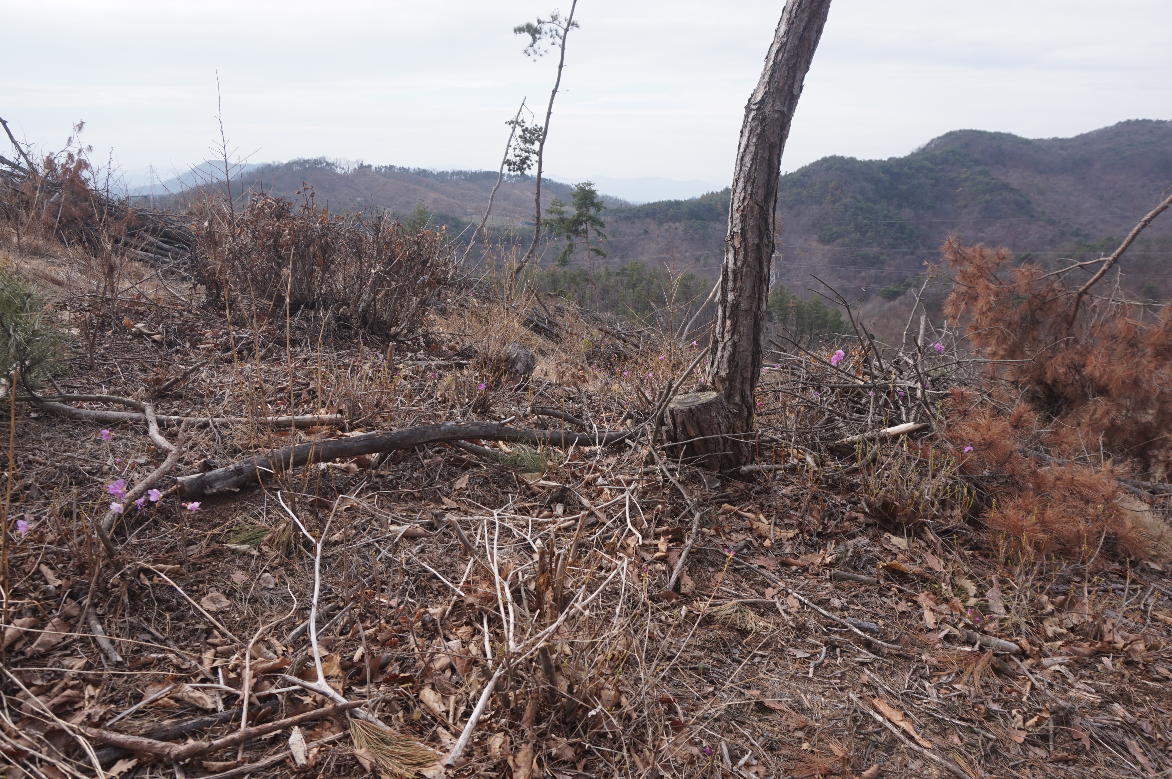 살짝 우측으로 내려서니 키 큰 소나무 사이로 봄산에서 전령사