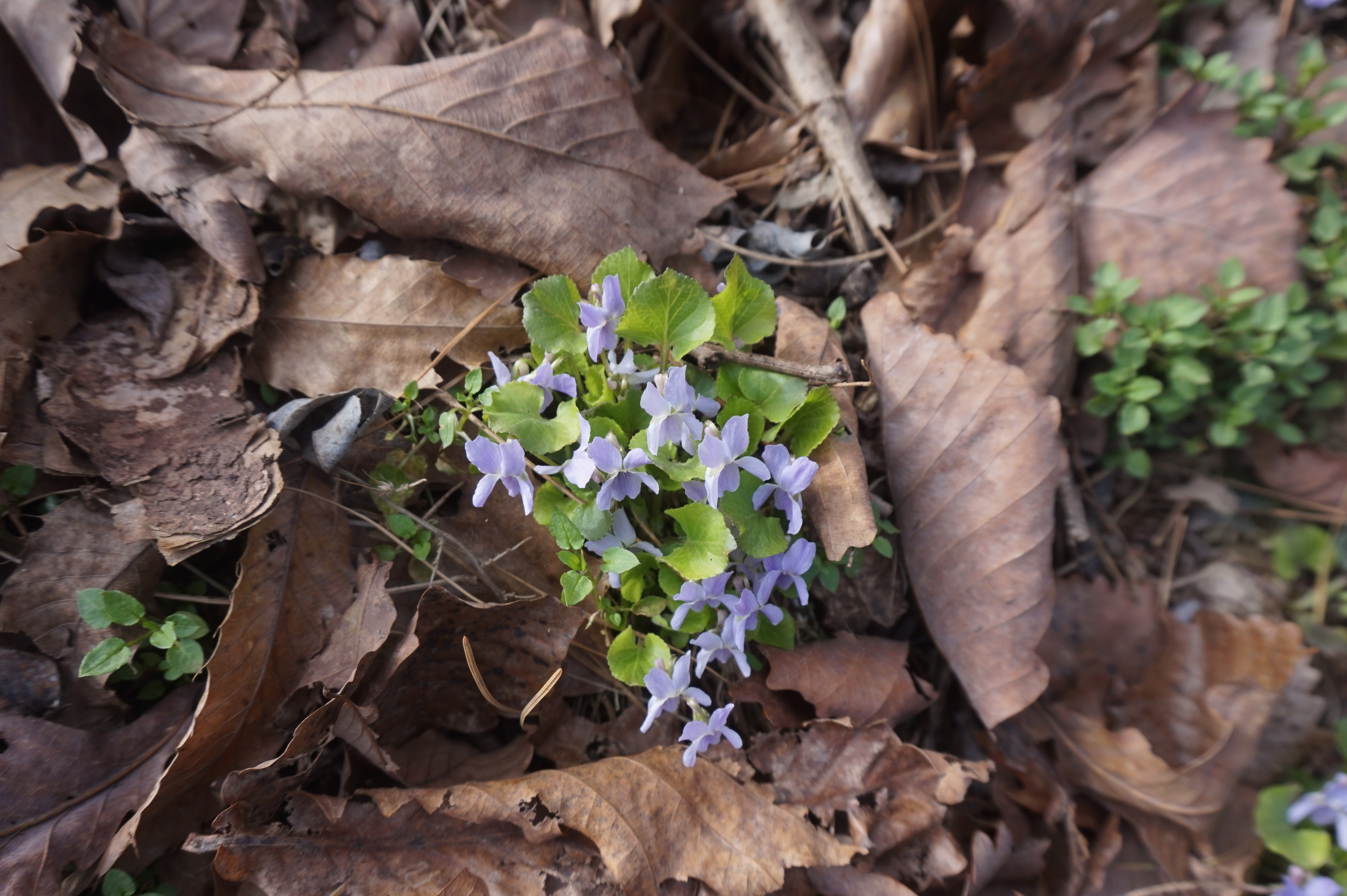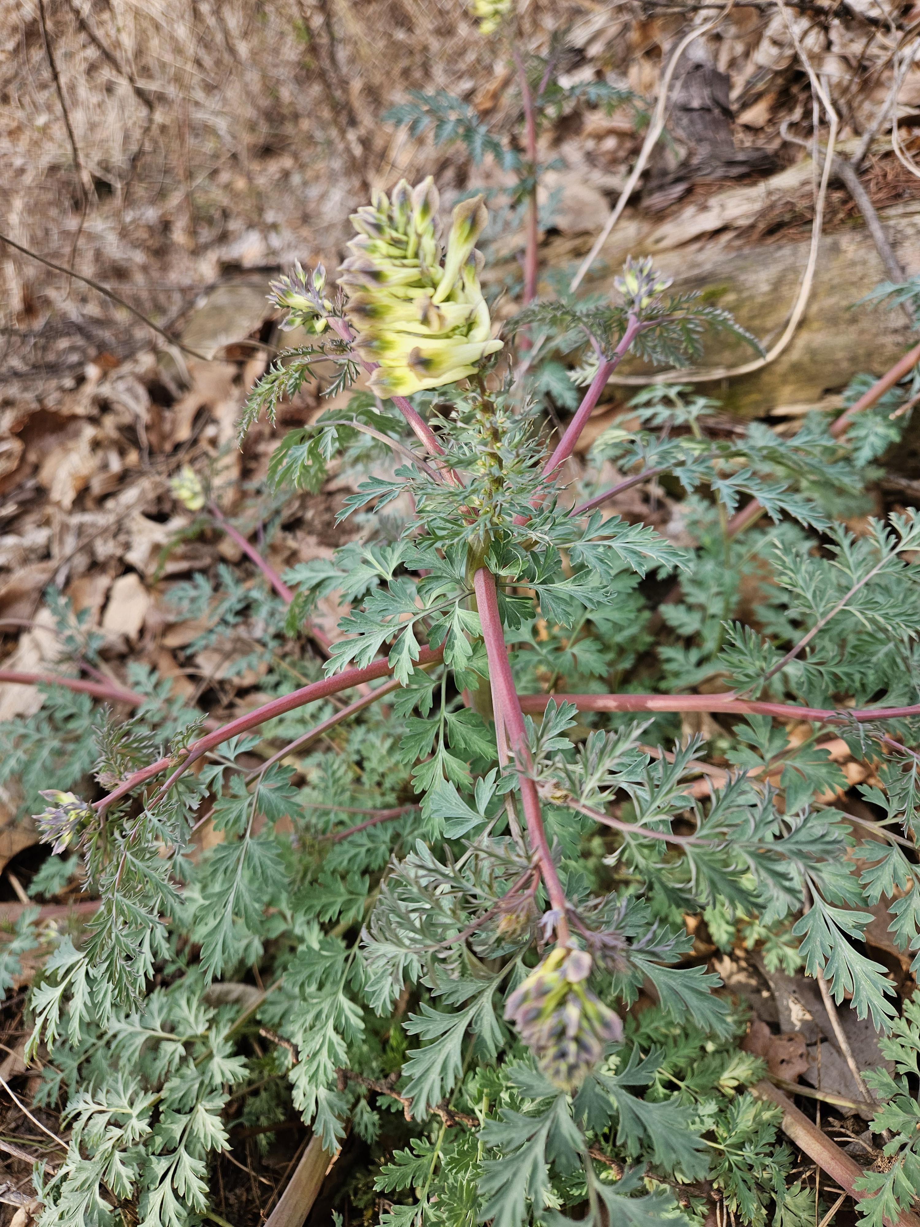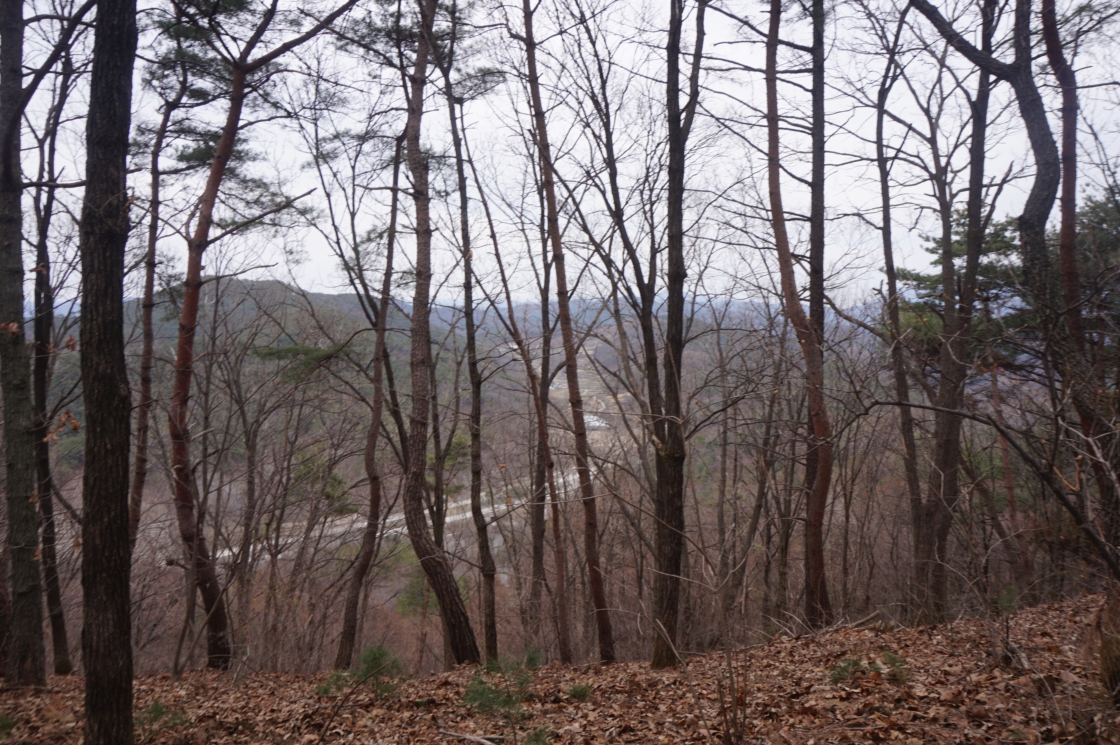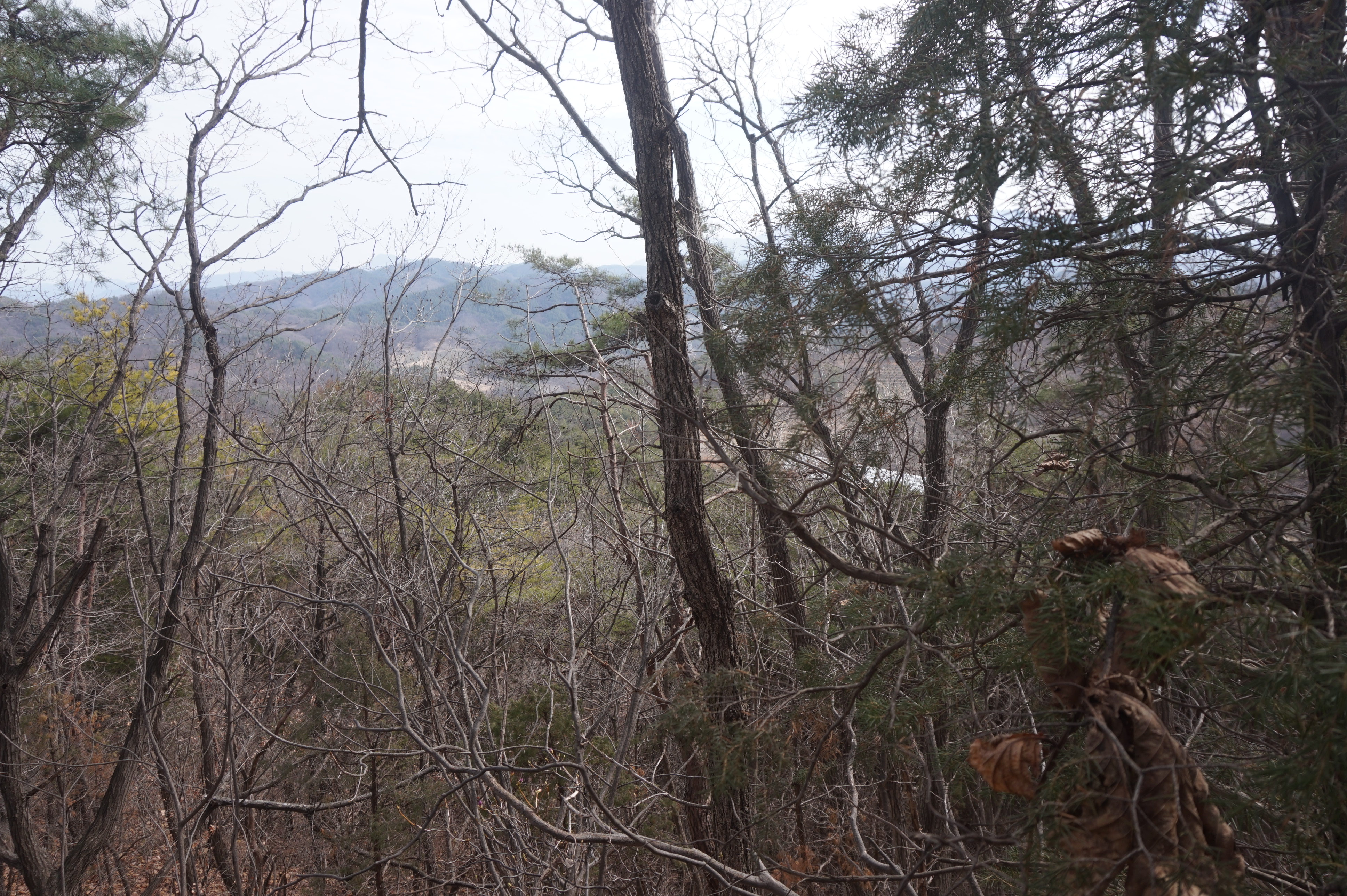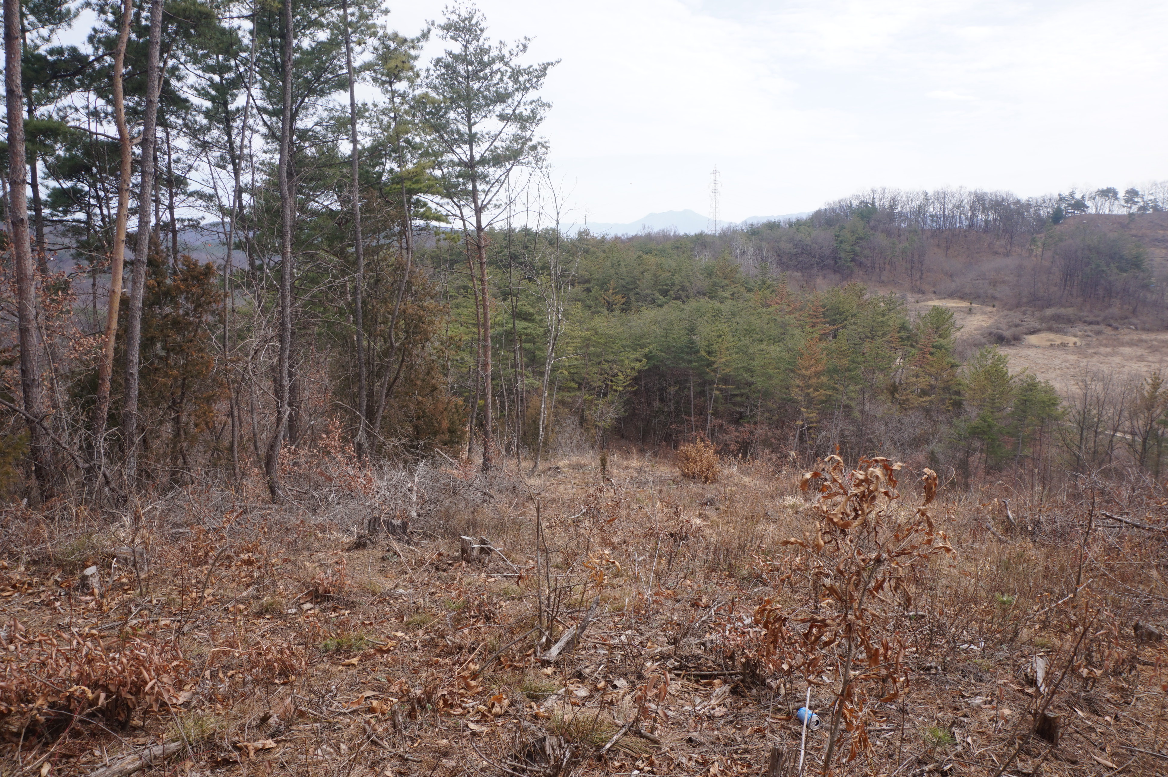 살짝 우측으로 내려서니 키 큰 소나무 사이로 봄산에서 전령사