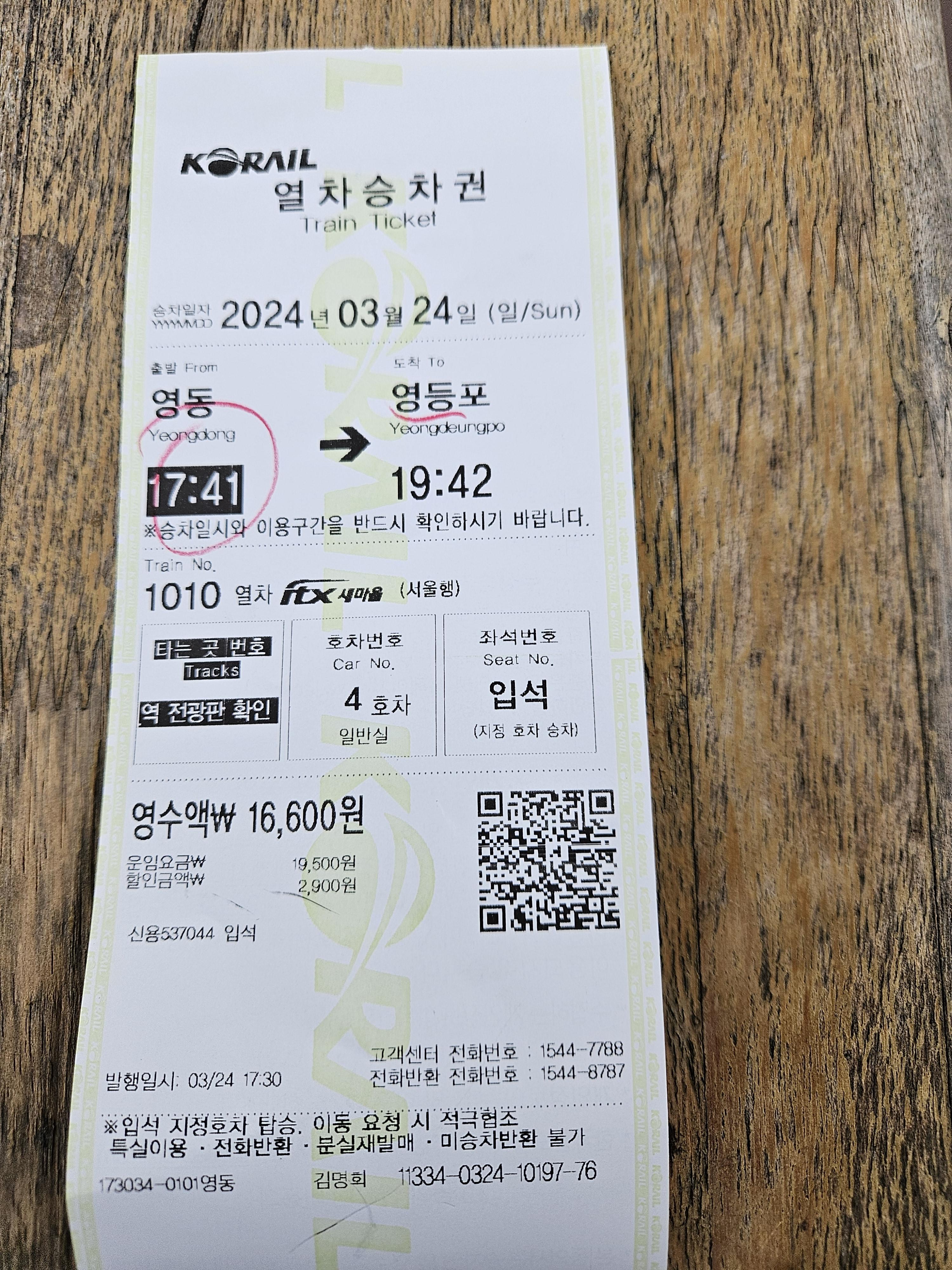 영동발 → 영등포행 입석 열차표