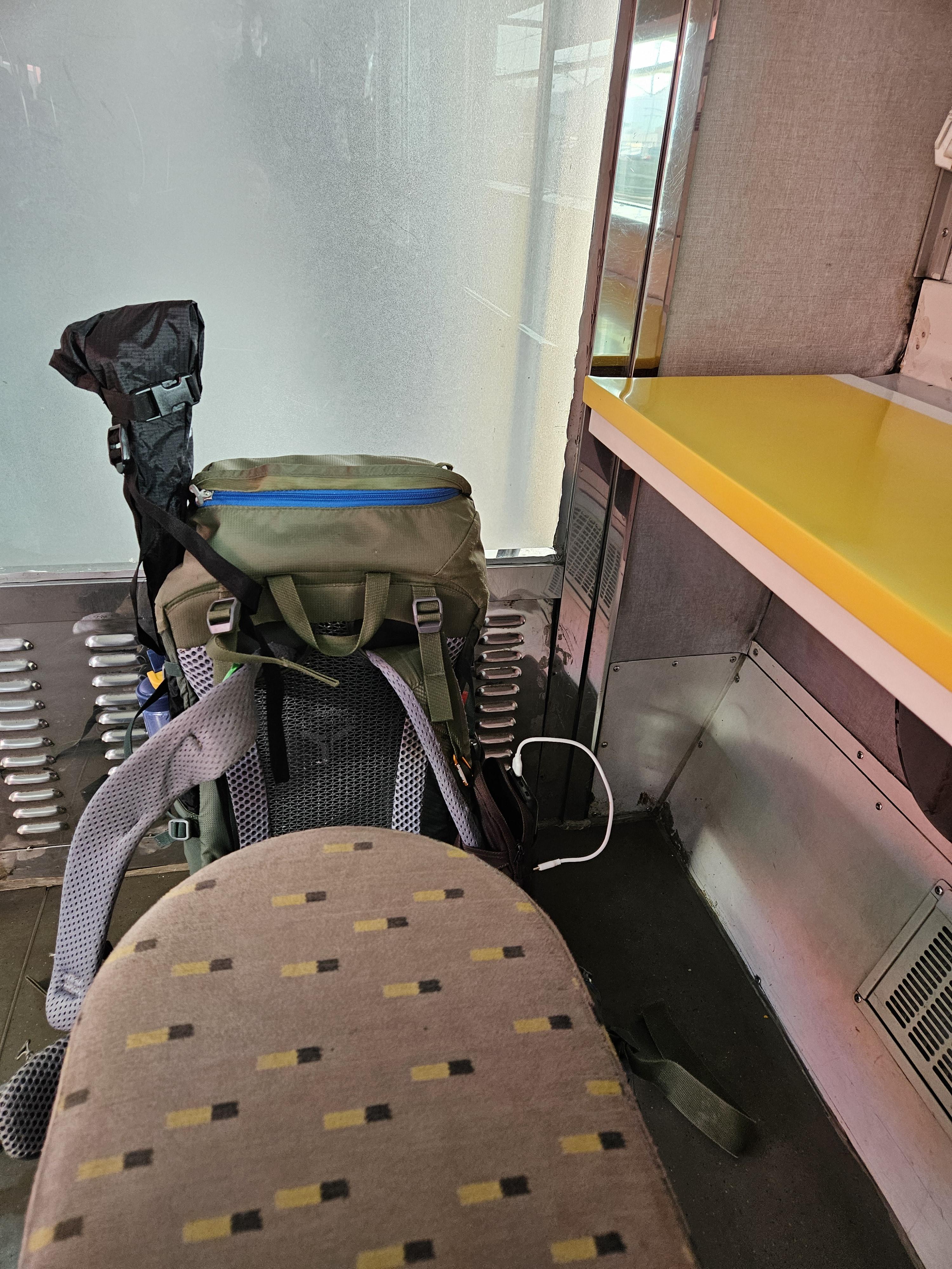 식당칸 의자에 앉아서 산에서 먹지못한 음식으로 베낭털이를 하고