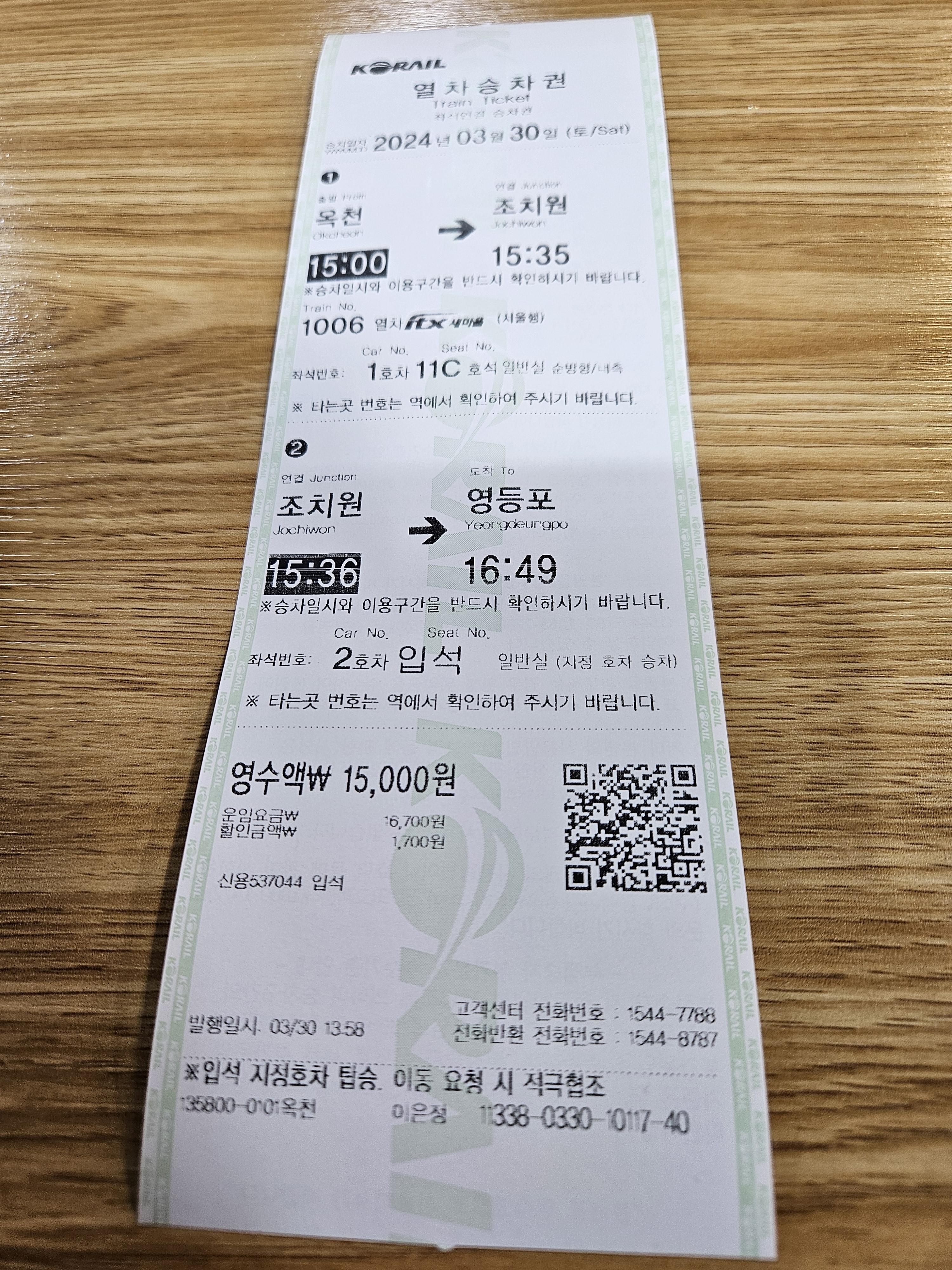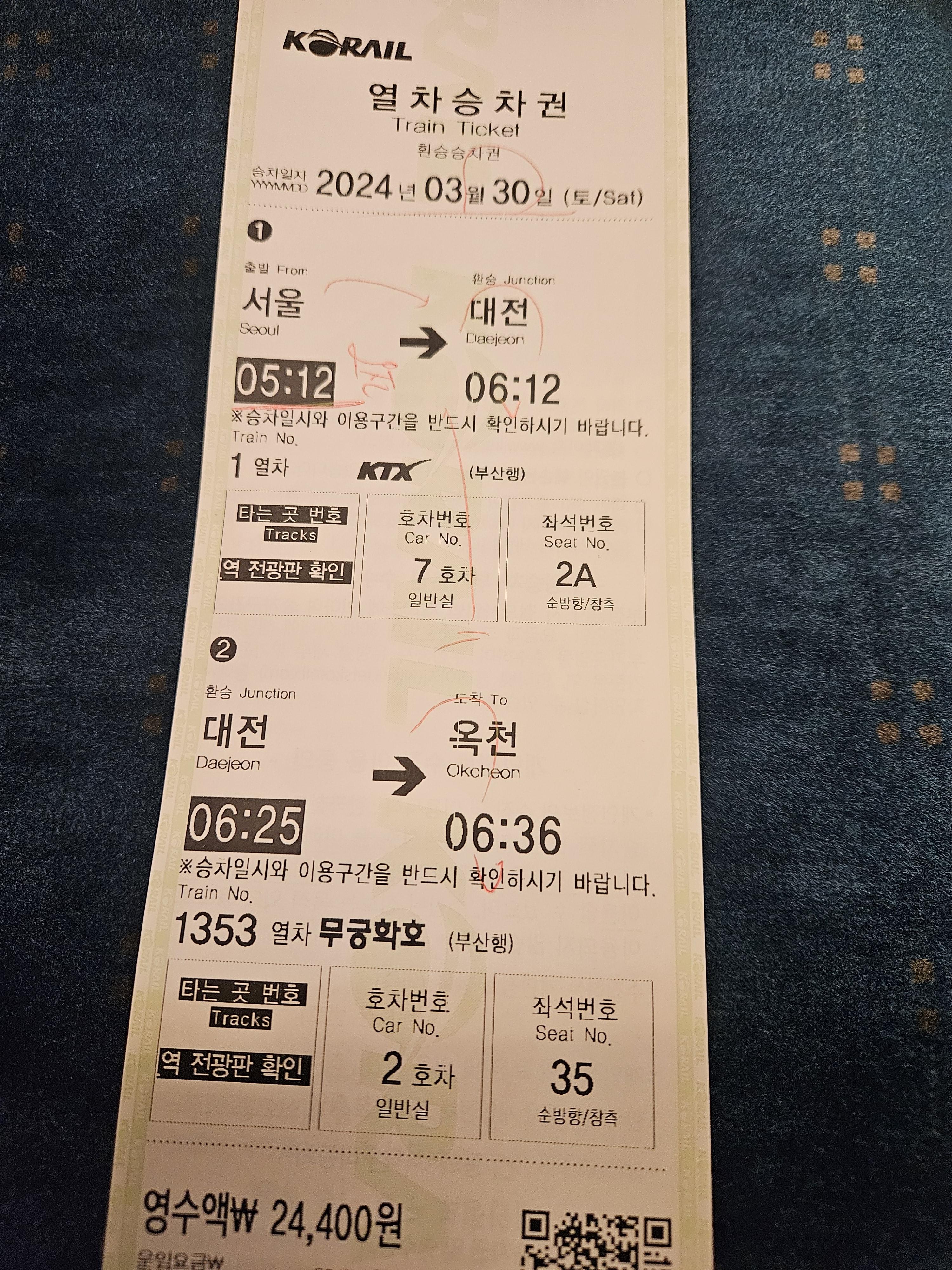 서울역 → 대전역 → 옥천역 환승 열차표