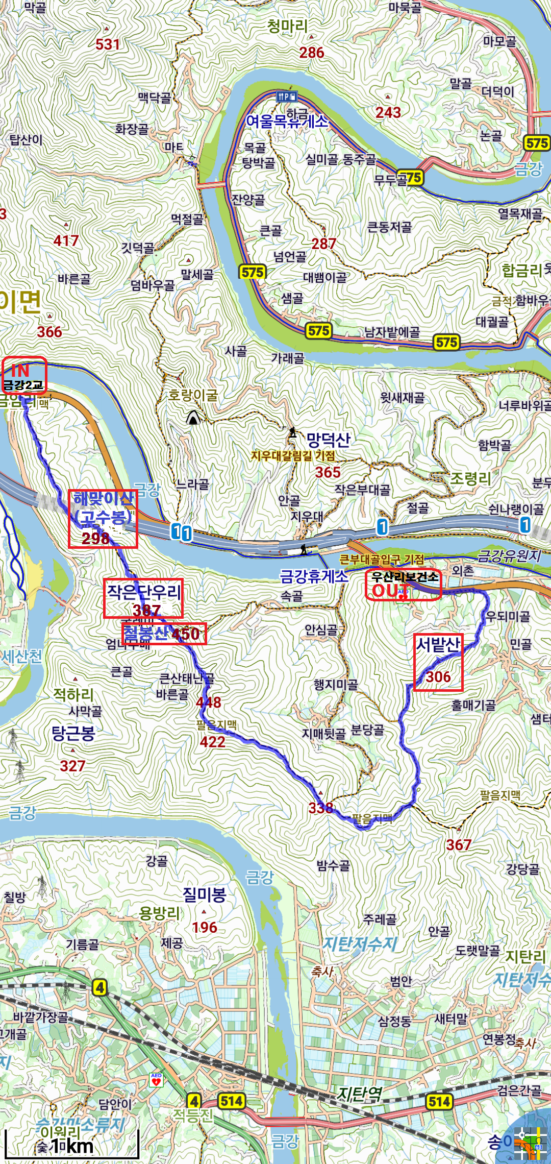 오늘 산행구간의 지도