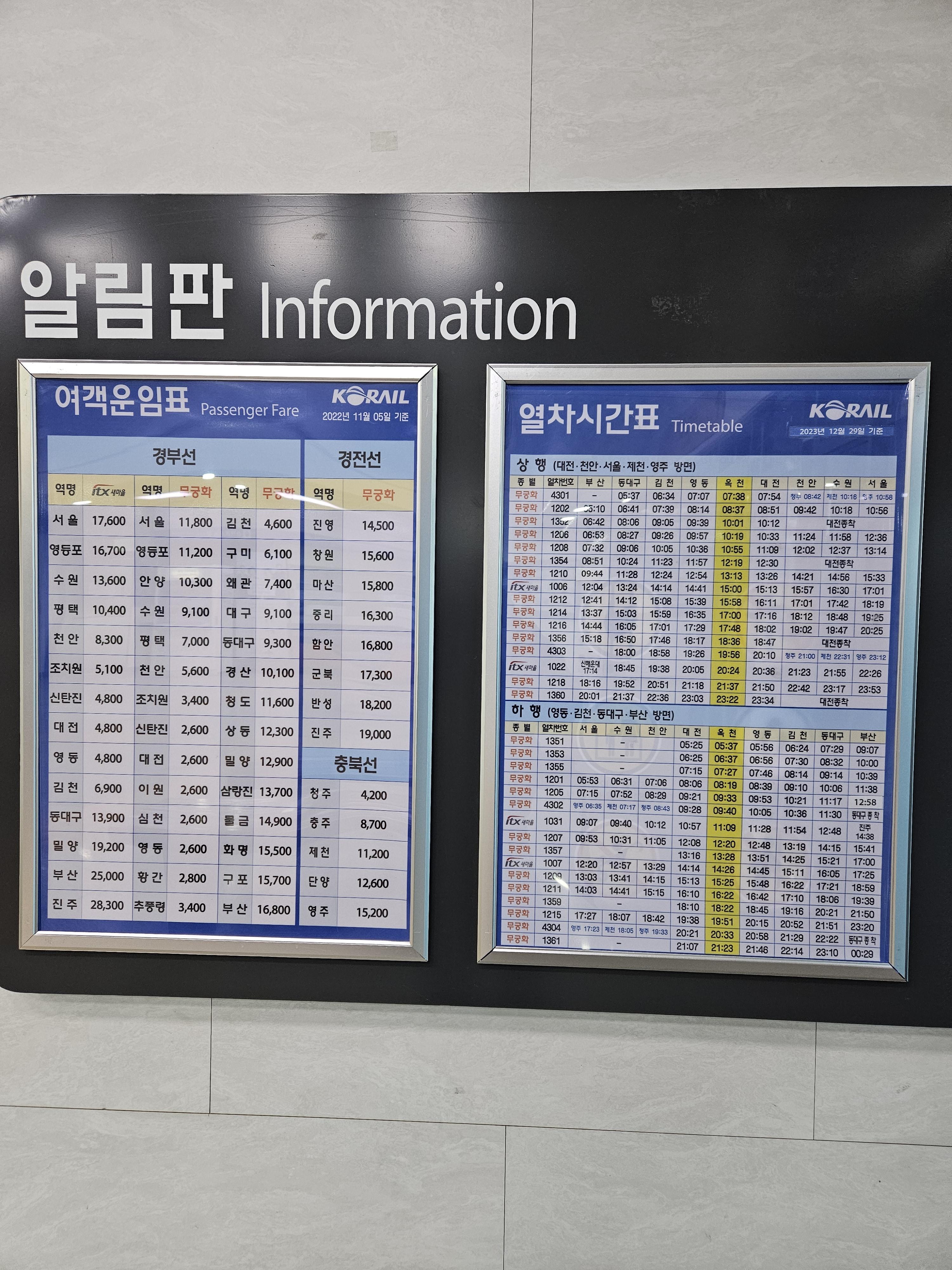 옥천역 열차 운임표와 시간표