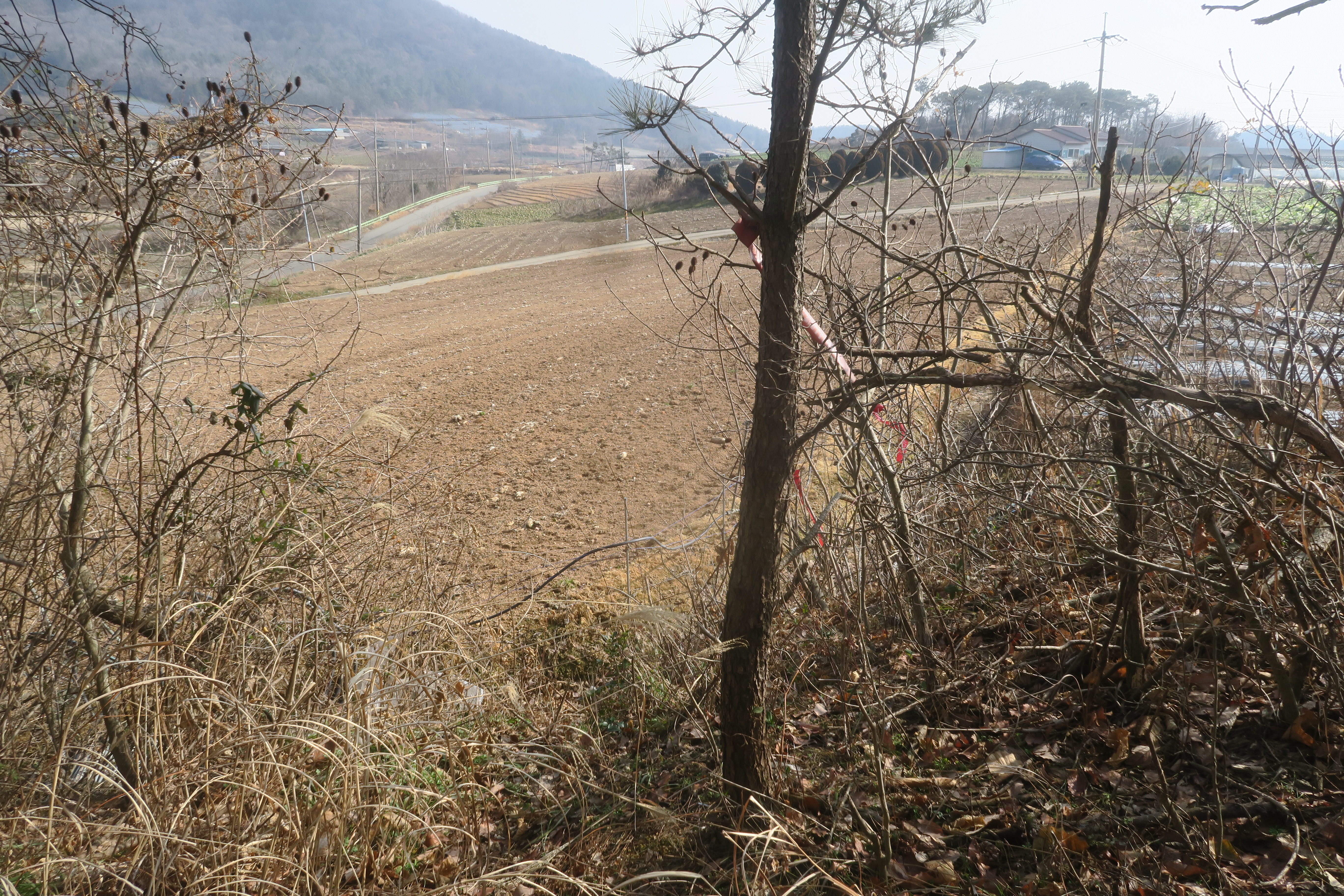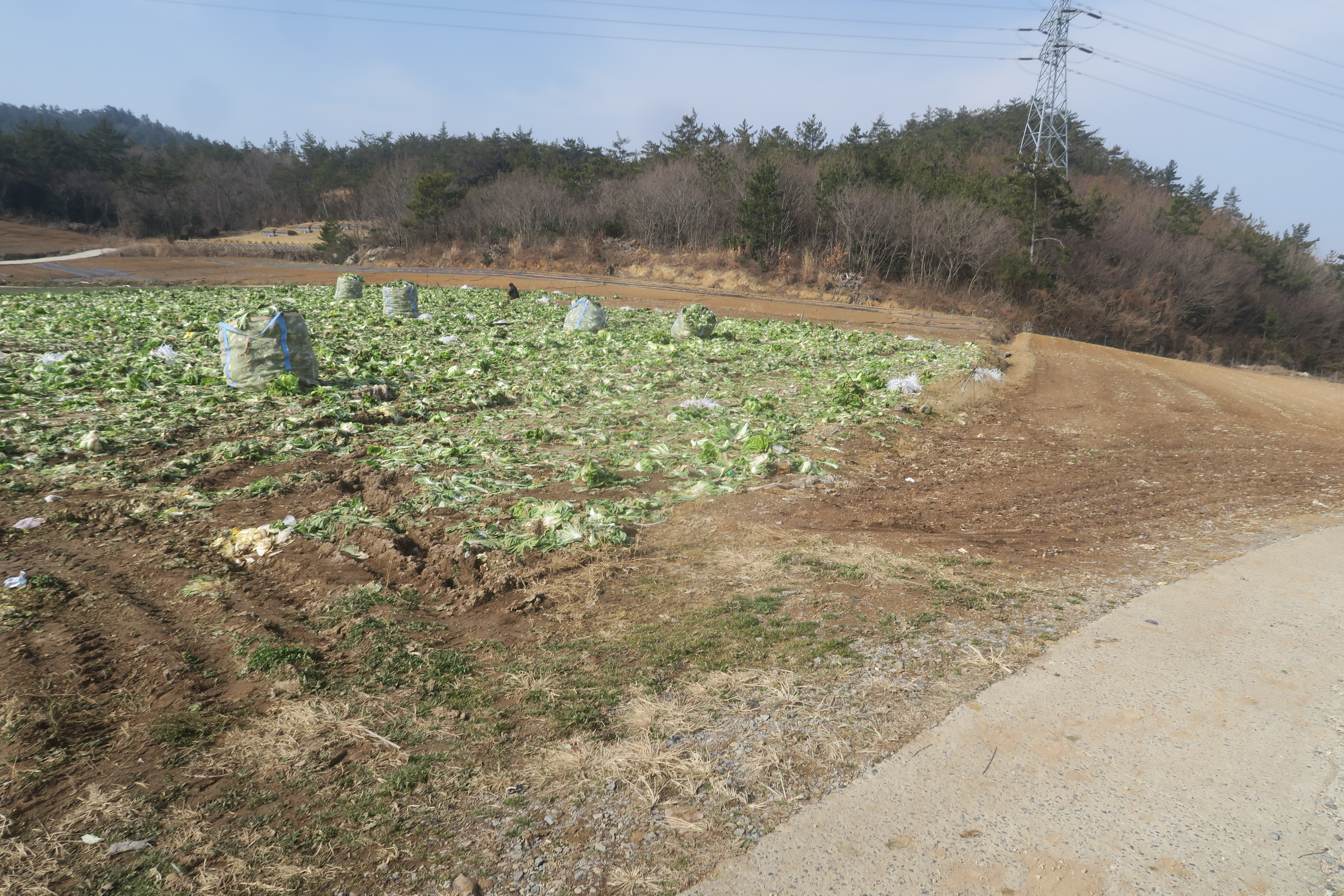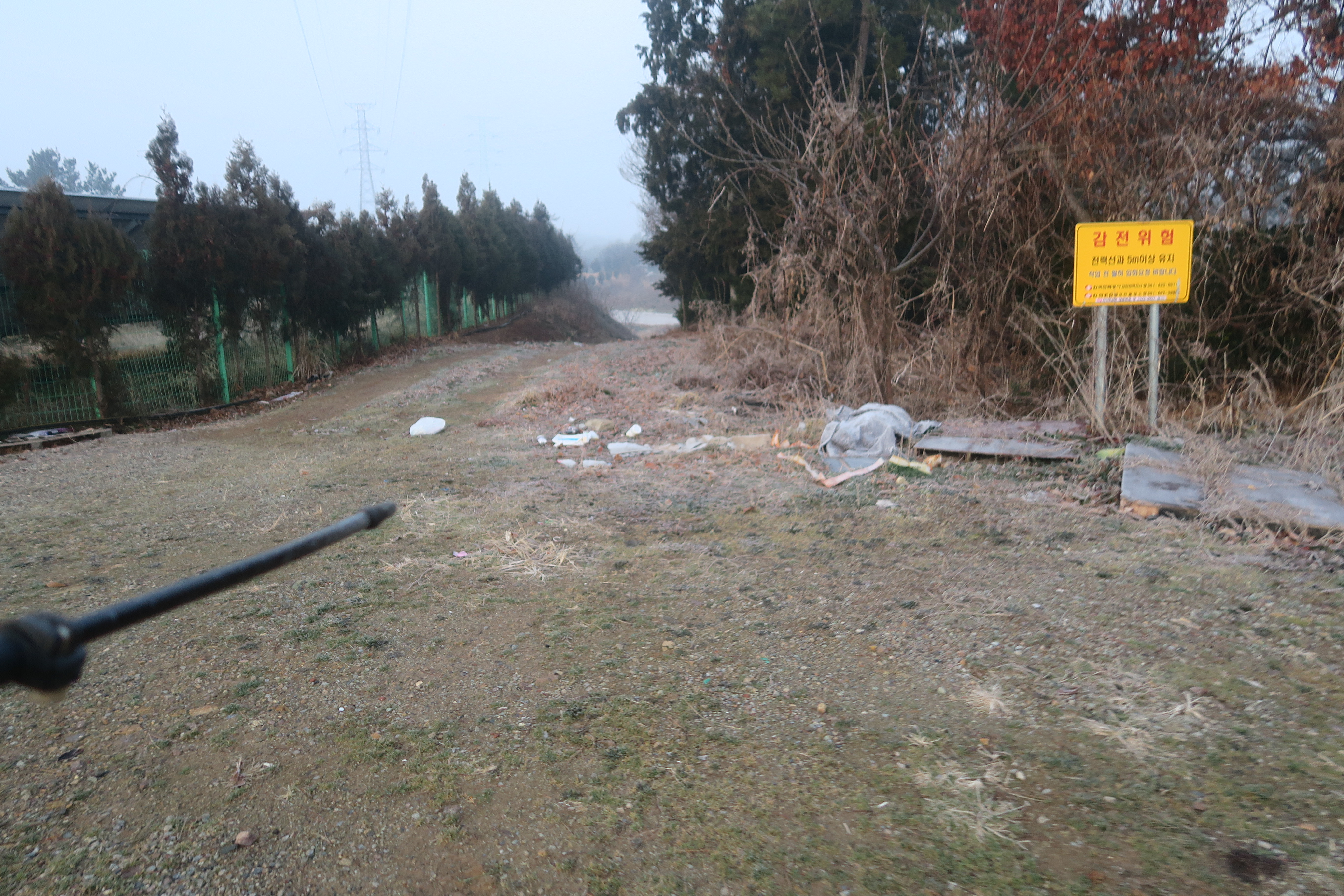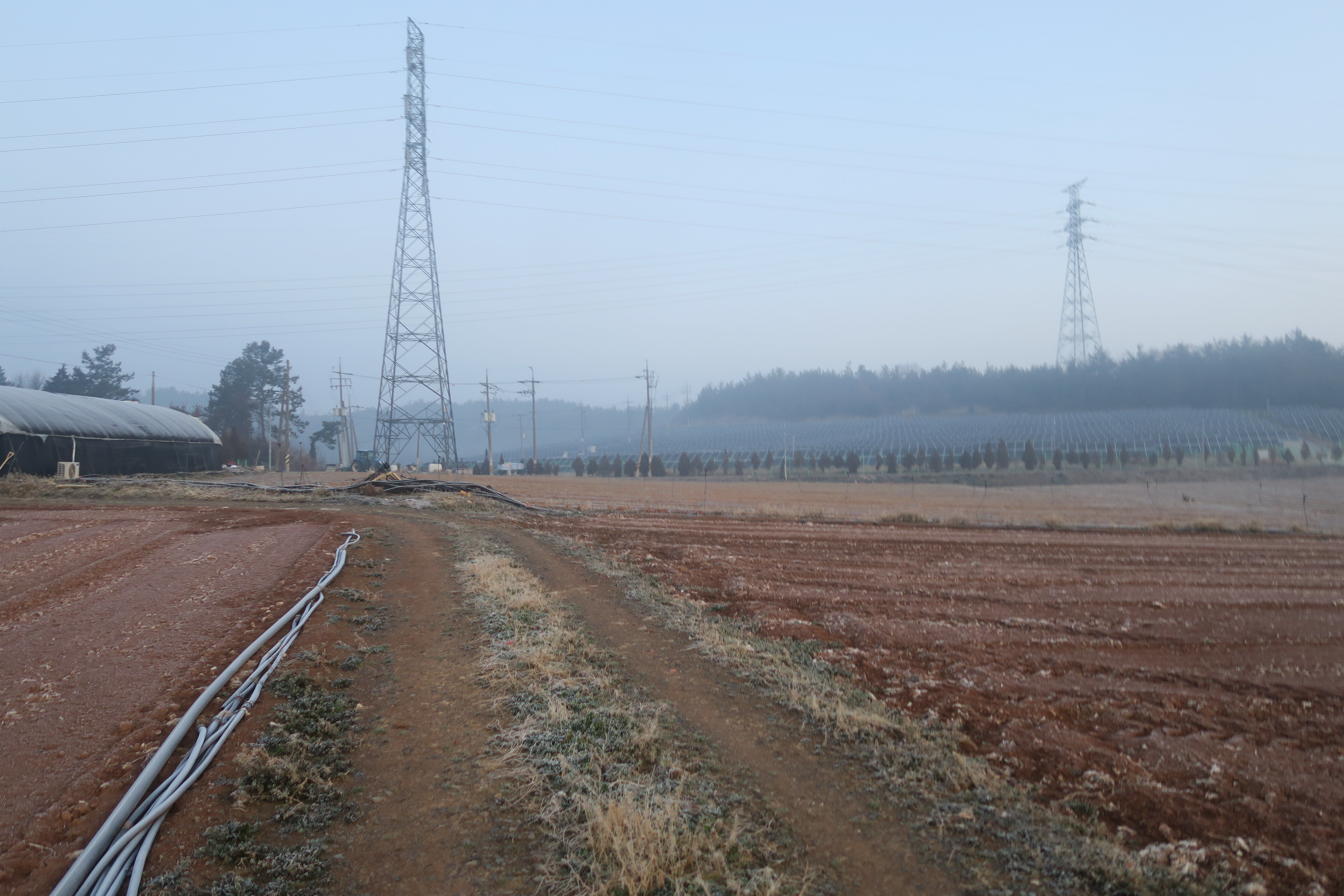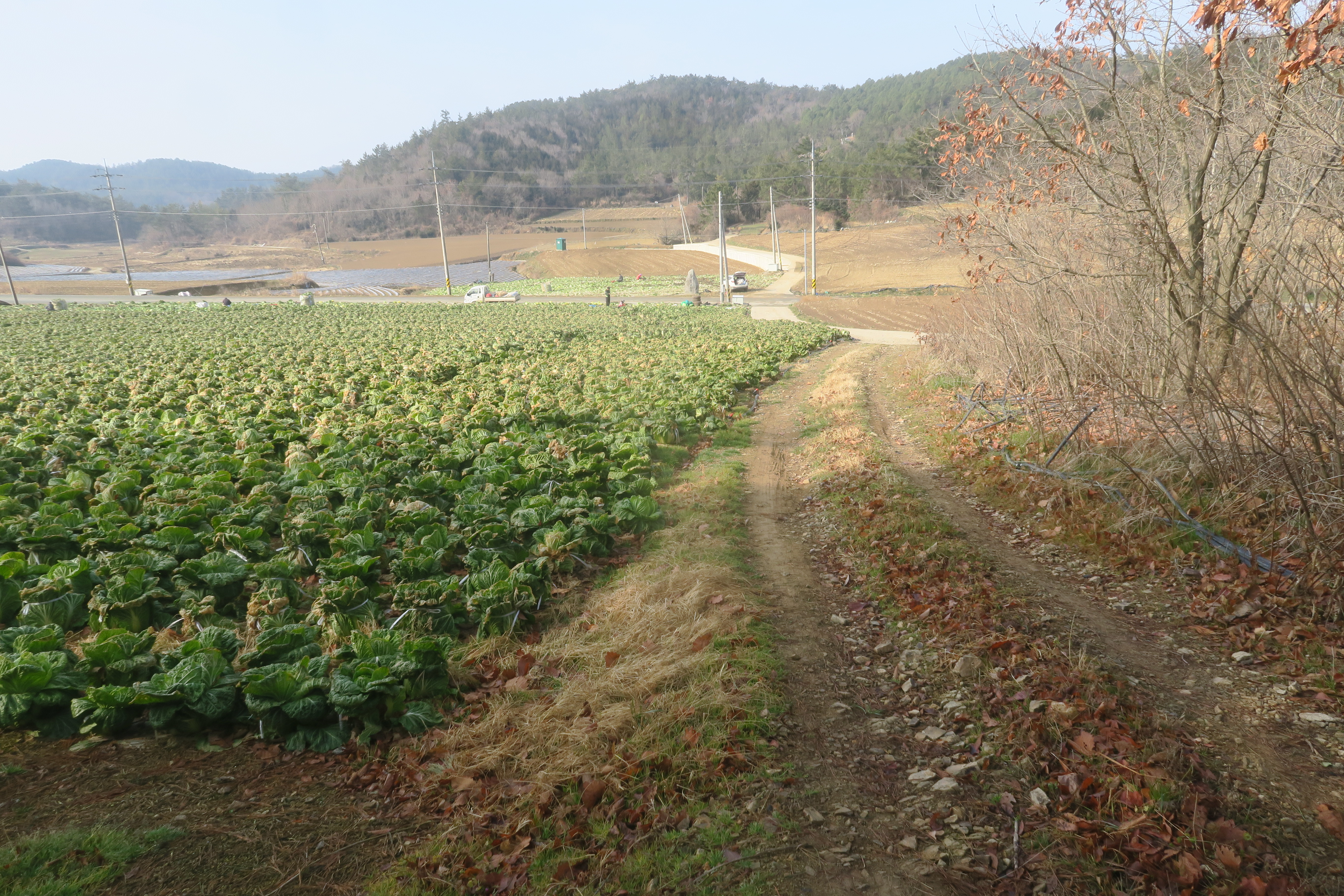 앞에 보이는 송전탑을 포스트 삼아 밭가운데의 농로로 이어지는