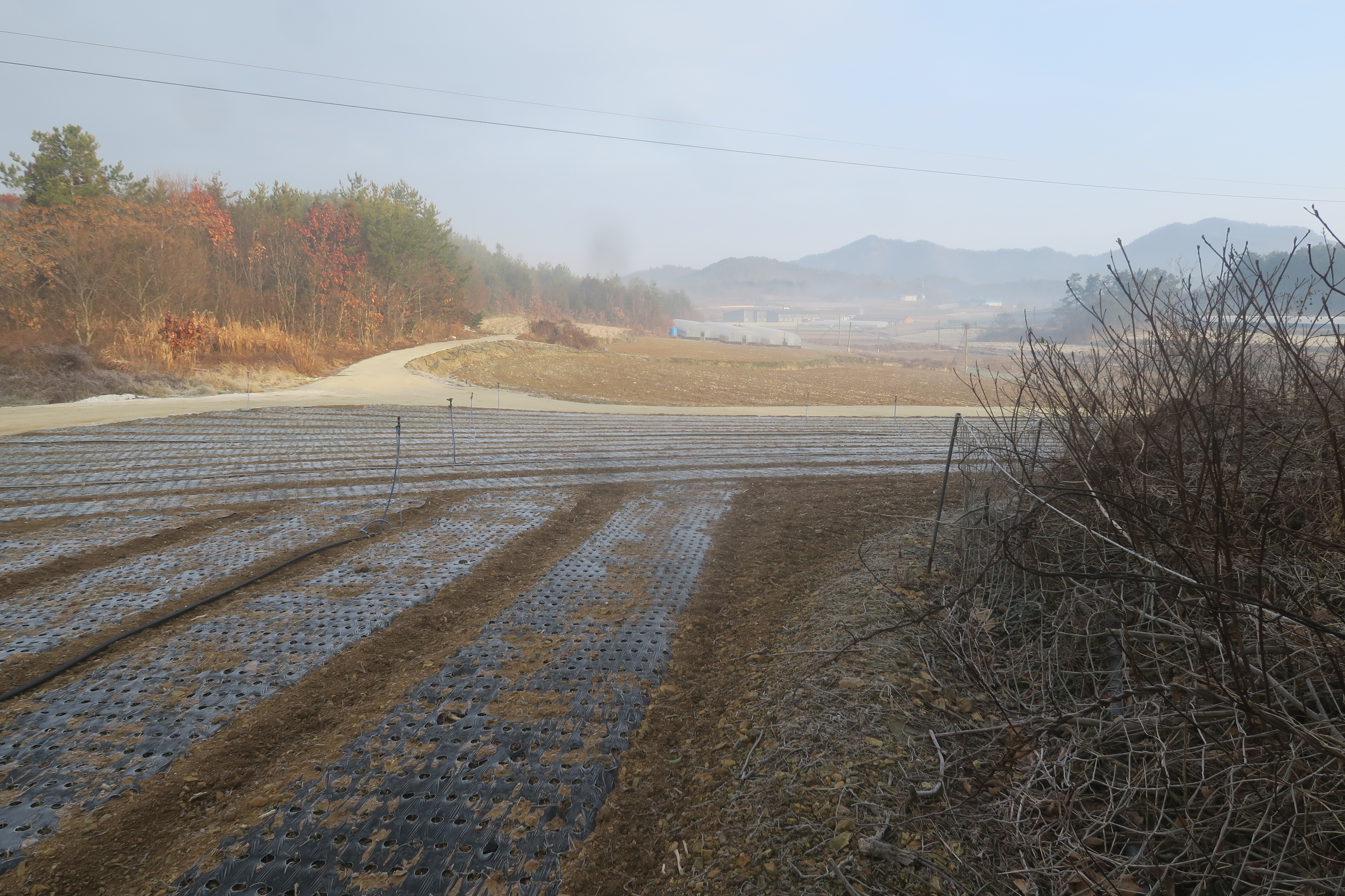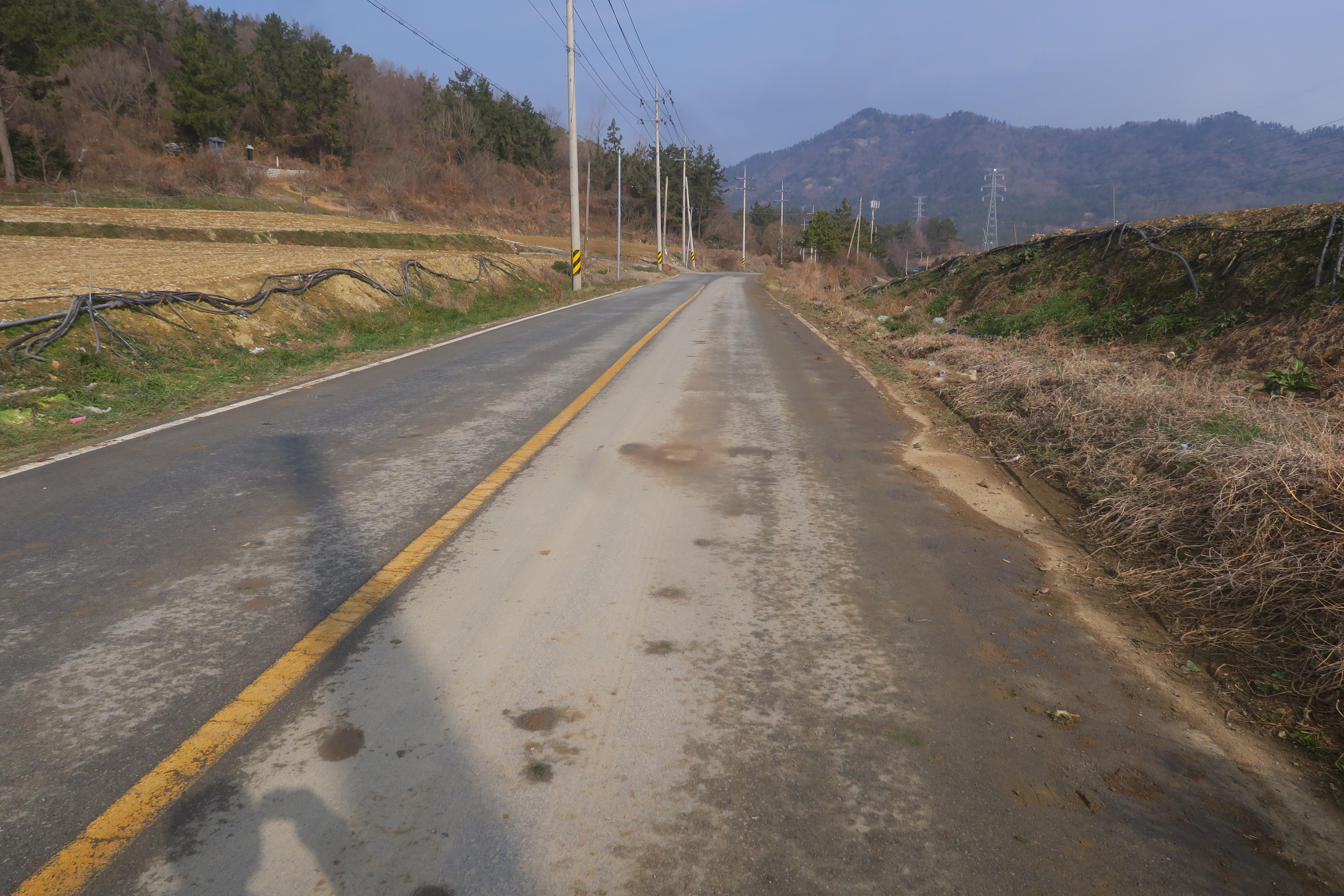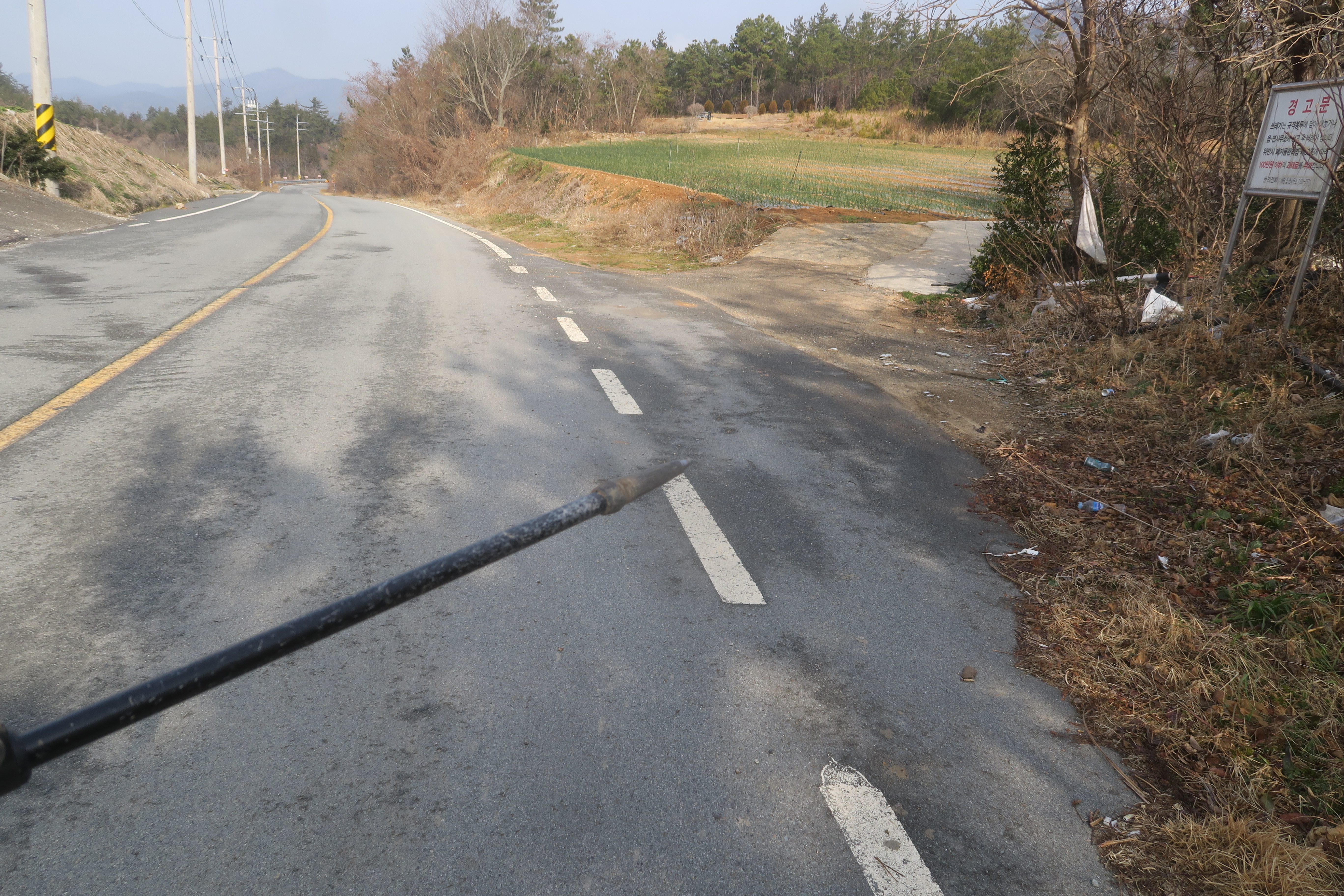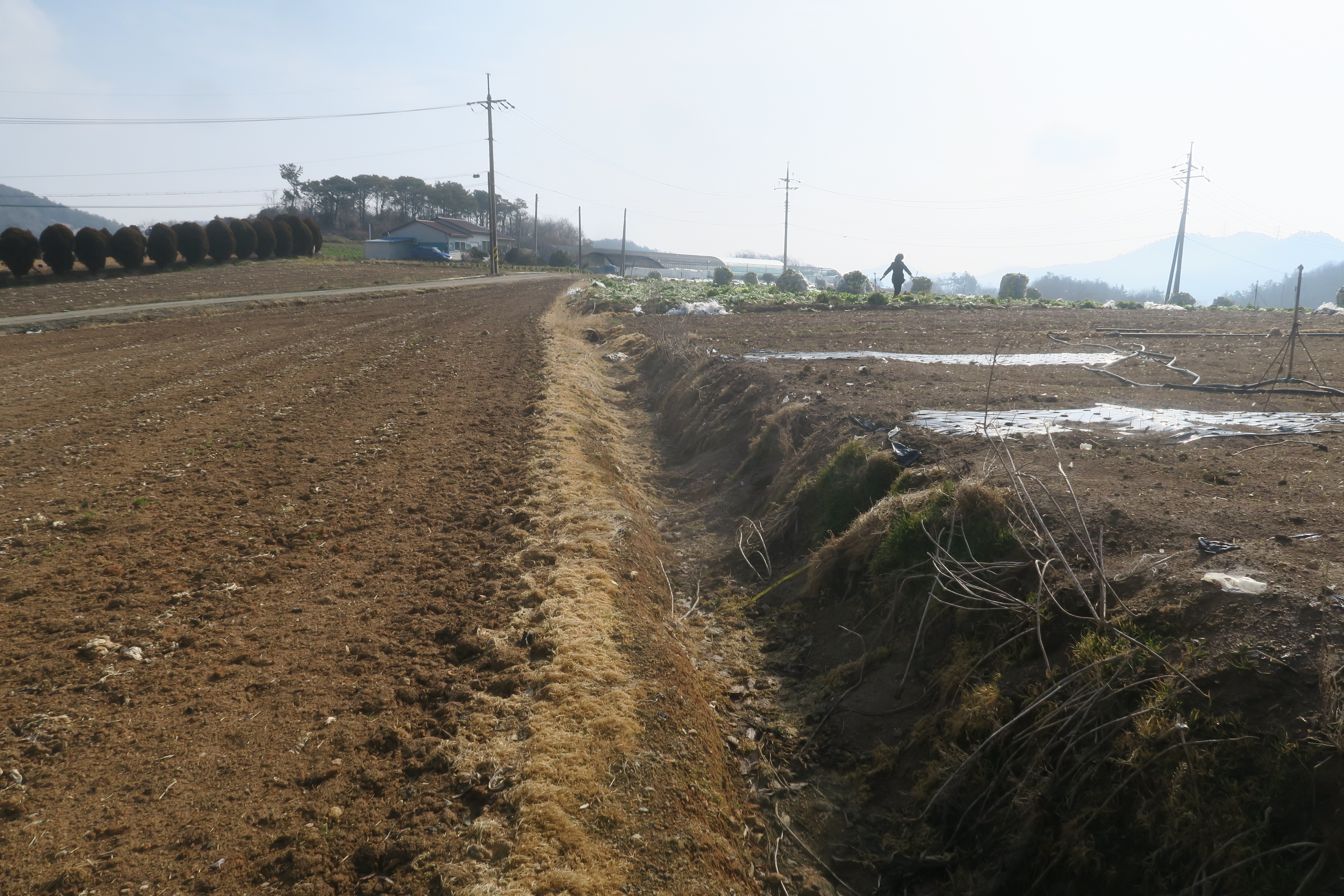 앞에 보이는 송전탑을 포스트 삼아 밭가운데의 농로로 이어지는