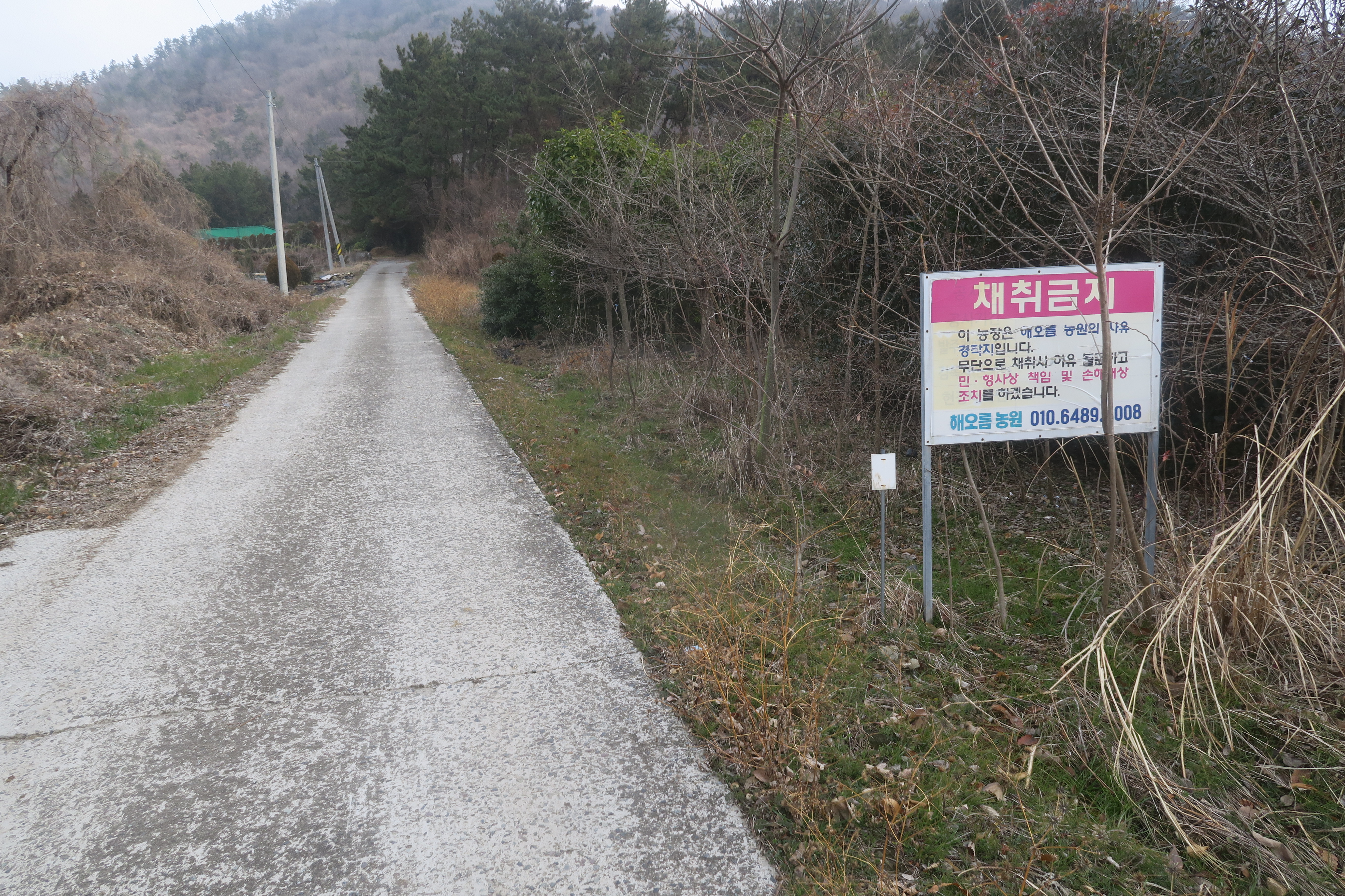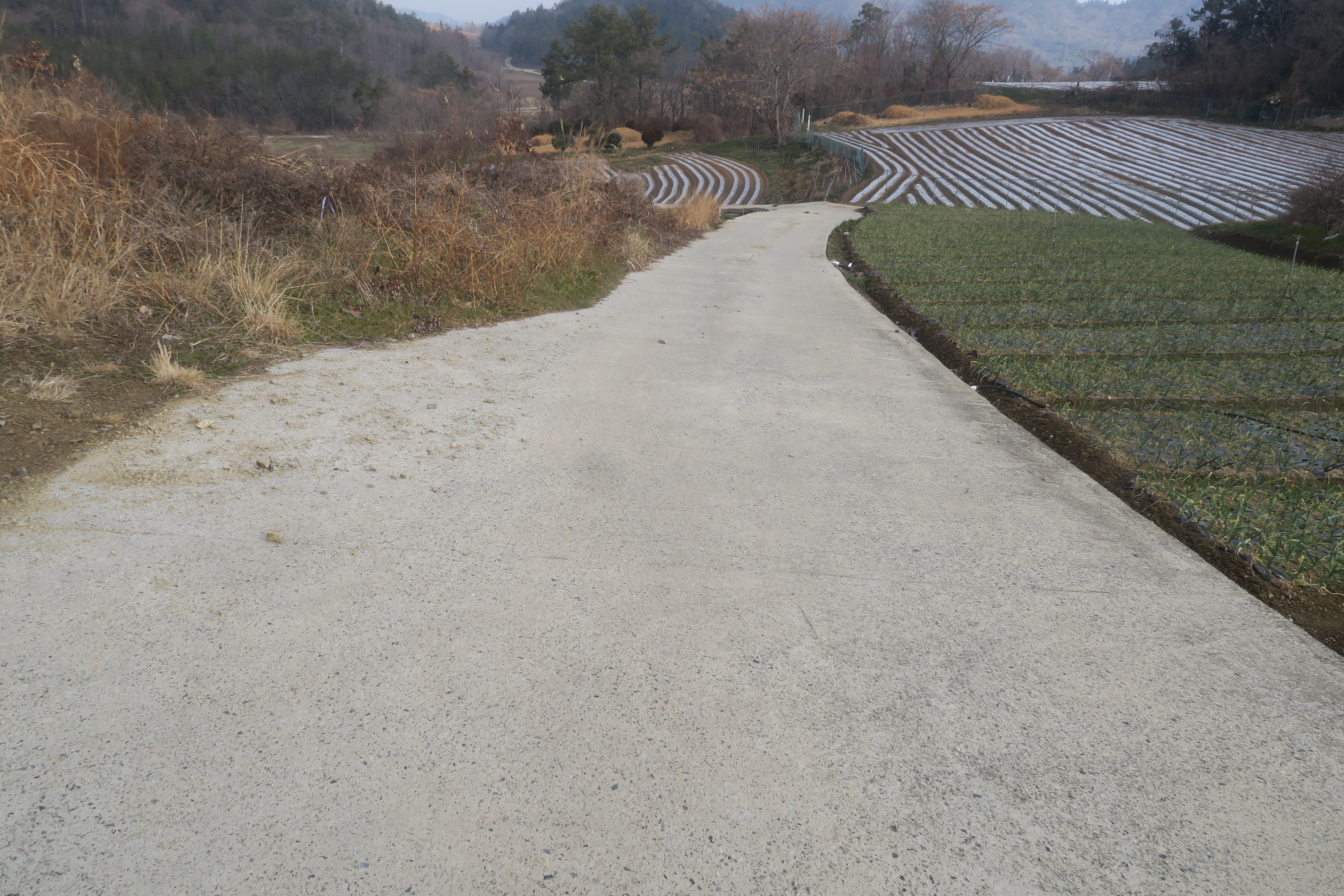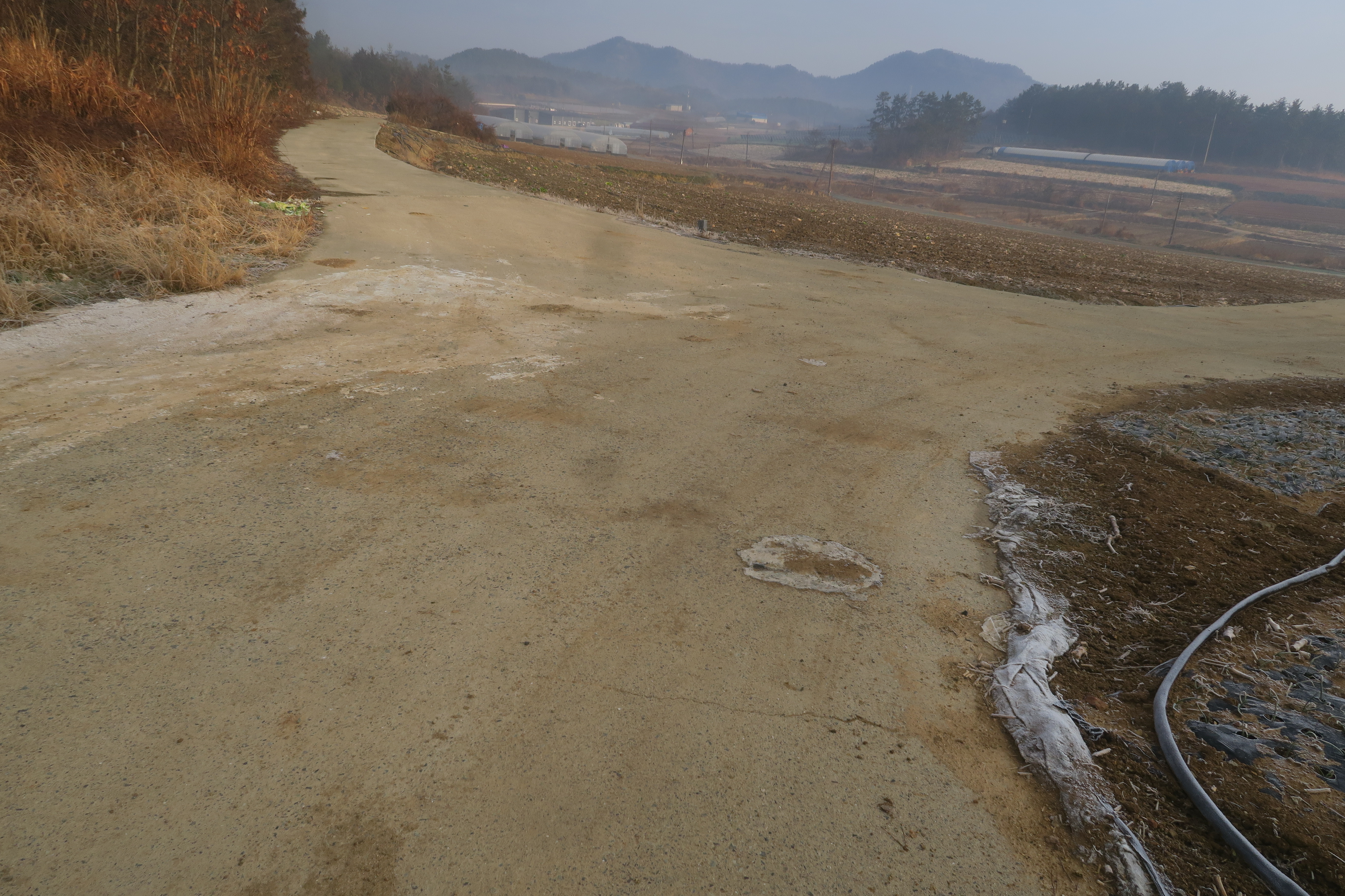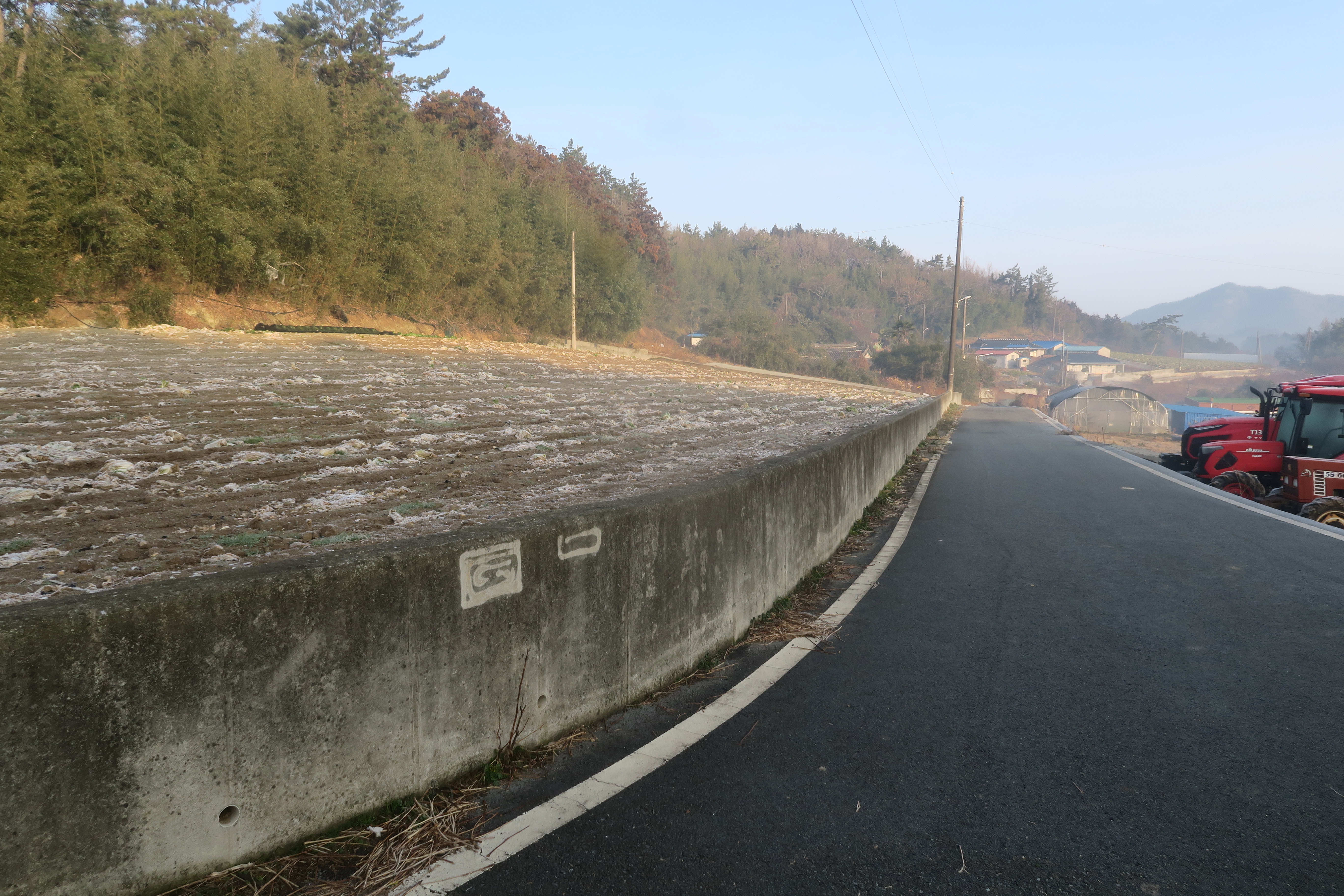 민가와 비닐하우스을 끼고 가는 시멘트 도로를 따라서 간다