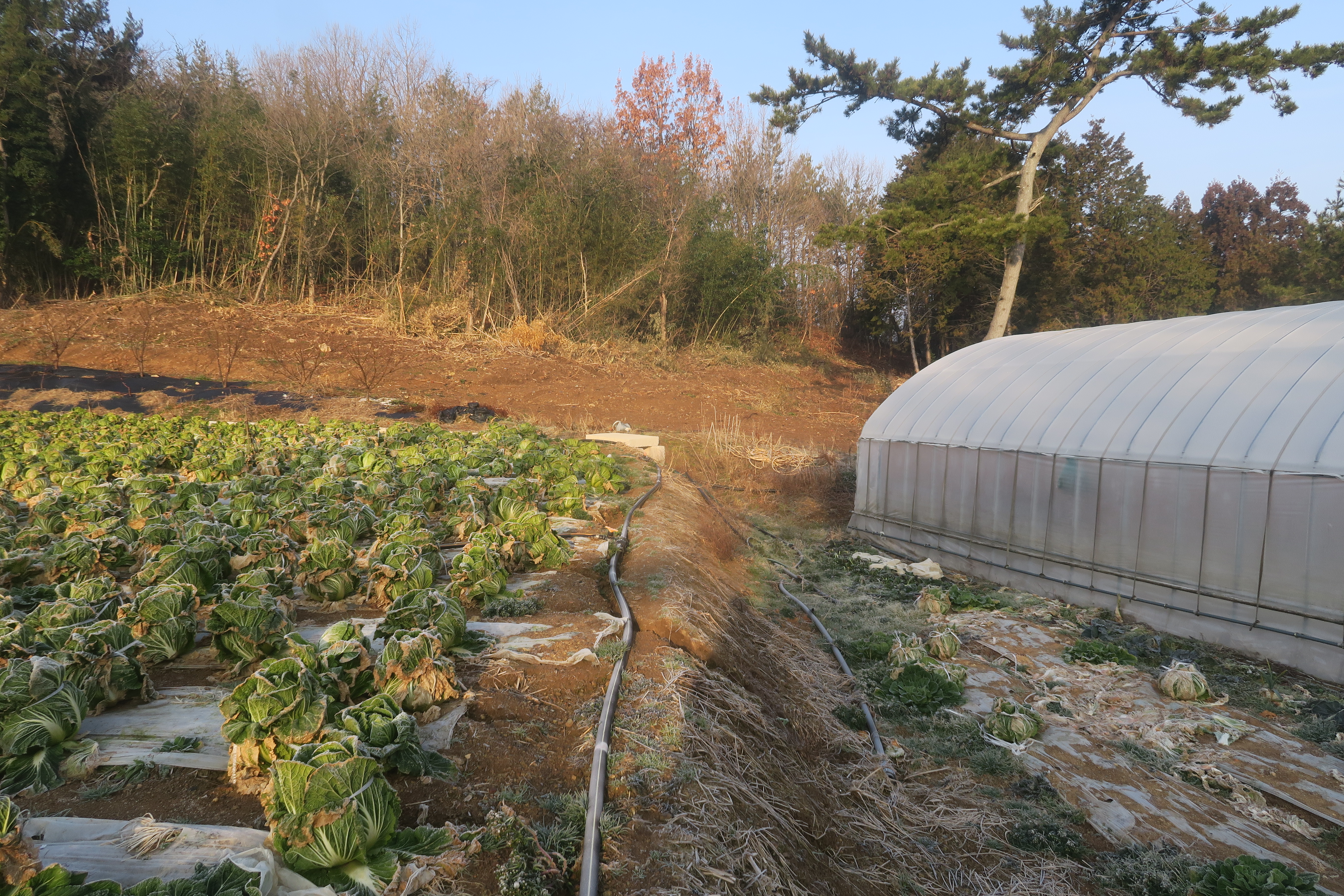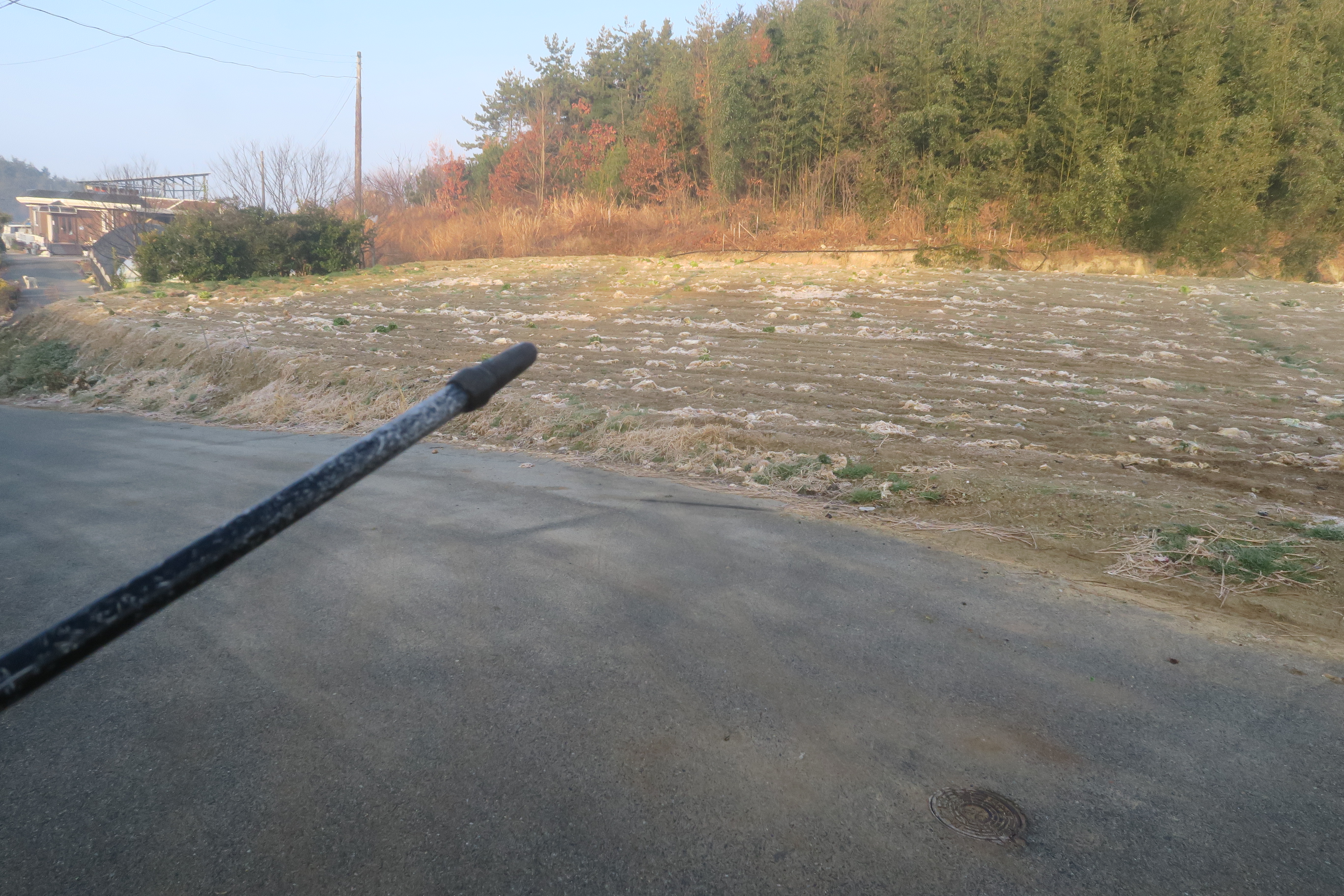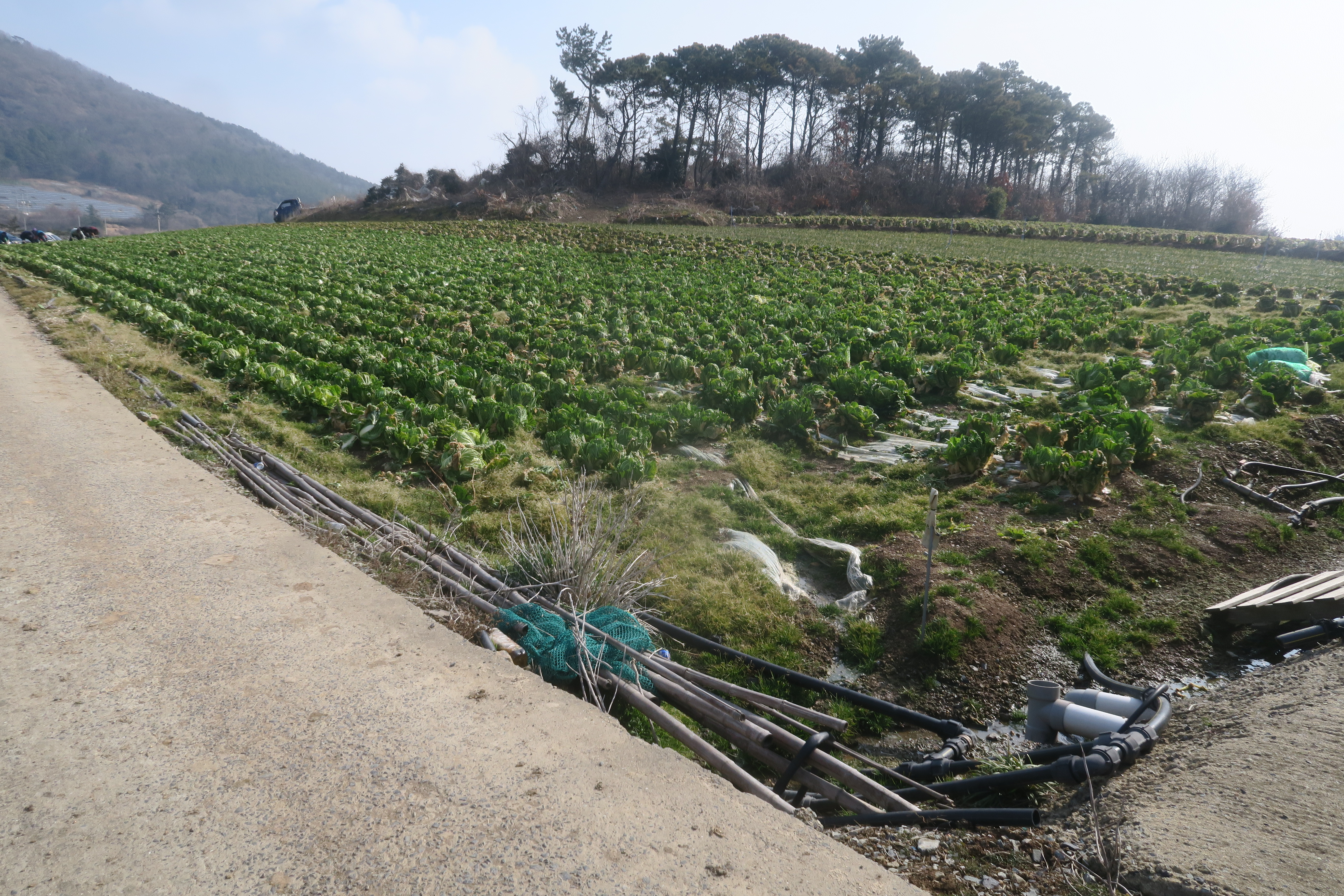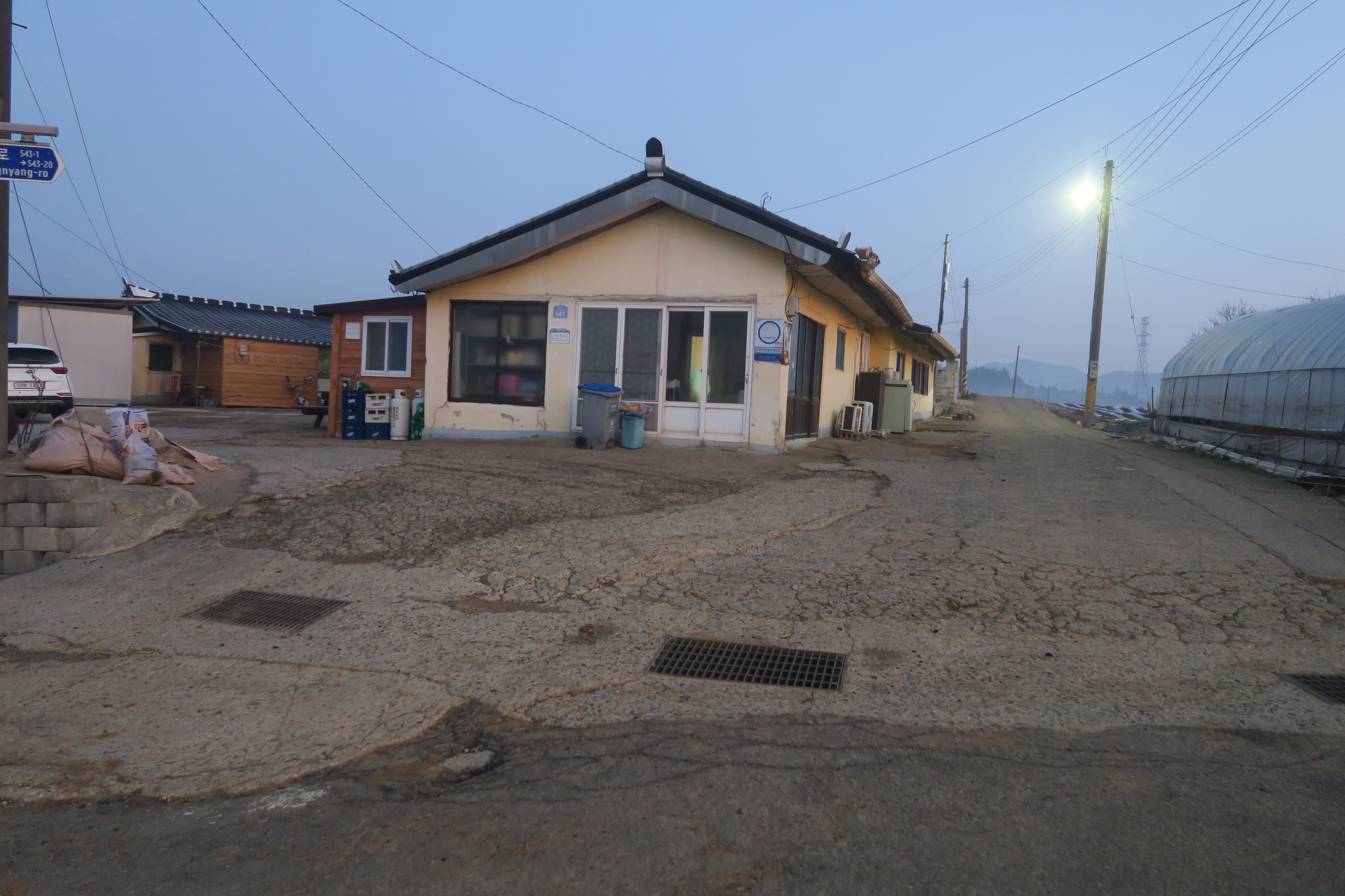 민가와 비닐하우스을 끼고 가는 시멘트 도로를 따라서 간다