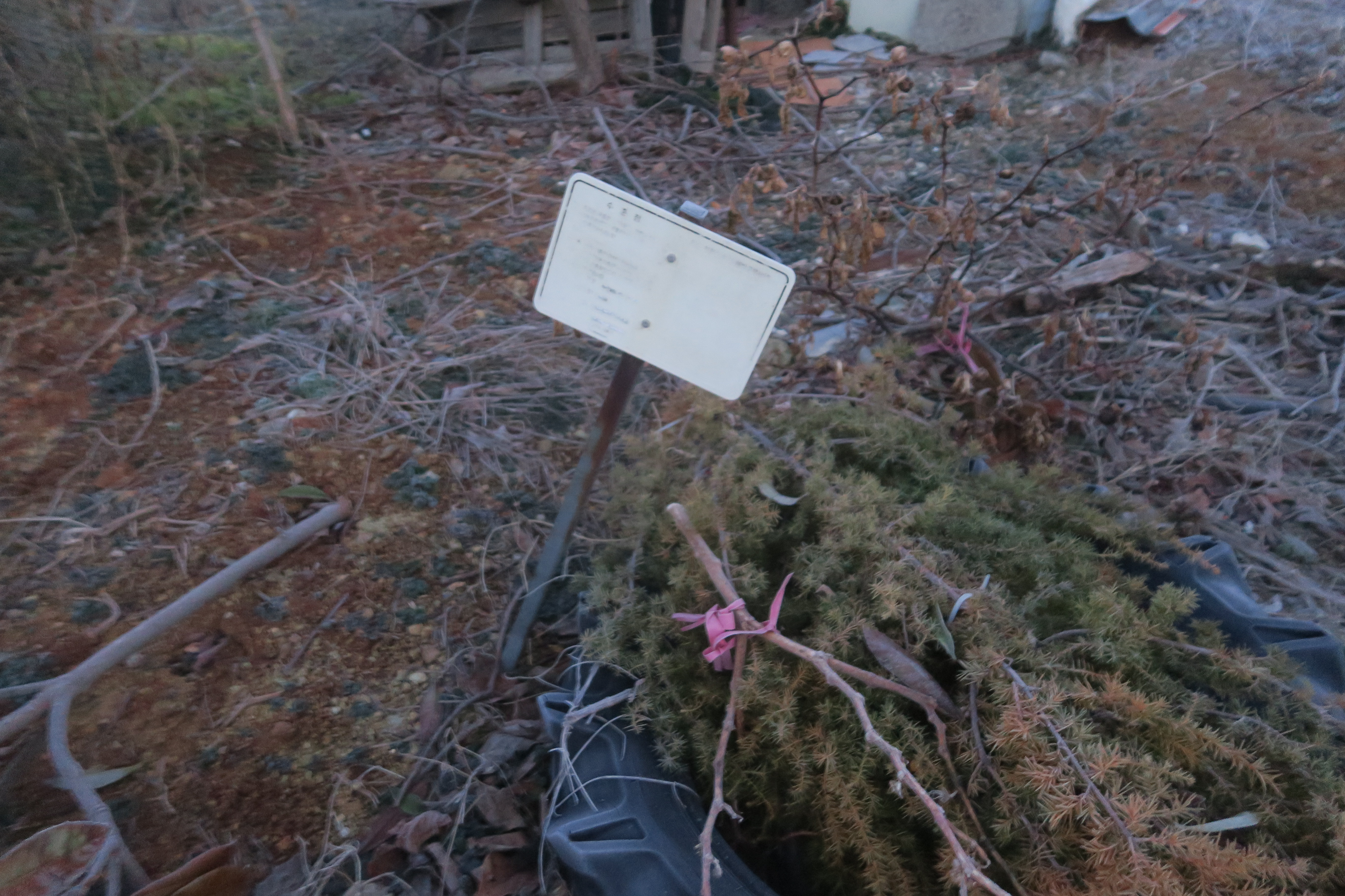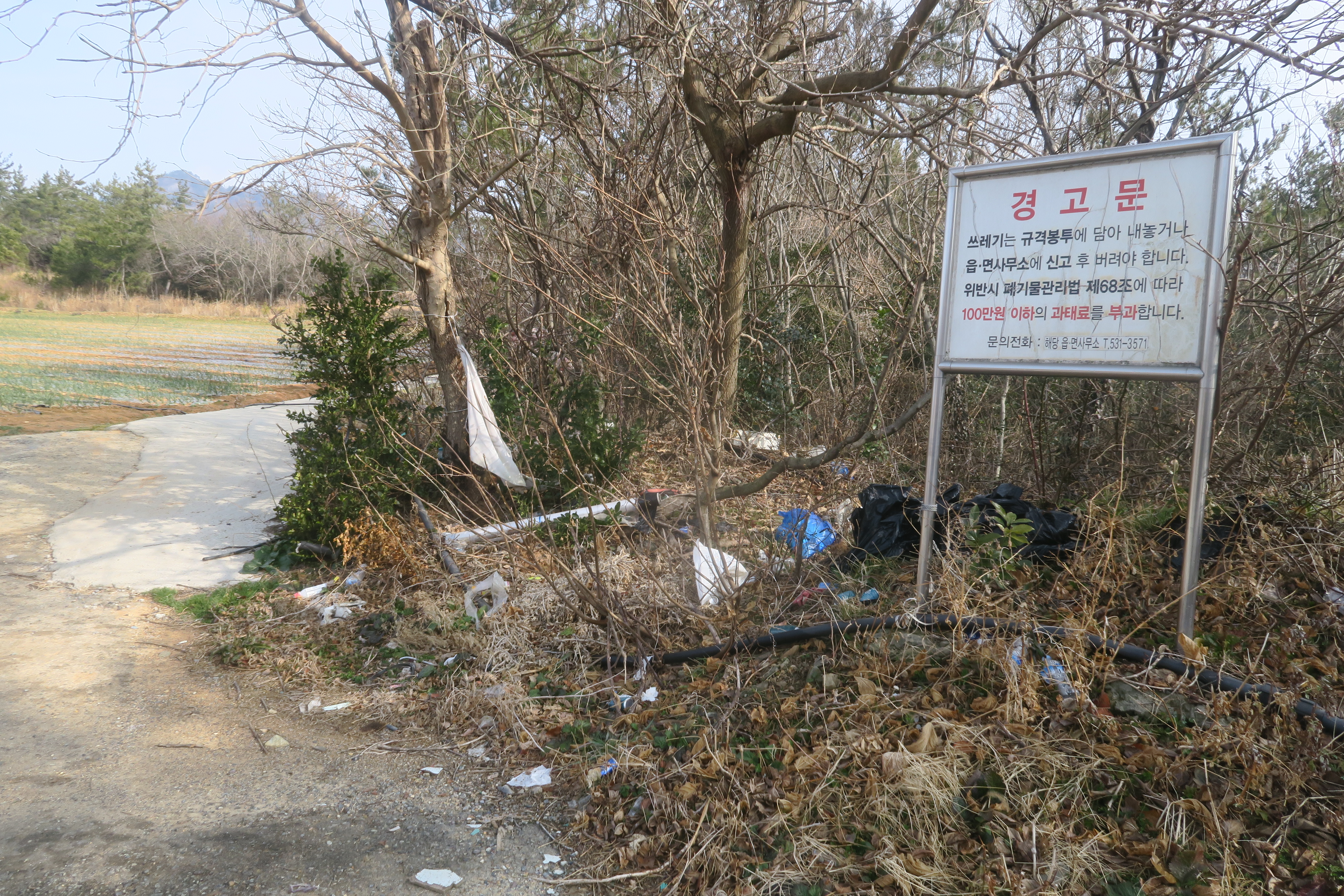 서 있고, 입간판 아래와 관리가 안되어 있는 수준점이 있다.