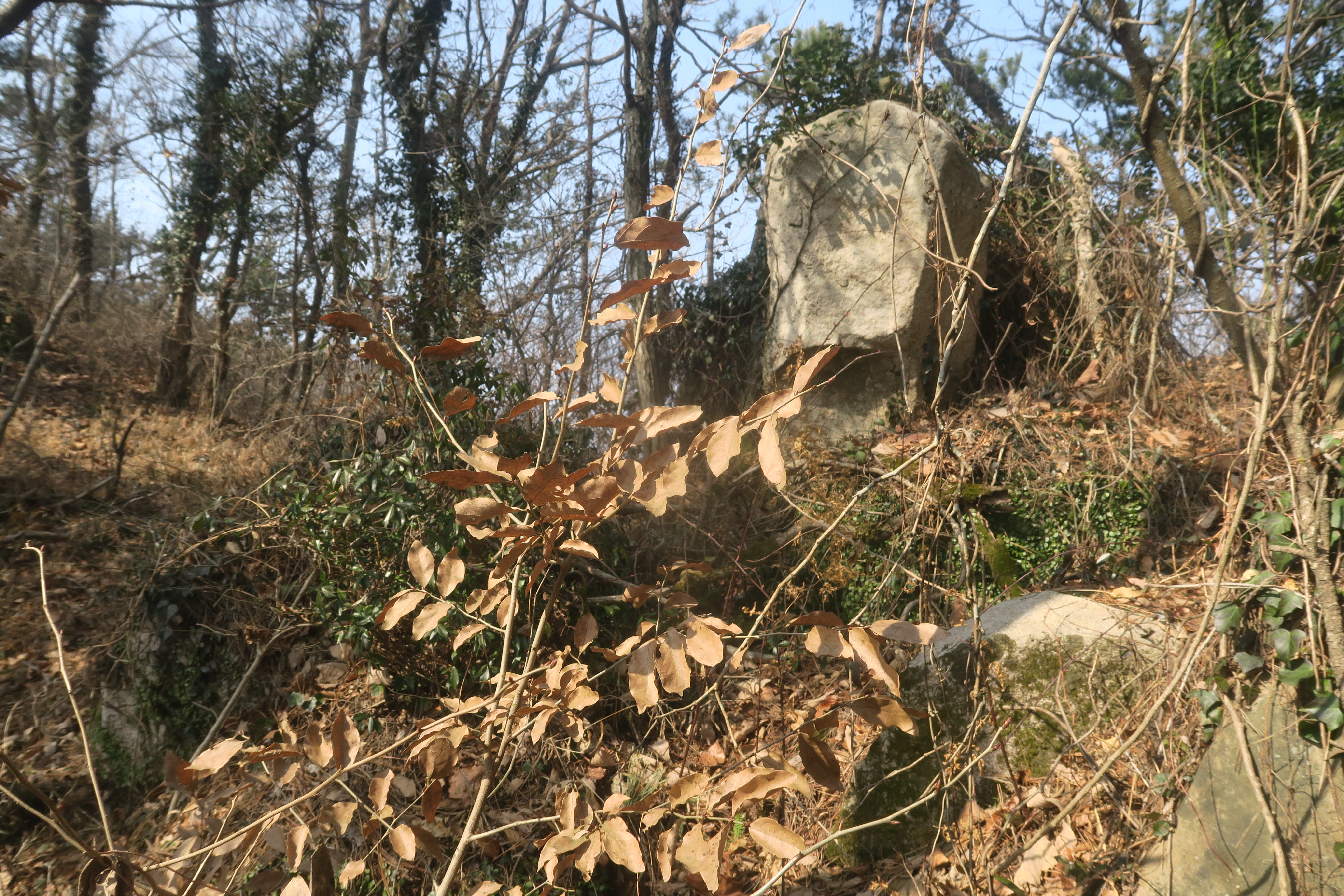 묘지 뒷쪽의 나뭇가지에는 우리나라 지맥길에 있는 봉우리에 이름을