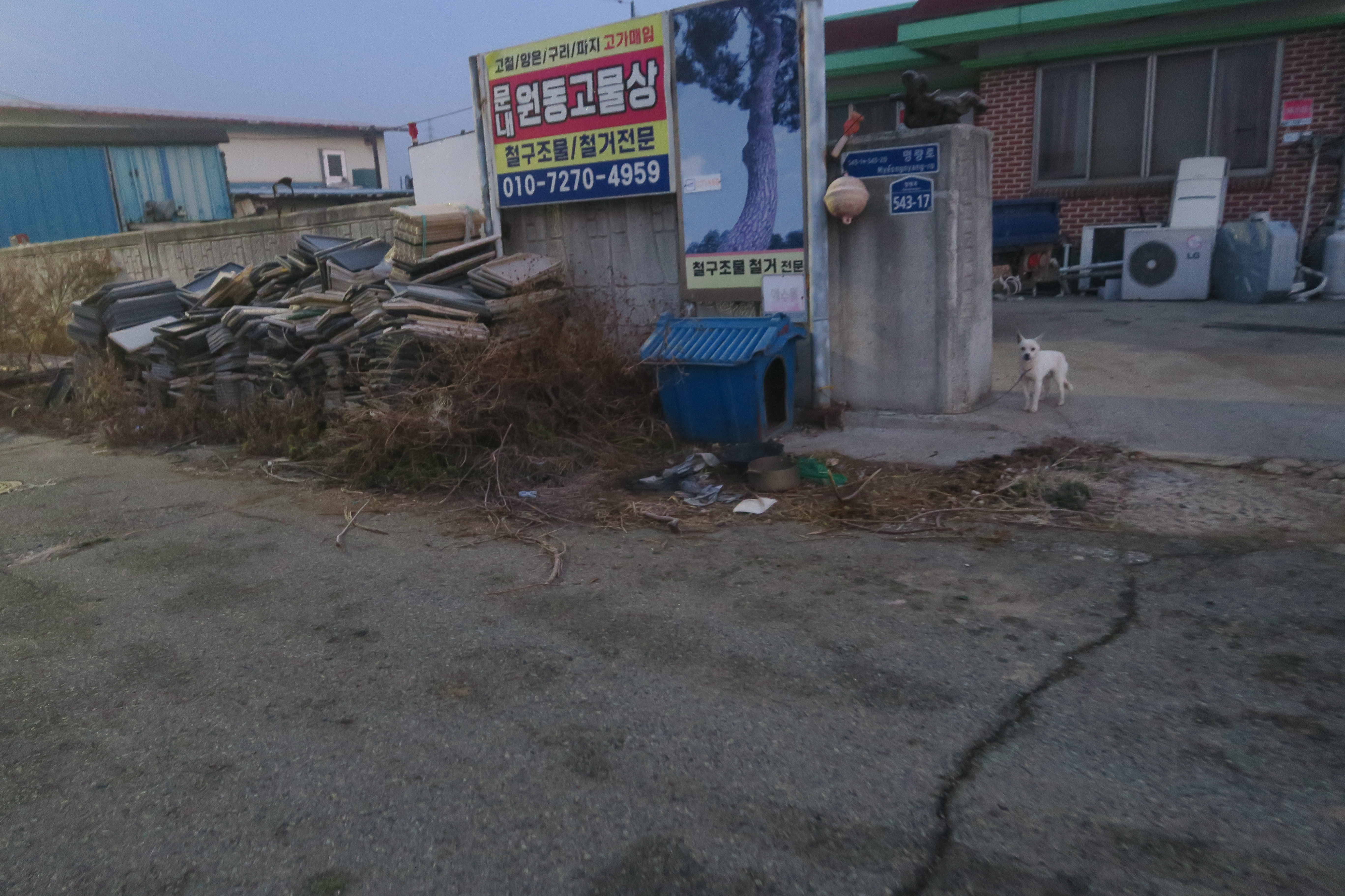 우측의 마을 골목으로 들어서는데 고물상을 지키고 있는
