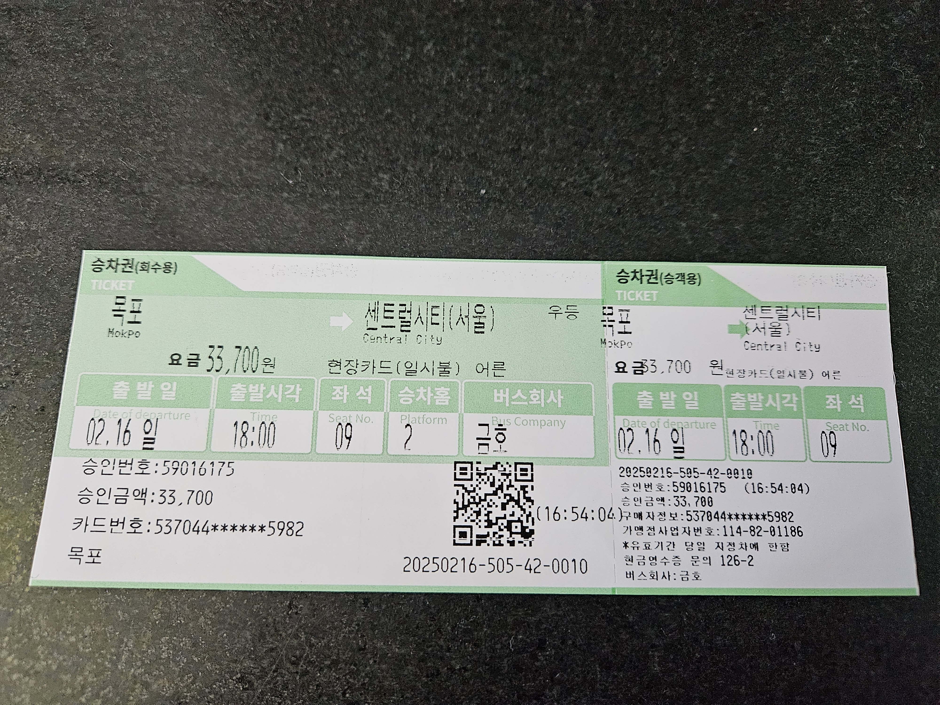 목포발 → 서울행 버스표