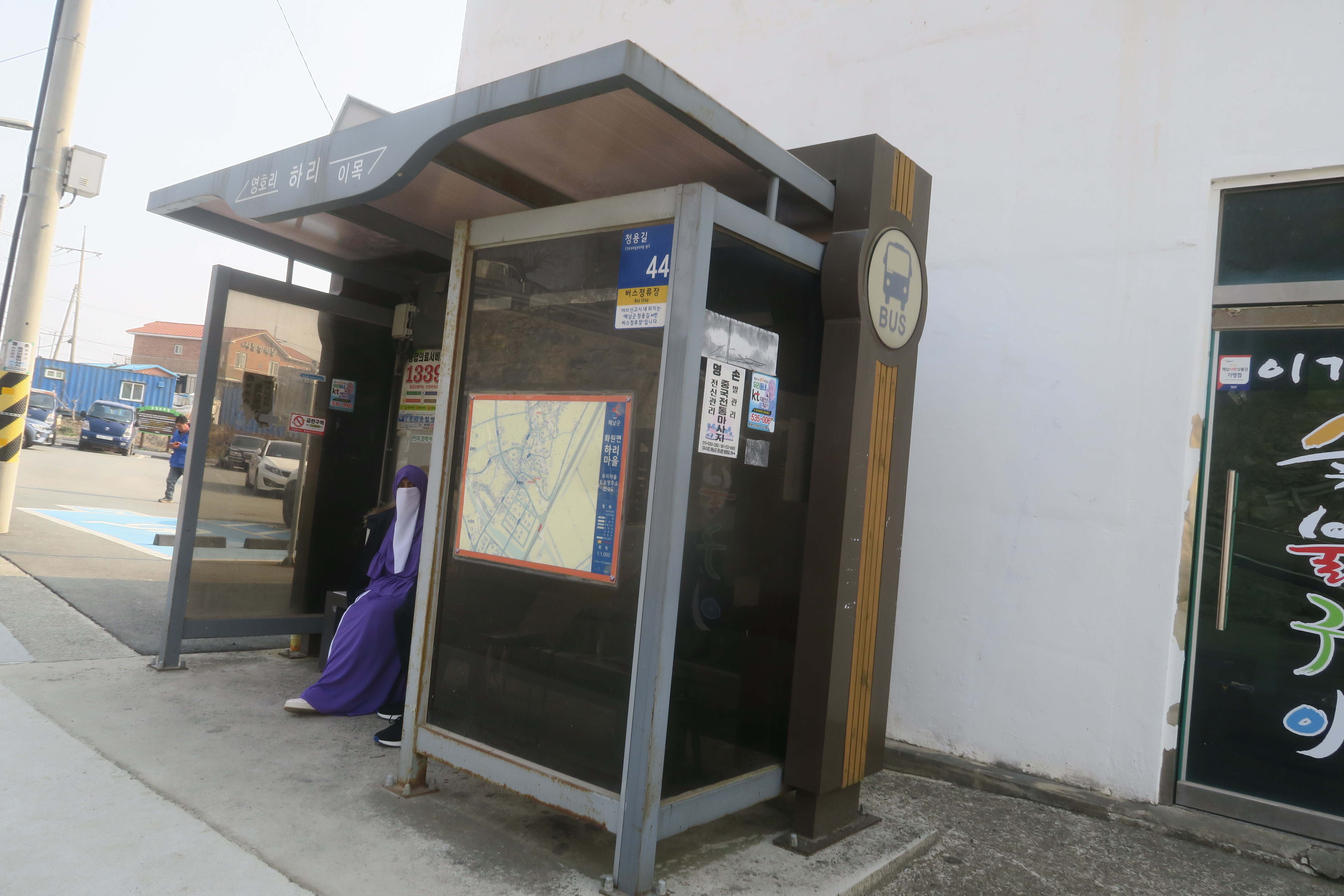 화원면 하리 버스정류장에 도착하여 버스 시간을 확인하니