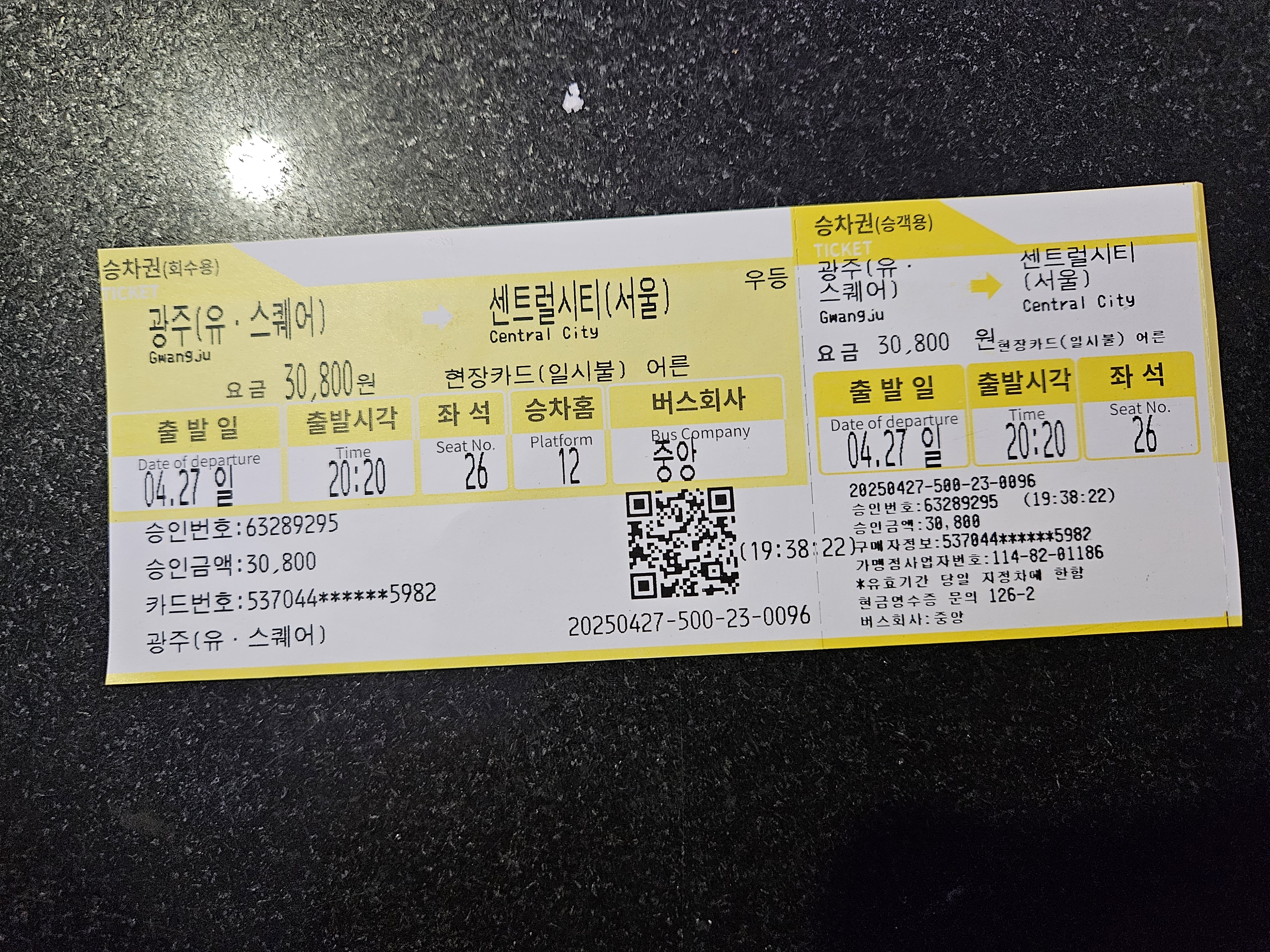 광주발 → 서울행 버스표