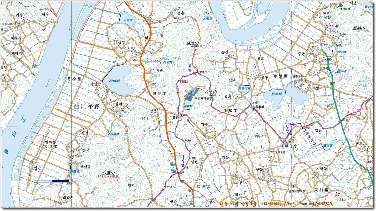 두류산(106m), 고문산(103.5m), 옥룡산(玉龍山:132.9m)을 지나며 삼포천의 좌측(북측)