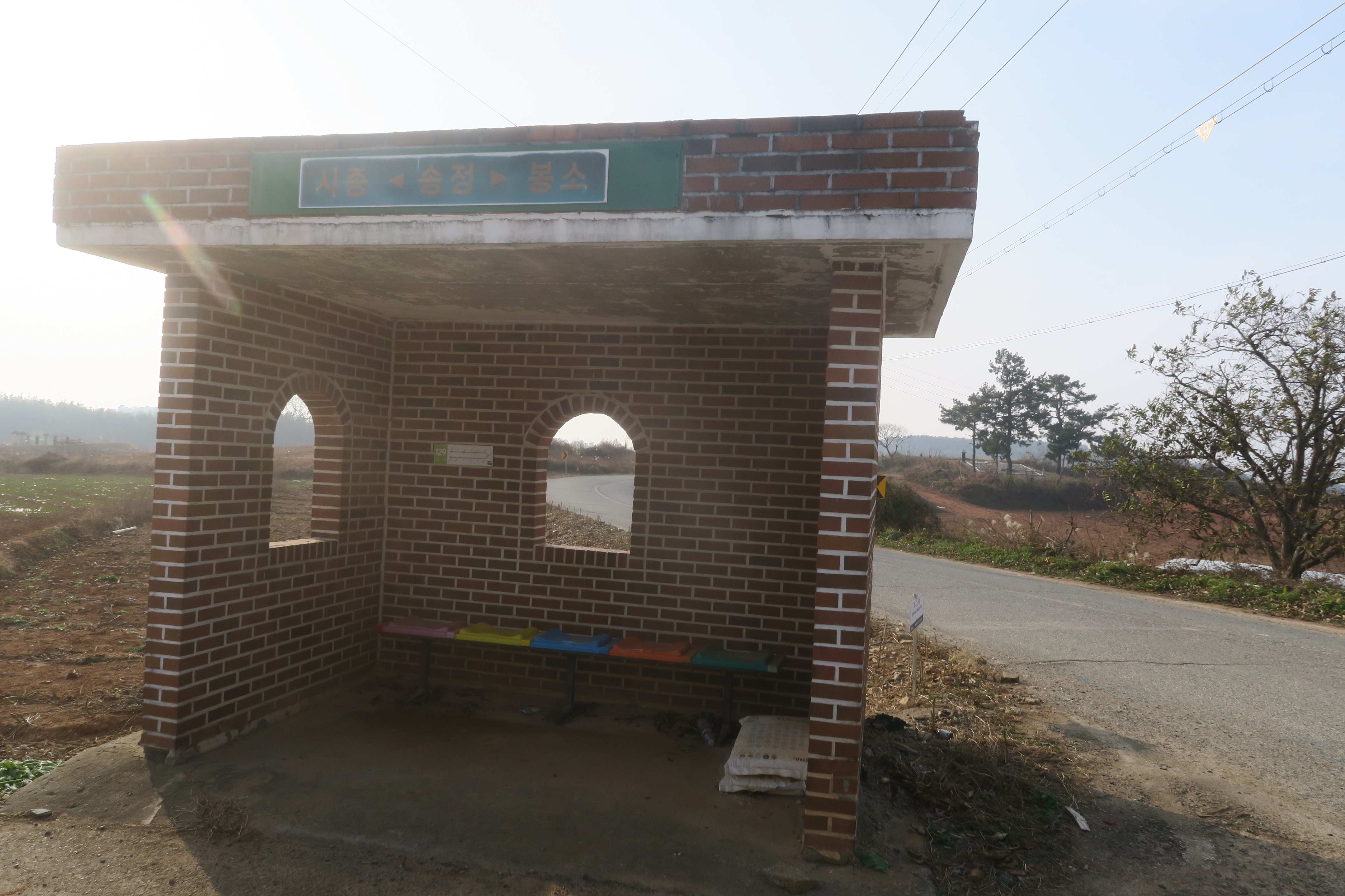 버스정류장에 버스가 오기를 기다린다